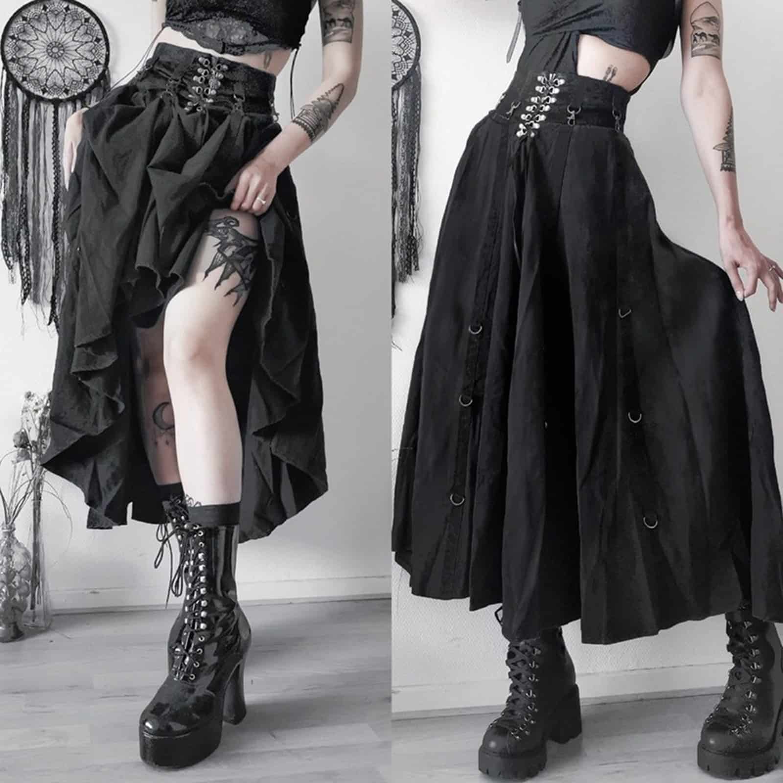 Floor-length gothic skirt with a fixed waistband and zipper at the back.