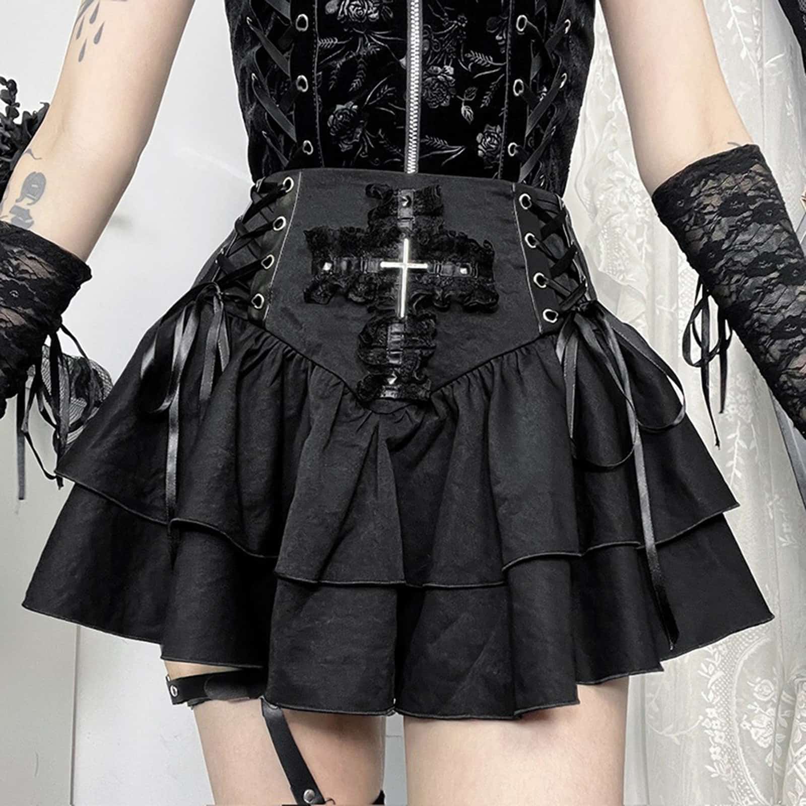Dieser Rock ist eine Hommage an viktorianische Eleganz gepaart mit düsterem Gothic-Charme. Der hochgeschnittene Bund formt eine schmeichelhafte Silhouette und wird durch seitliche Schnürungen im Korsett-Stil veredelt. Das zentrale Highlight ist ein aufwendig verziertes Kreuz aus Spitze und Satin, geschmückt mit einem silberfarbenen Kreuz-Anhänger – ein ausdrucksstarkes Symbol für spirituelle Rebellion.