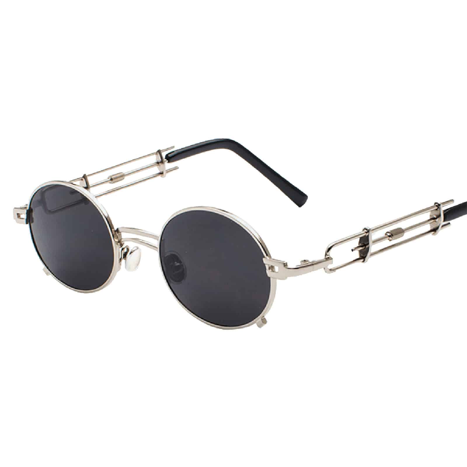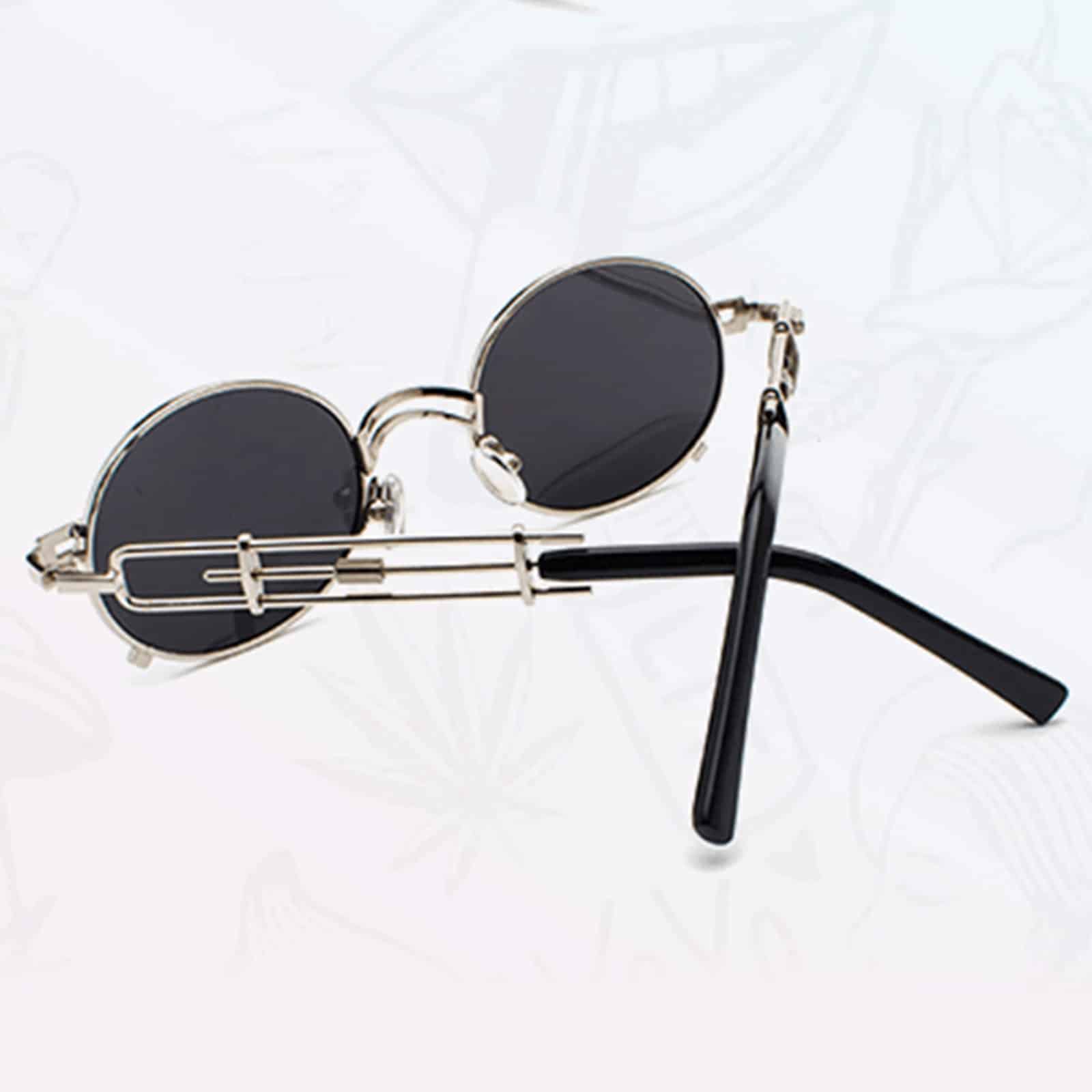 Außergewöhnliche Sonnenbrille in schwarz/silberner Optik mit Bügeln im Retro-Look und schwarzen, leicht ovalen Glästern.
