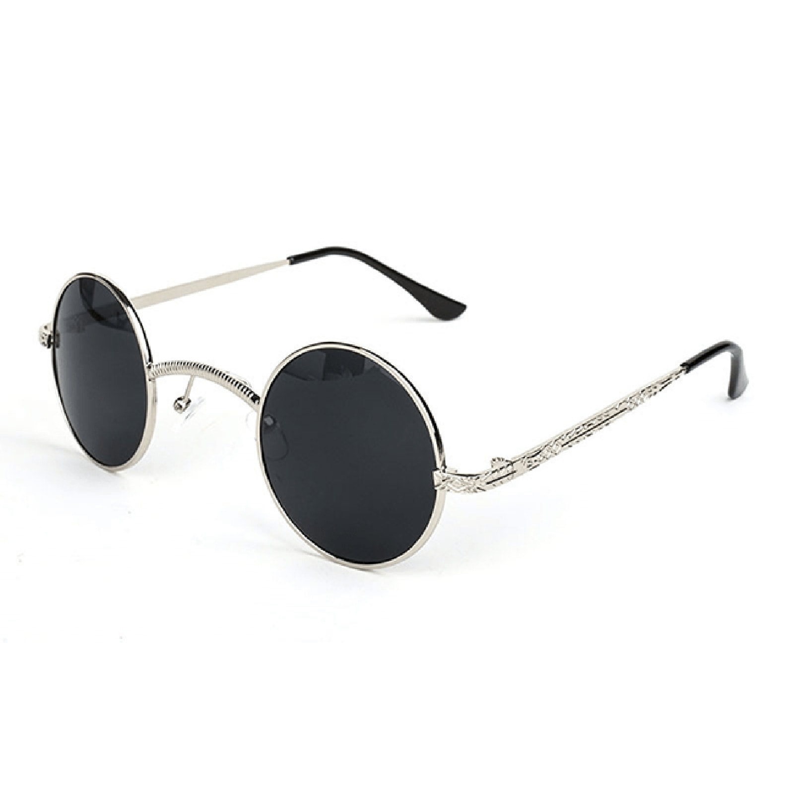 Außergewöhnliche Sonnenbrille in schwarz/silberner Optik mit silbernen Bügeln im Retro-Look und schwarzen, leicht ovalen Glästern.