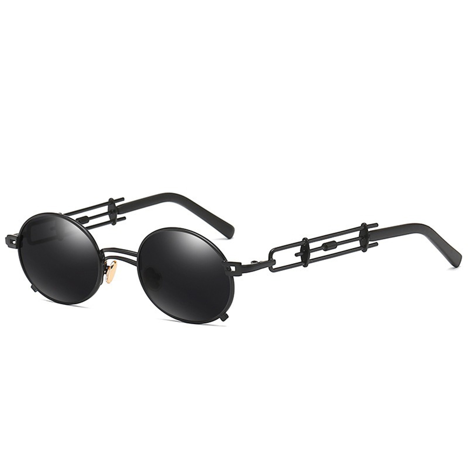 Außergewöhnliche Sonnenbrille in schwarzer Optik mit Bügeln im Retro-Look und schwarzen, leicht ovalen Glästern.