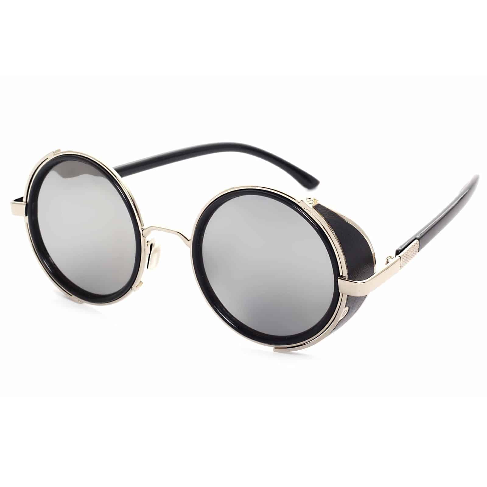 Außergewöhnliche Sonnenbrille mit Vollrand und seitlichem Blendschutz. Mit filigranen schwarzen Bügeln und silbernen, erspiegelten Gläsern.