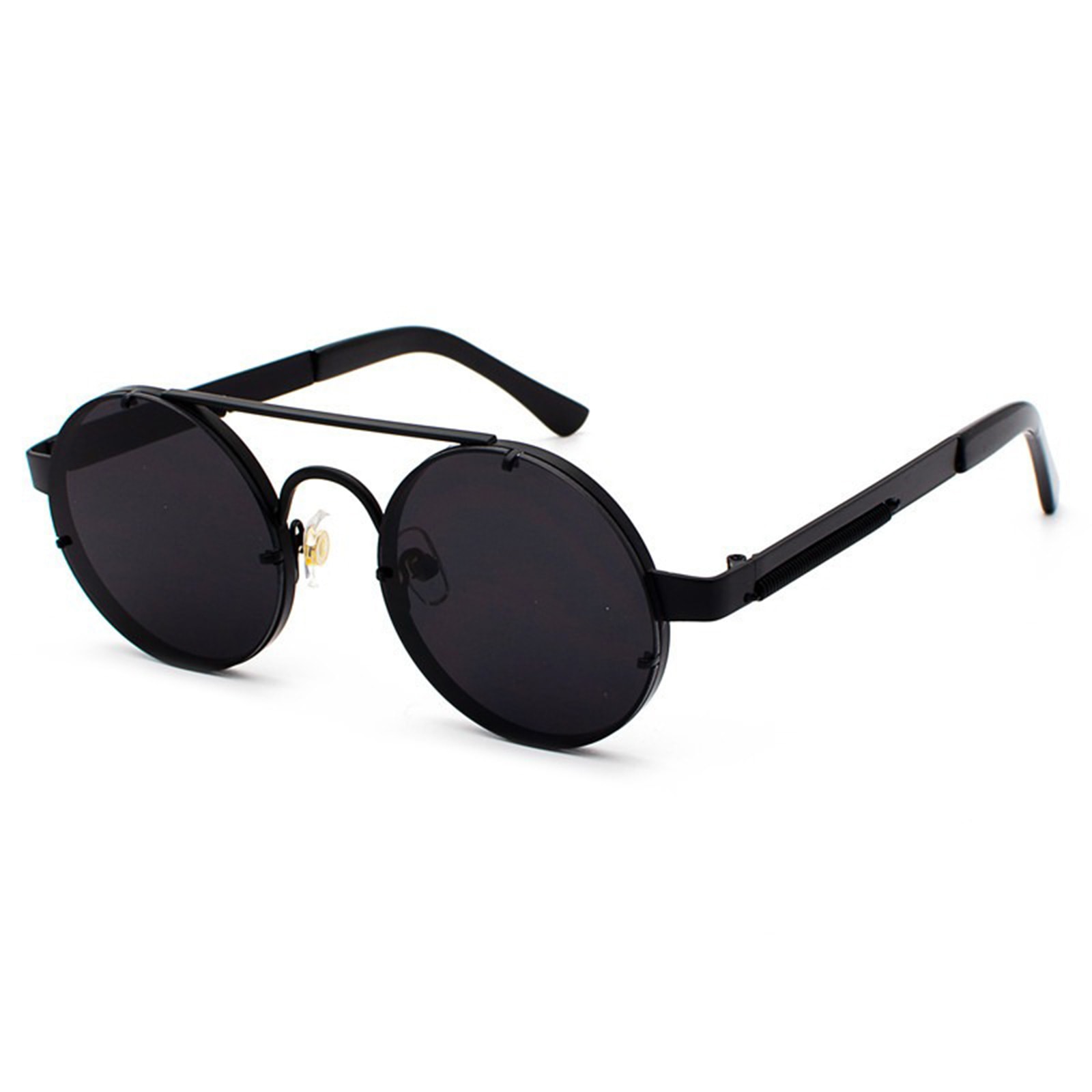 Außergewöhnliche Sonnenbrille in schwarzer Optik mit Bügeln im Retro-Look und runden, schwarzen Gläsern.