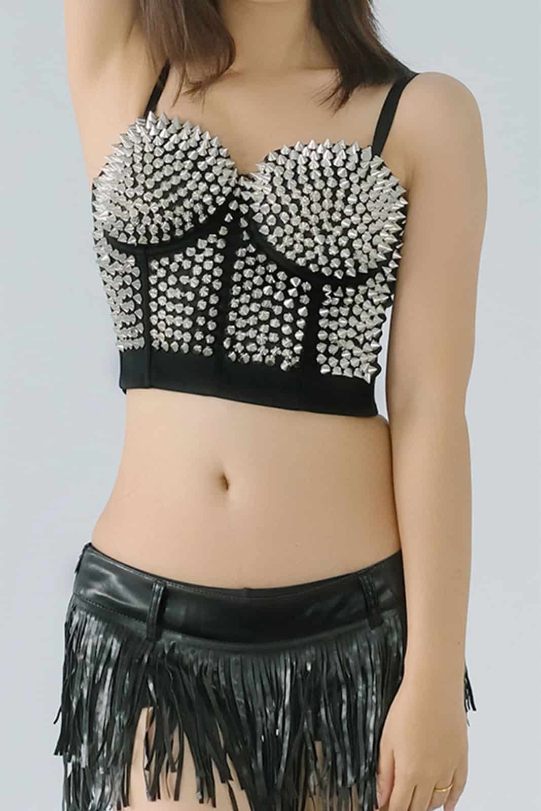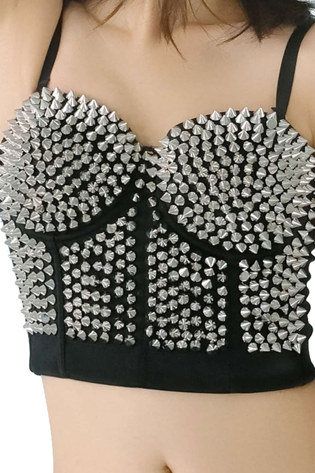 Dieses BH-Top ist ein echter Blickfang – sinnlich, rebellisch und kompromisslos edgy. Die Cups sind üppig mit glänzenden, silbernen Kunststoff-Spitznieten besetzt, die je nach Lichteinfall ein kraftvolles Spiel aus Glanz und Schatten erzeugen. Die spitzen Details verleihen dem Top eine provokante, selbstbewusste Ästhetik im Stil der Gothic- oder Fetish-Mode. Dank der klassischen Haken- und Ösen-Verschlüsse auf der Rückseite sitzt das Top sicher und formschön. Ideal für gewagte Cluboutfits, Bühnenauftritte oder mutige Fashion-Statements.