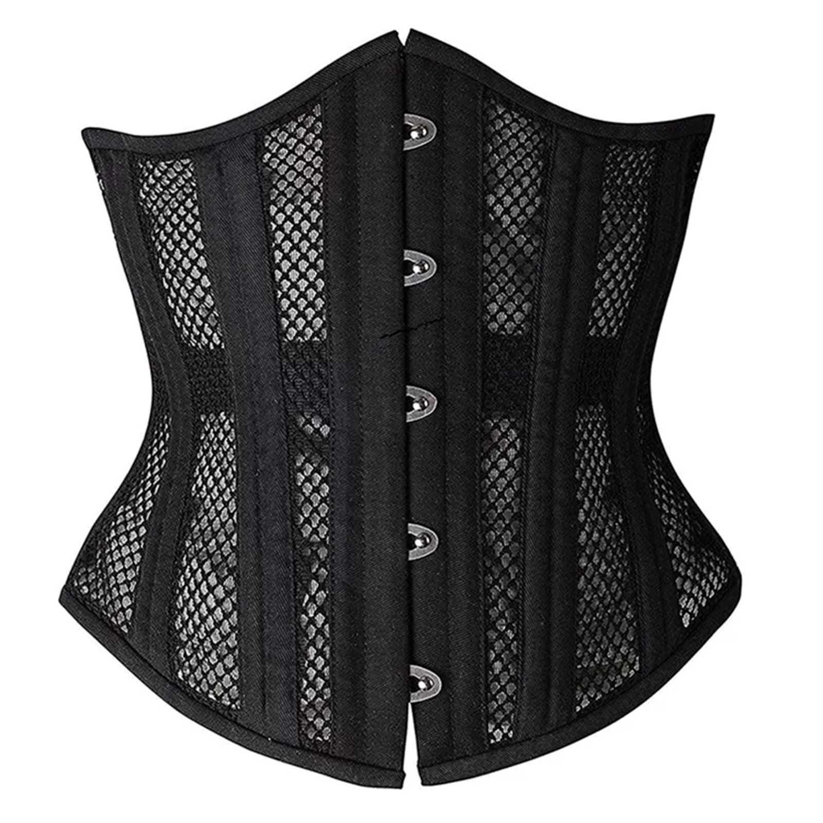 Seductive underbust corset with plastic bones, back lacing and hook fastener. The integrated mesh material is lightly lined and somewhat transparent. Can be combined in a variety of ways.