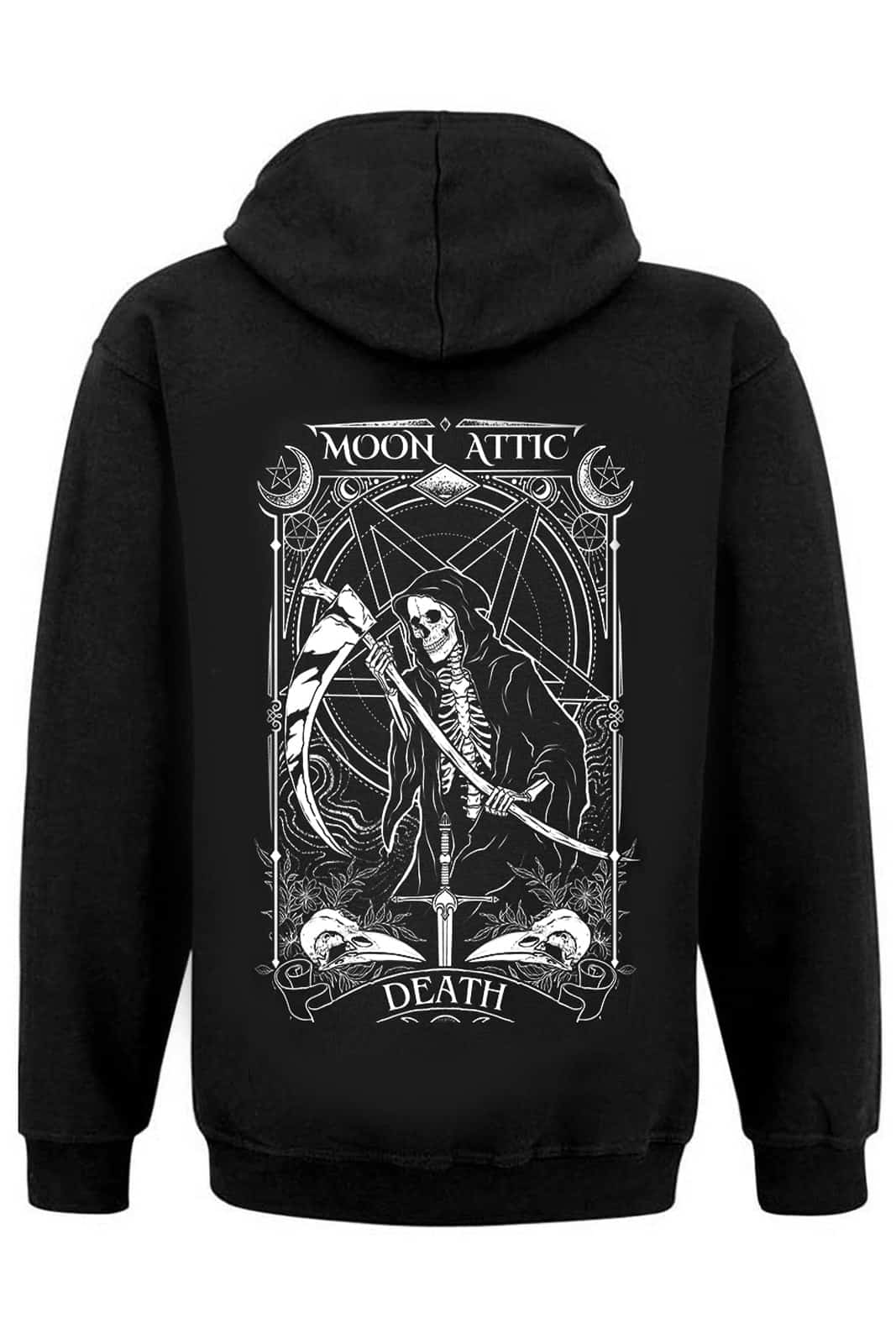 Das Motiv Death ist von düsterer Tarot- und Okkultsymbolik inspiriert und zeigt eine mystische Sensenfigur, umgeben von Pentagramm, Mondsicheln und feinen ornamentalen Linien. Totenschädel, rituelle Symbole und die kontrastreiche Schwarz-Weiß-Illustration verleihen dem Design eine zeitlose, finstere Eleganz – wie eine makabre Tarotkarte zum Anziehen, perfekt für Liebhaber von Dark Art, Gothic und okkulter Ästhetik.