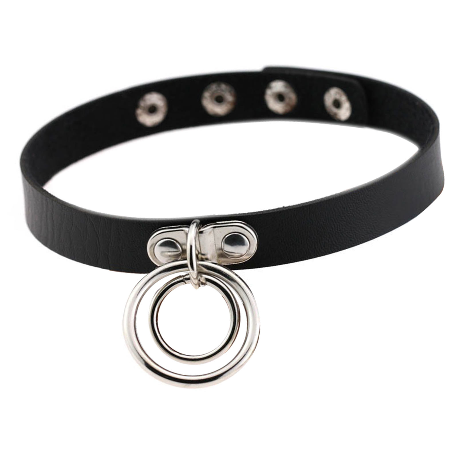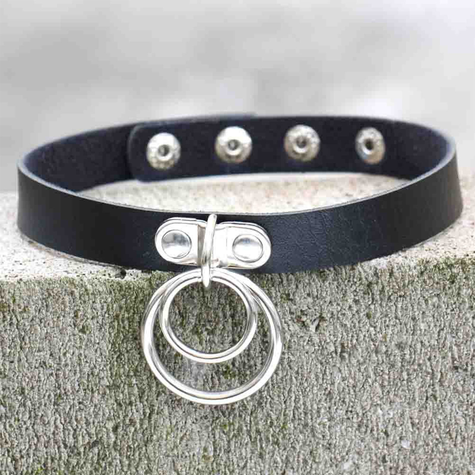 Simple imitation leather goth collar with a double O-ring attached in the middle.