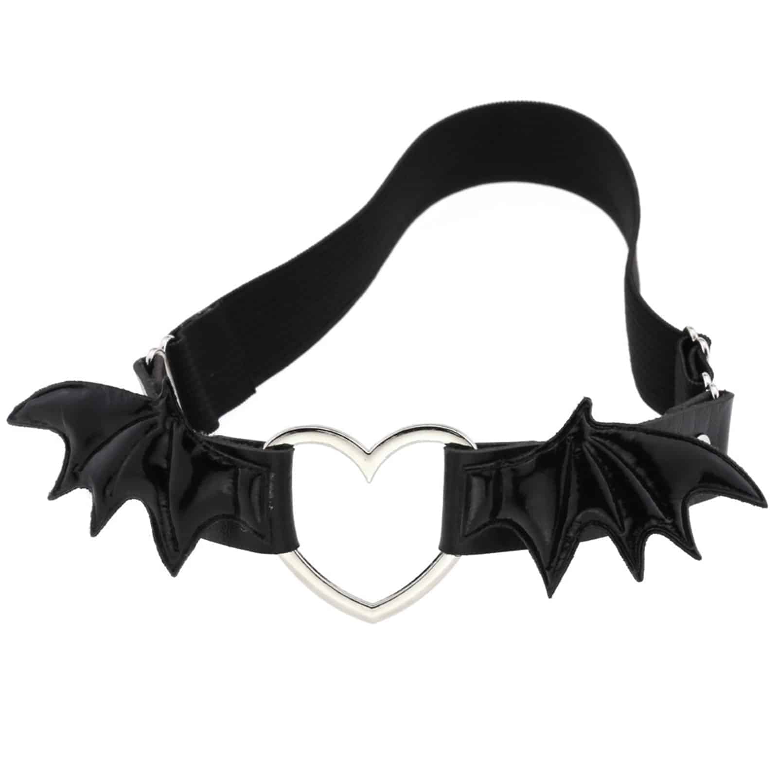 Strumpfband aus Kunstleder mit elastischem Polyesterband auf der Rückseite. Zwei Fledermausflügel sind verbunden durch ein silbernes Herz aus Metall.