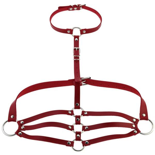 Unisex Harness mit verstellbaren, im Rücken über Kreuz laufende Riemen. Oberhalb der Brust treffen die Riemen Zentral in einem großen silbernen O-Ring aufeinander. Hergestellt aus hochwertigem, veganem Kunstleder.