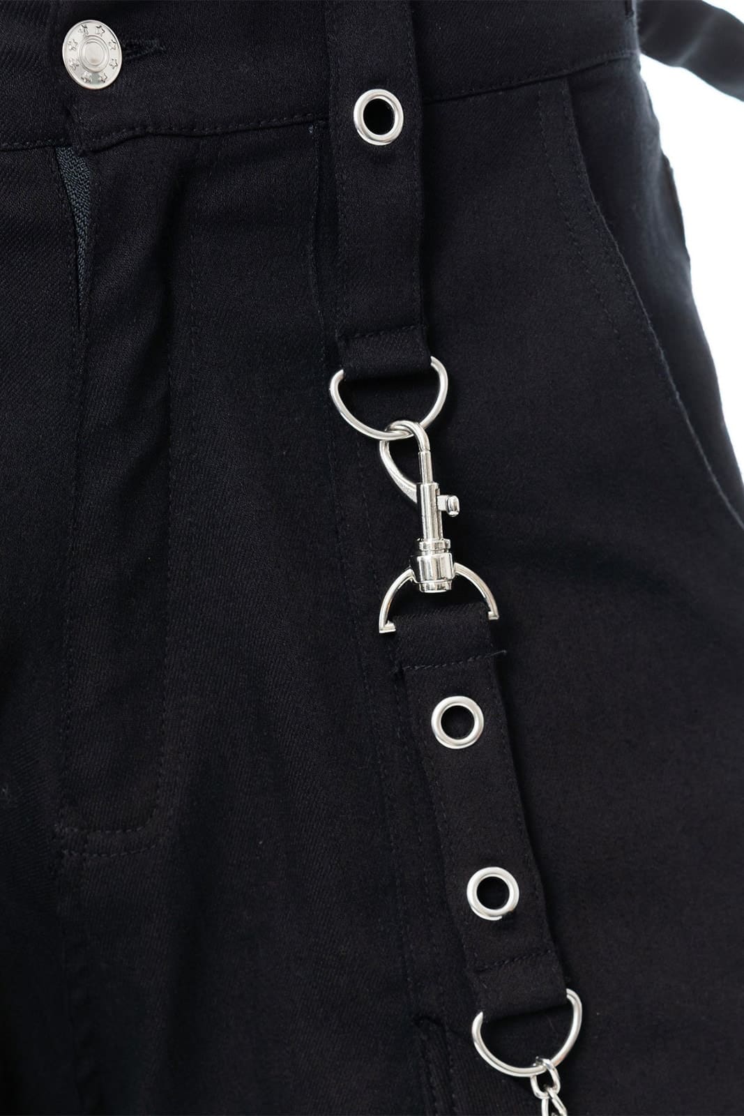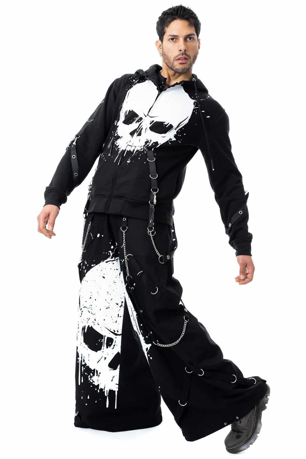 Eine kompromisslose Statement-Hose im Industrial- und Dark-Streetwear-Stil. Der markante Skull-Print auf den Beinen trifft auf eine schwere, robuste Baumwollqualität und wird durch Harness-Gurte, Metallösen und Kettenelemente ergänzt. Der weite Schnitt sorgt für Tragekomfort, während die vielen Details der Hose ihren rauen, rebellischen Charakter verleihen – perfekt für auffällige Alternative-, Gothic- und Techwear-Looks.