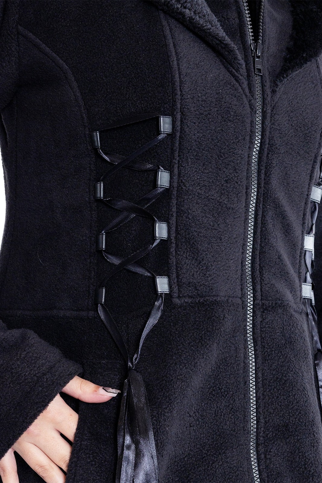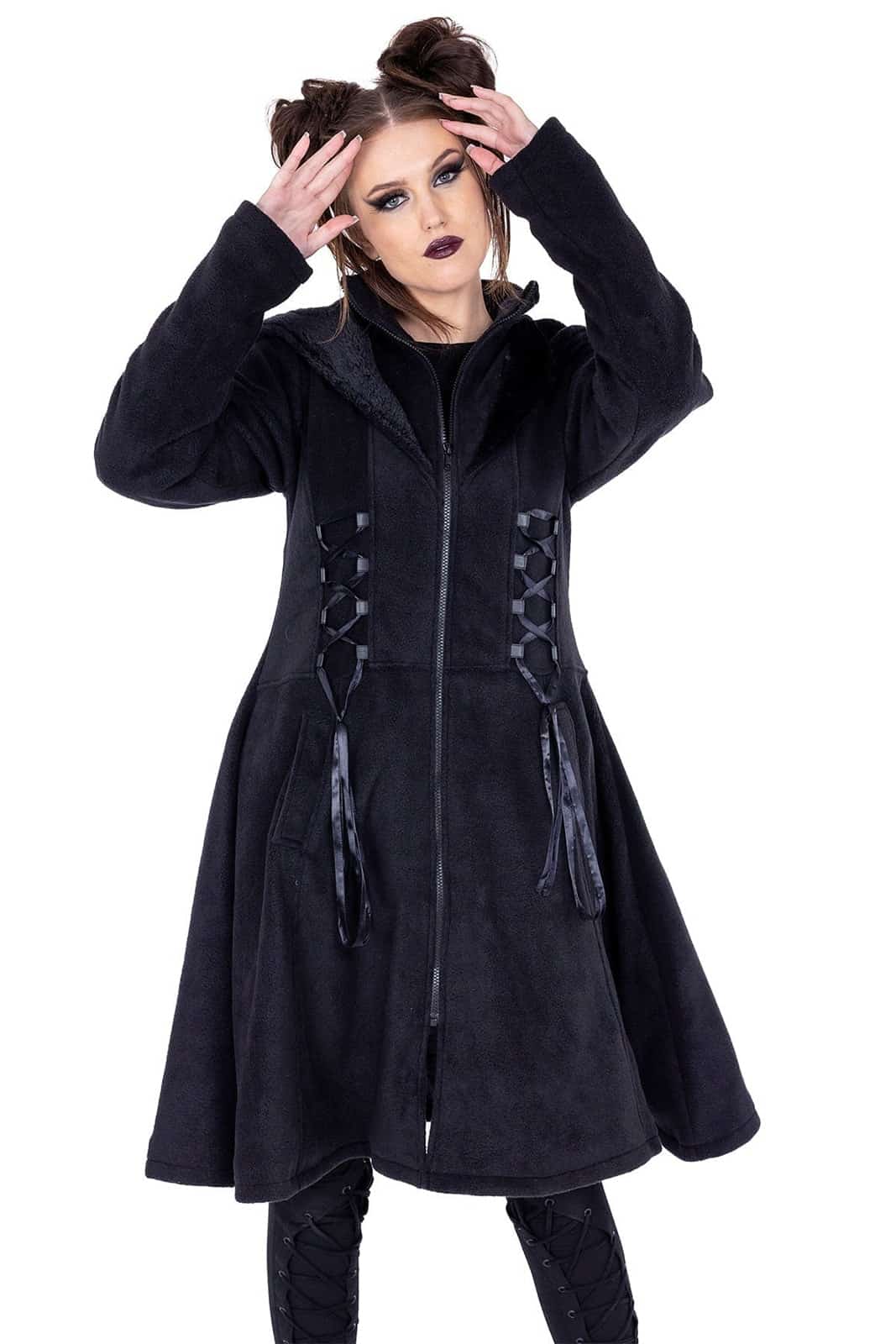 Dieser schwarze Mantel verbindet kuschelige Wärme mit düsterer Eleganz. Gefertigt aus weichem Fleece sorgt er für hohen Tragekomfort, während die große Kapuze und das taillierte Design eine feminine Silhouette unterstreichen. Seitliche Schnürdetails mit Satinbändern verleihen dem Modell einen romantisch-gotischen Touch. Praktische Reißverschlussfront und dezente Taschen machen ihn zum perfekten Begleiter für kalte Tage – ob Alltag, Festival oder Spaziergang im Mondschein.