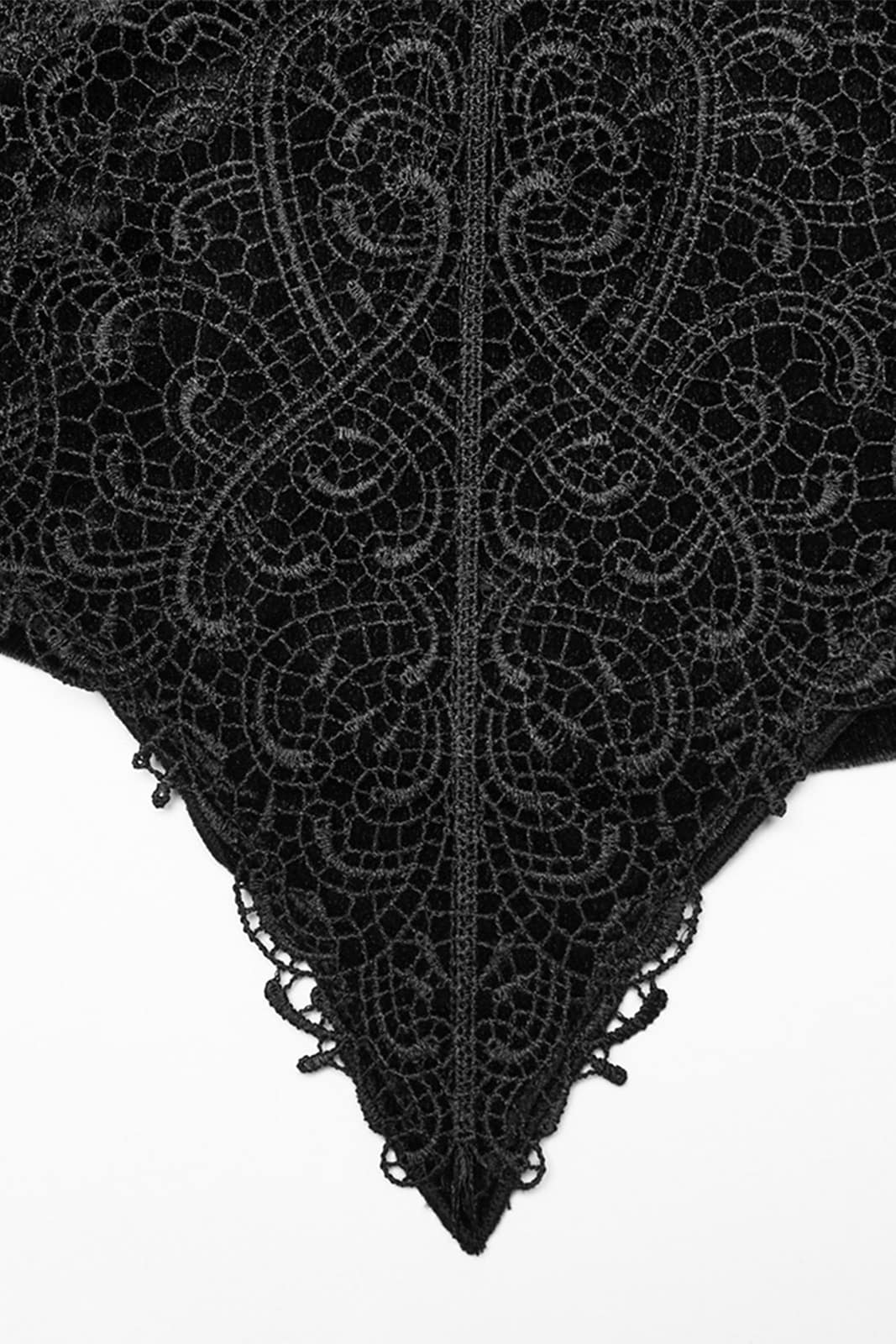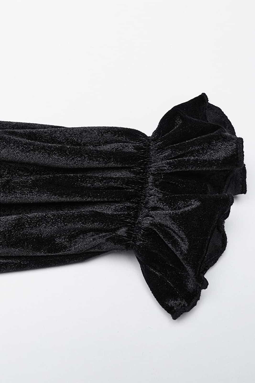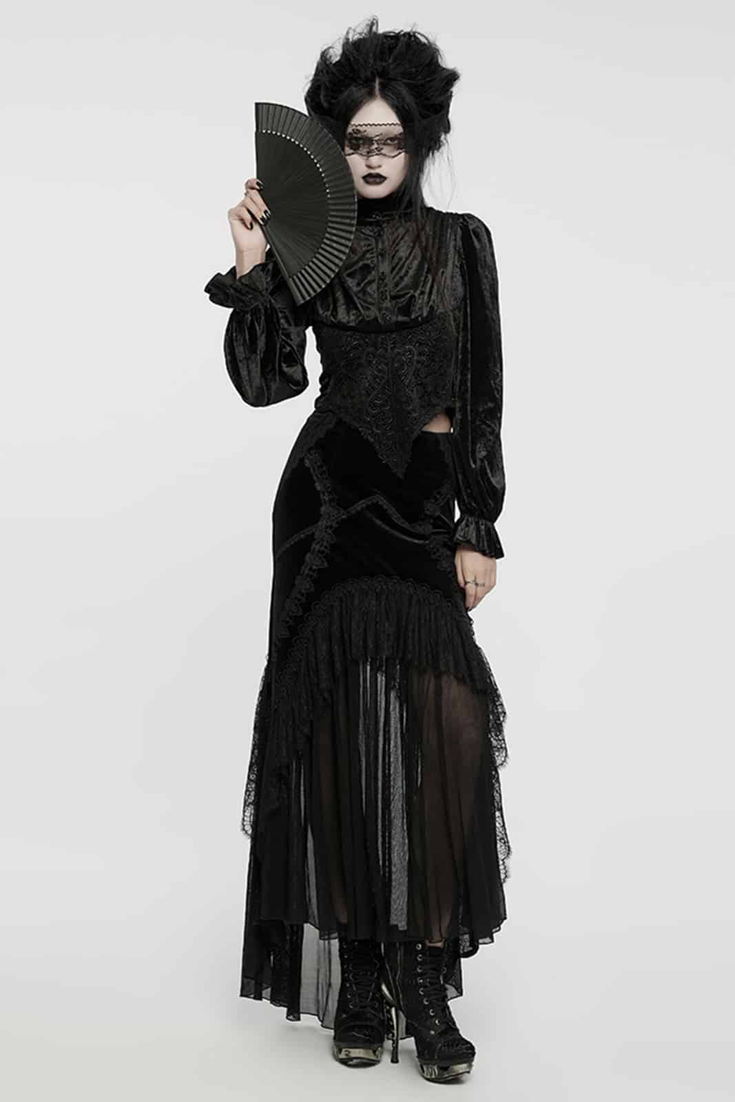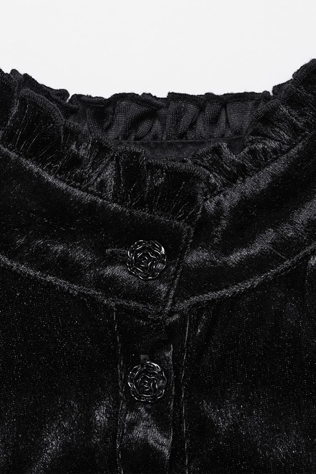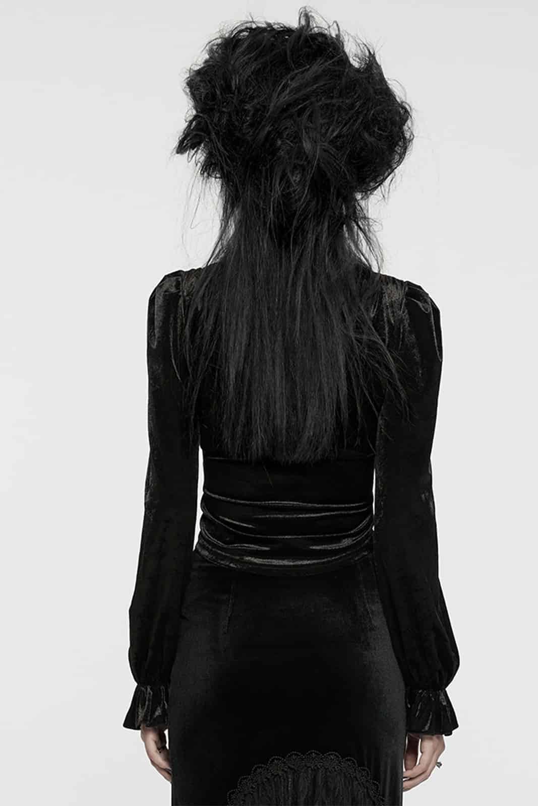 Diese viktorianisch inspirierte Gothic-Bluse vereint dramatische Eleganz mit tragbarem Komfort. Der weich fallende, elastische Samt schmiegt sich figurbetont an, während geraffte Schultern, lange Ärmel mit Rüschenbündchen und der hohe Stehkragen eine theatralische Silhouette erzeugen. Zarte Rosenknöpfe, feine Raffungen im Brustbereich und eine aufwendig bestickte Applikation in der Taille verleihen dem Design seine edle, düster-romantische Ausstrahlung.