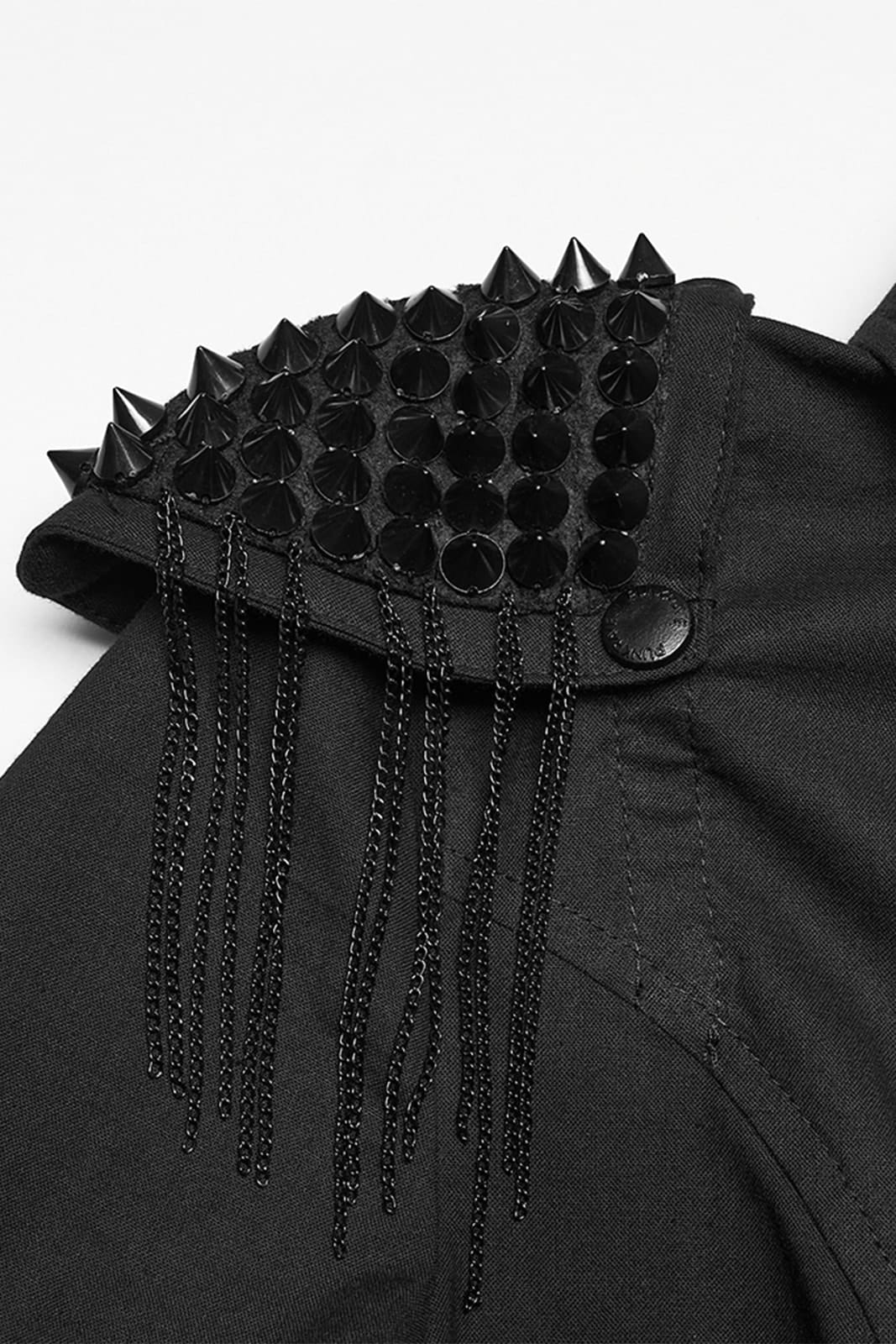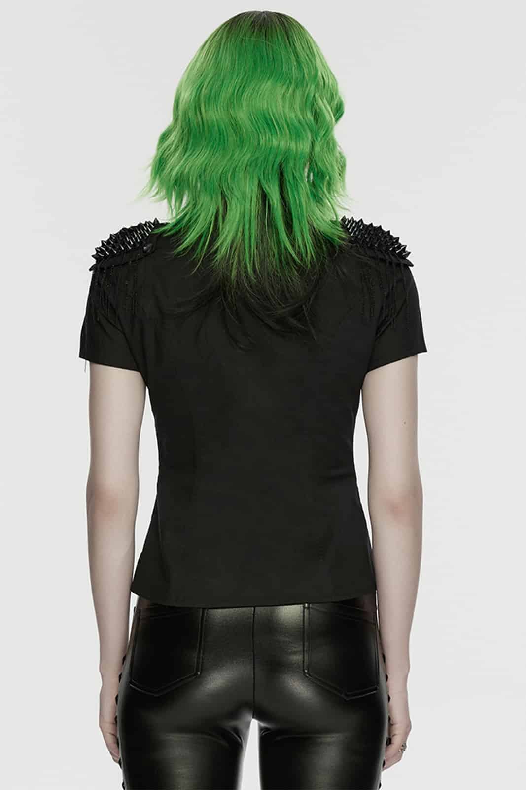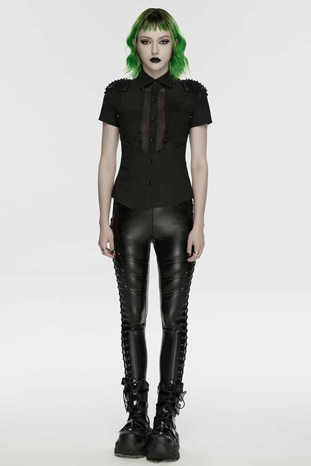 Streng, rebellisch und mit klarer Attitüde: Das „Mistress Mayhem“ Shirt vereint klassische Linien mit kompromisslosen Punk-Details. Der taillierte Schnitt betont die Silhouette, während der Mesh-Einsatz im Brustbereich einen subtilen, edgy Kontrast schafft. Die mit Nieten besetzten Epauletten samt herabhängenden Ketten setzen ein starkes Statement und verleihen dem Look eine militärisch-düstere Note – perfekt für markante Gothic- und Punk-Outfits.