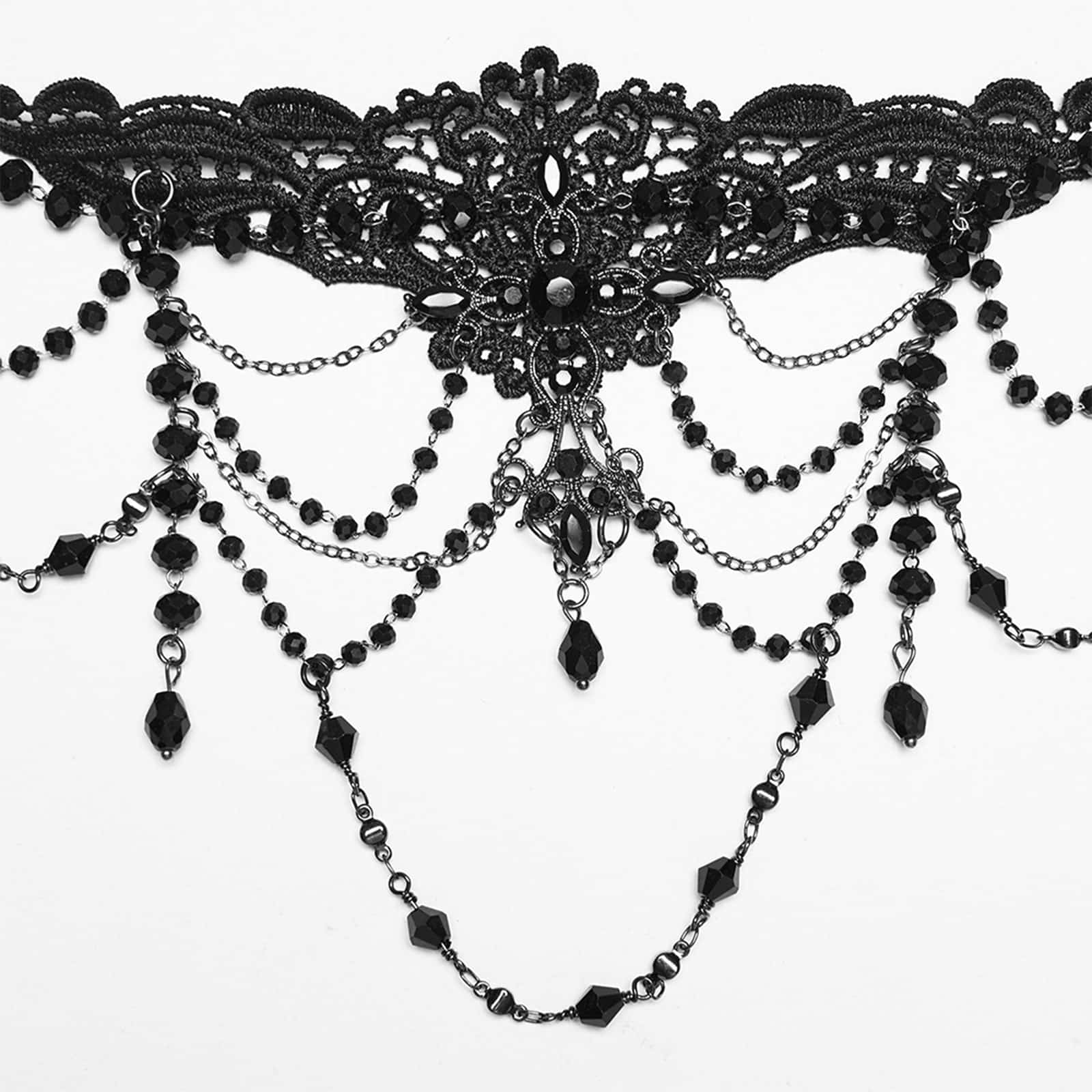 Filigran, mystisch und voller dunkler Eleganz – der „Mystheria Lace Choker“ legt sich wie ein kunstvolles Ornament um deinen Hals. Zarte Spitze trifft auf schimmernde Details und schafft einen ausdrucksstarken Gothic Look mit viktorianischem Flair.