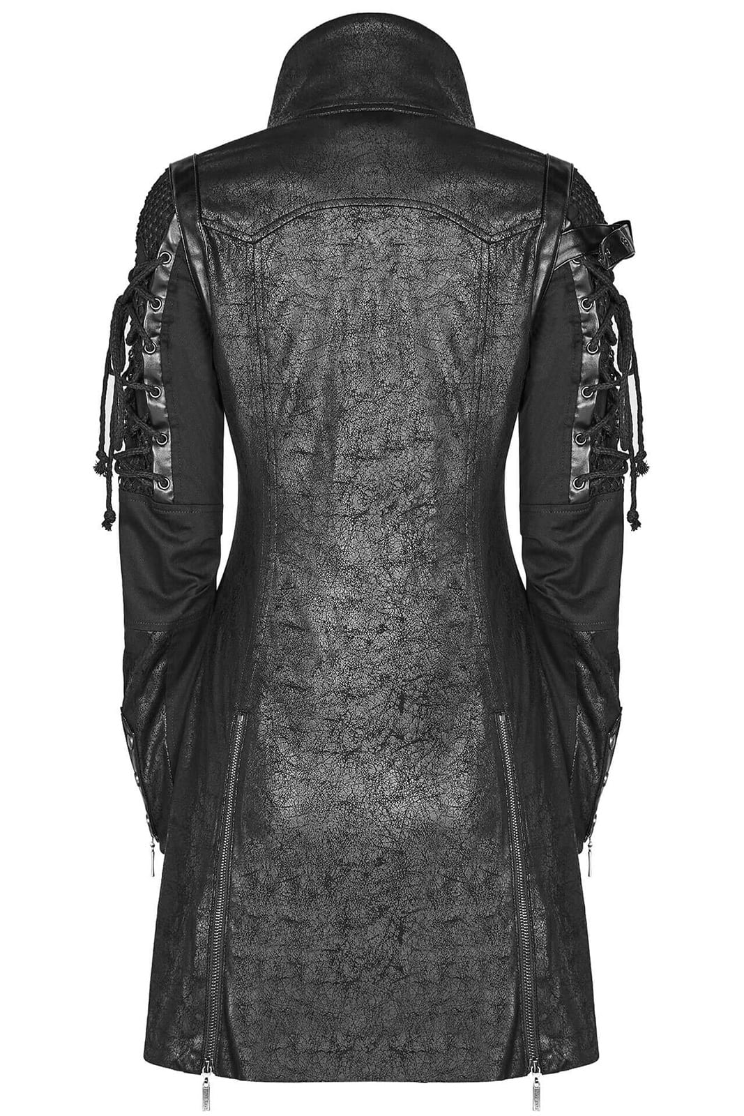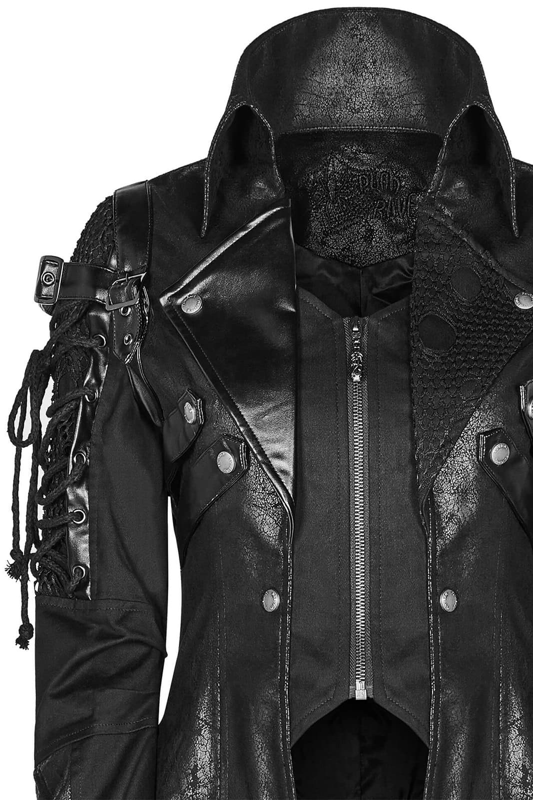 Apokalyptische Damenjacke aus hochwertigem Polyestergewebe mit auffälliger Lederstruktur und Etails aus veganem Kunstleder. Gefertigt mit Stehkragen und breitem Revers. Vorn mit durchgehendem Reißverschluß und mit Zierschnürungen an den Ärmeln. Ausgestattet mit zwei Seitentasche. Als Besonderheit wurden anstatt Schlitzen vier Reißverschlüsse verarbeitet. Vollständig gefüttert.