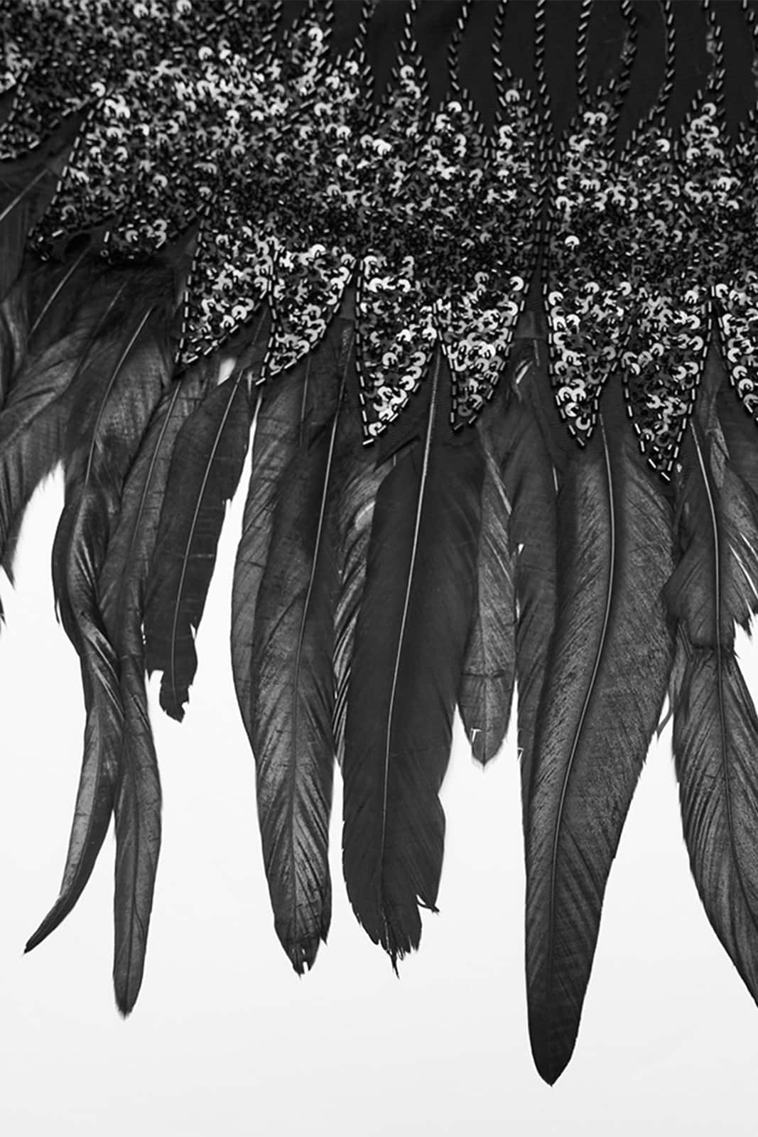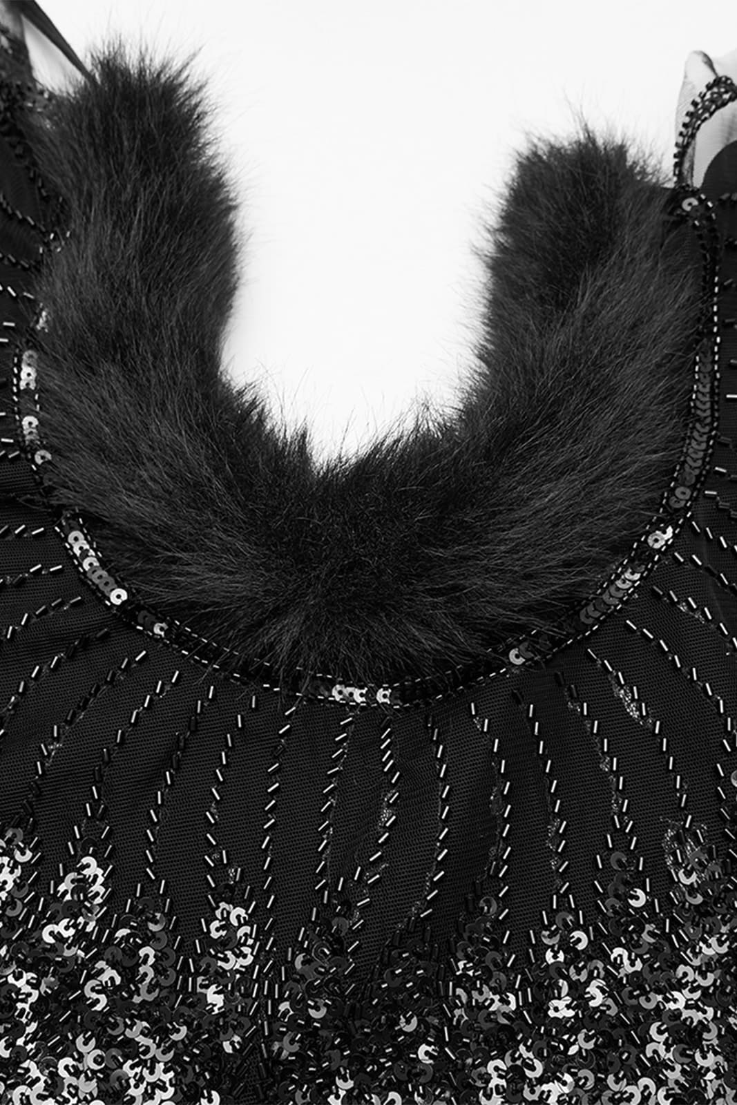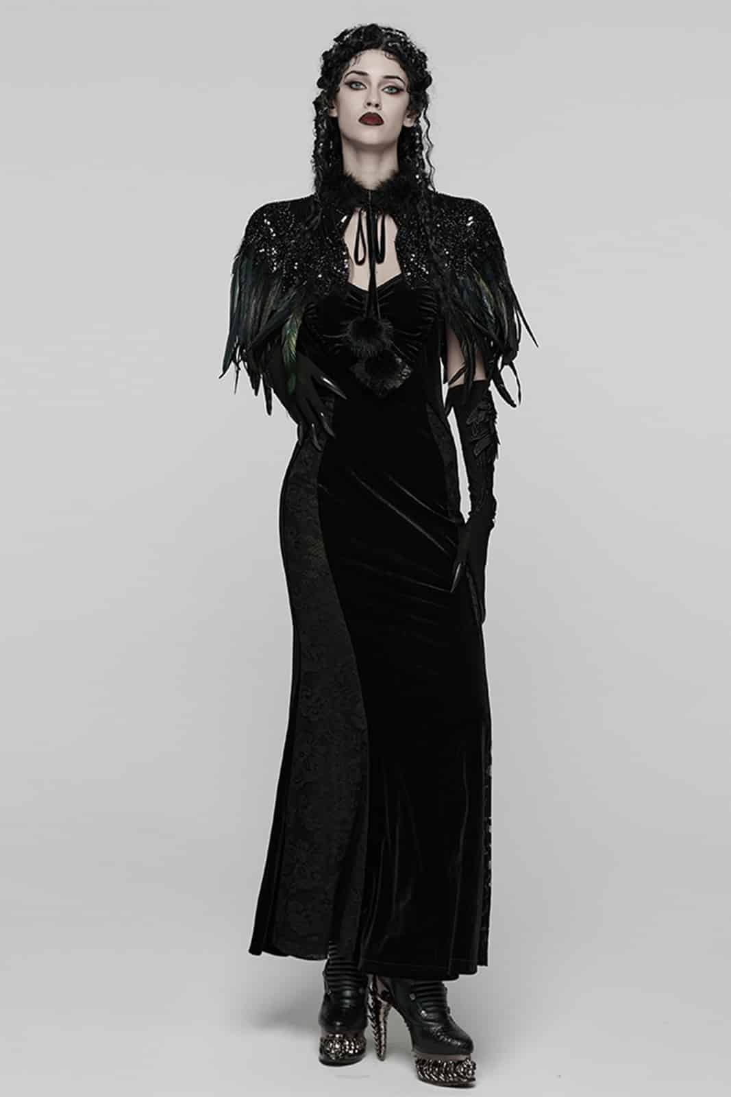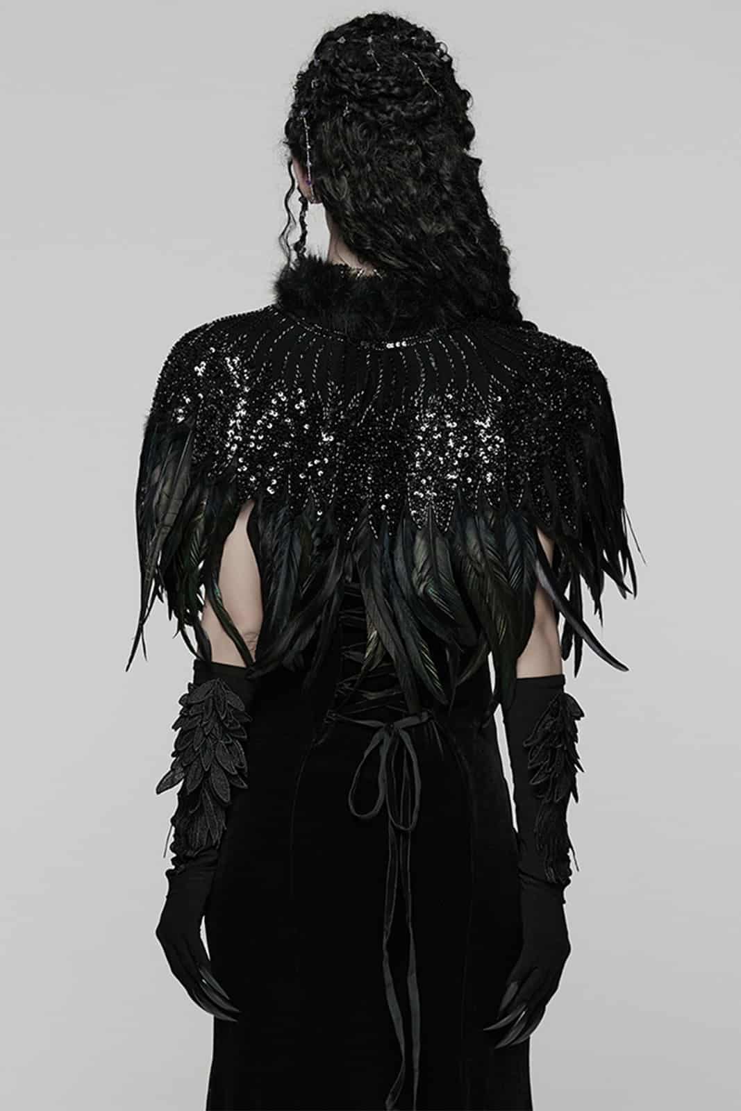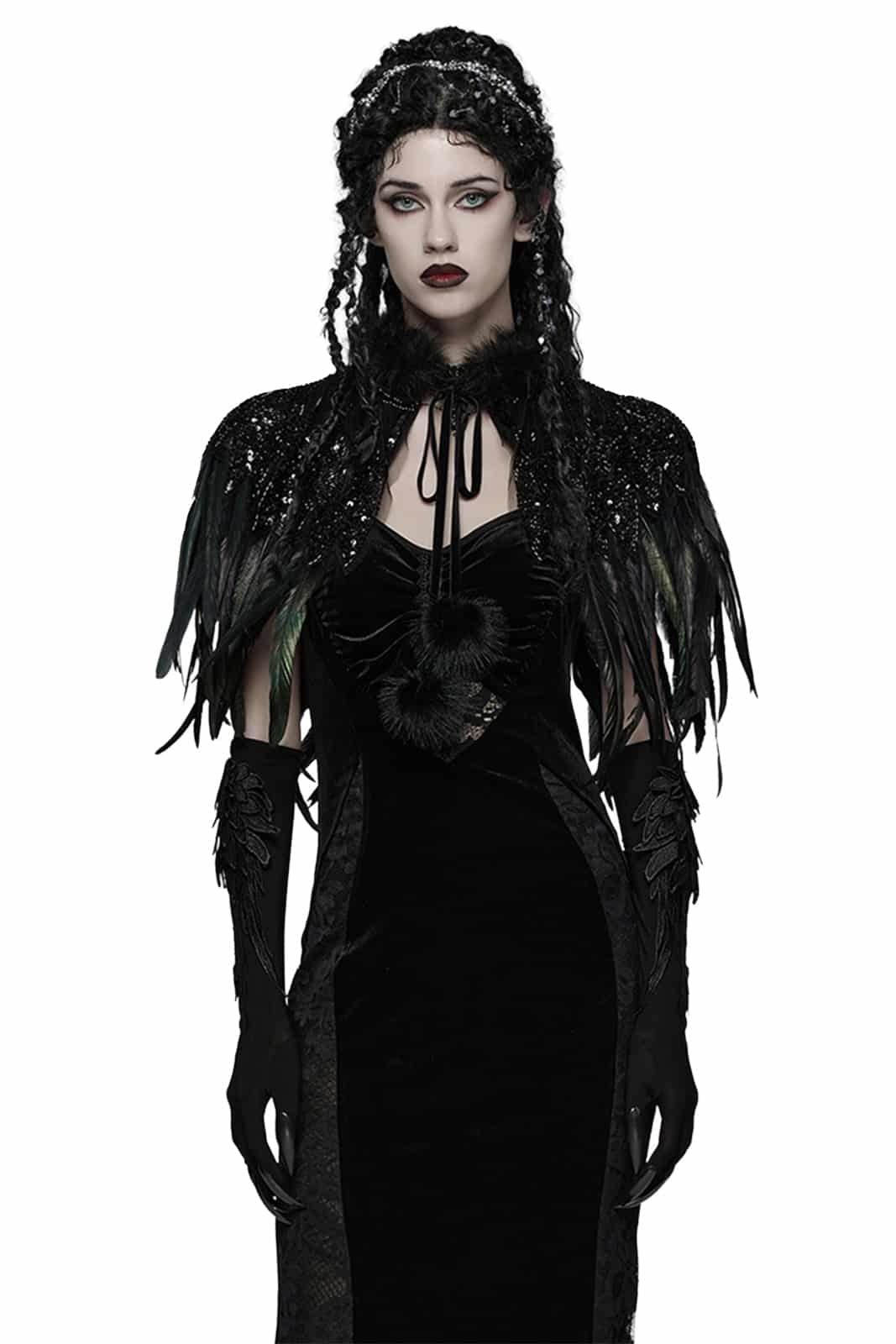 Das Raven Queen Capelet verleiht jedem Outfit eine majestätische, düstere Aura. Die schimmernde Basis aus fein bestickten Pailletten trifft auf tiefschwarze Federn, die dem Design eine dramatische Leichtigkeit verleihen. Der weich eingefasste Kunstfellkragen sorgt für luxuriösen Komfort und rahmt das Dekollete elegant ein. Über eine Bindung am Hals mit dekorativen Kunstfell-Pompons lässt sich das Capelet individuell schließen – ein ausdrucksstarkes Statement für Romantic Gothic, Dark Fantasy und besondere Anlässe.