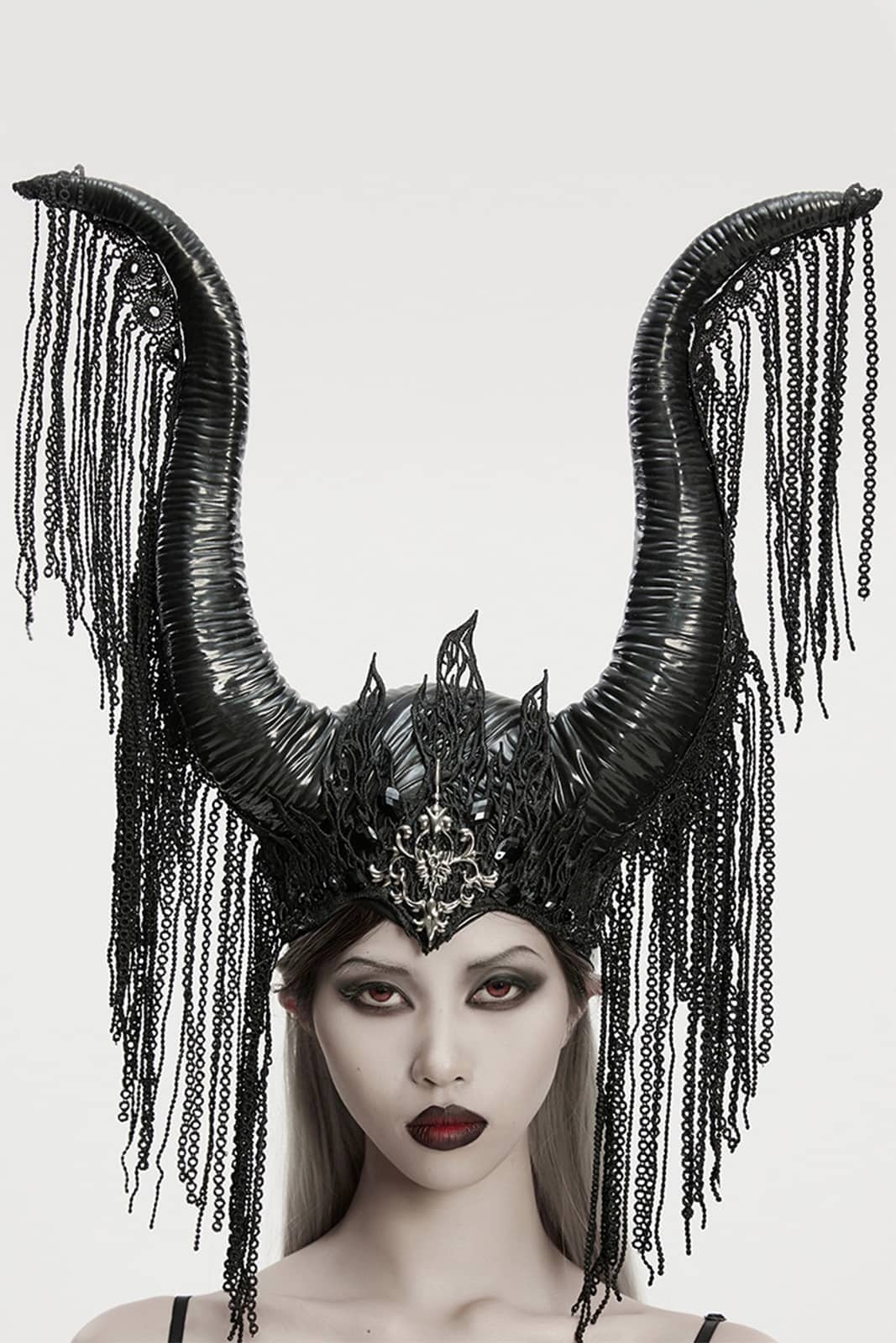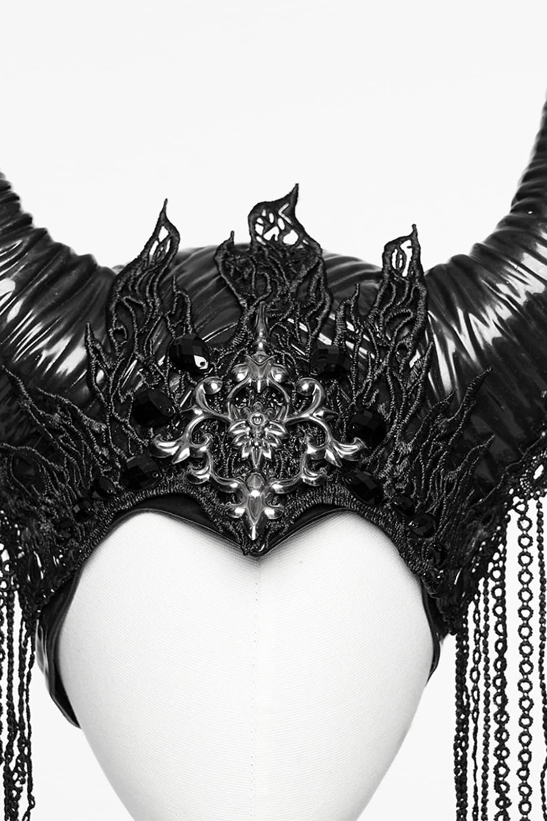 Dieses aufwendig gestaltete Gothic-Fantasy-Headpiece ist ein dramatisches Statement-Piece für Dark-Fantasy-, Ritual-, Cosplay- oder Bühnenlooks. Die markanten, strukturierten Hörner erheben sich kraftvoll vom Kopf und sind mit herabfallenden Spitzenfransen versehen, die Bewegung und Tiefe erzeugen. Die Basis ist als Wickel-Design gearbeitet und formt eine ausgeprägte Widow’s-Peak-Haarlinie für eine düstere, königliche Silhouette. Im Frontbereich sorgt eine flammenartige Spitzenapplikation mit barockem Metallfiligran für einen opulenten, dämonisch-eleganten Akzent. Ideal für Fantasy-Fotografie, Festivals, Performances oder außergewöhnliche Gothic-Outfits.
