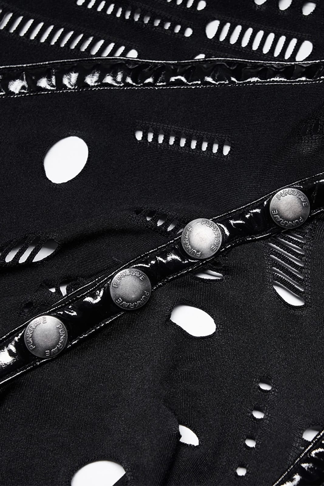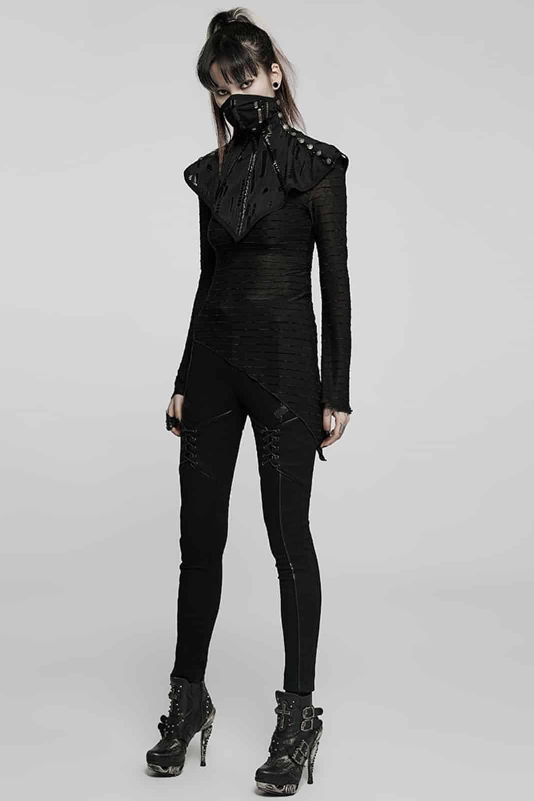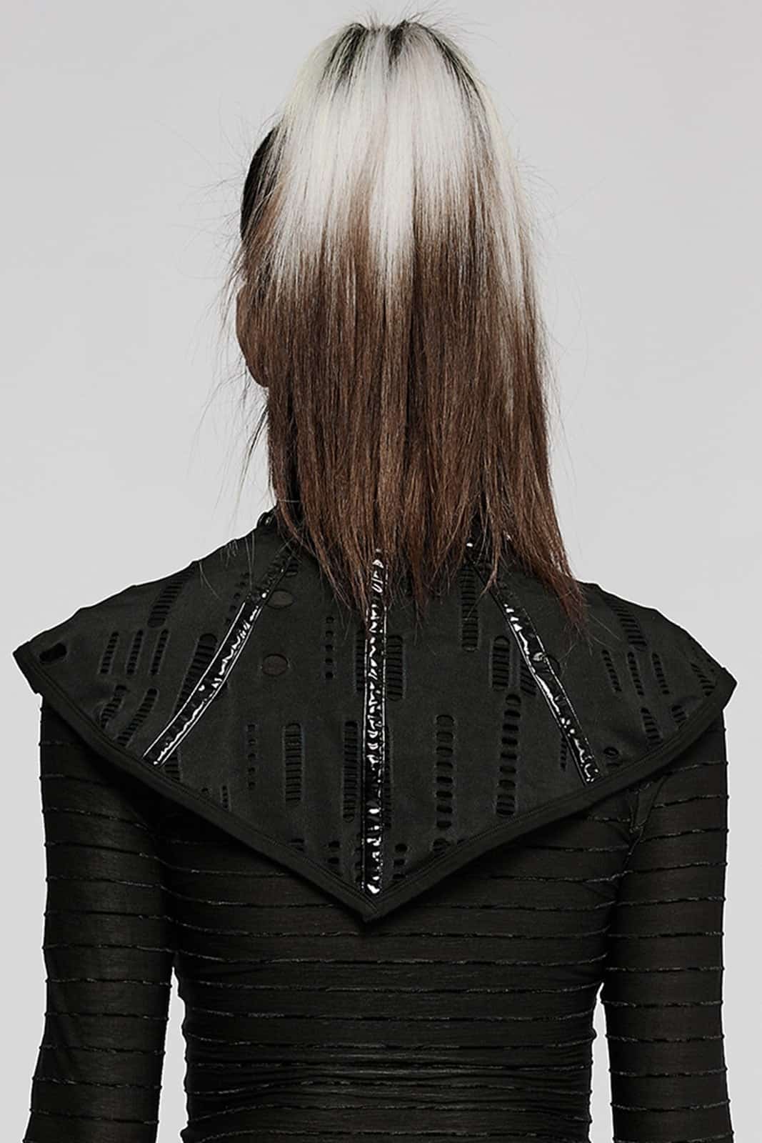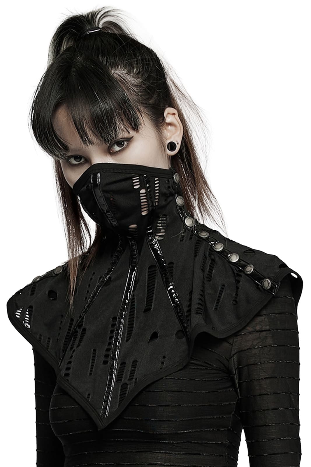 Dieses außergewöhnliche Accessoire im Post-Apocalyptic-Style vereint Maskenelement, Kragen und Korsett-Optik in einem. Das schwarze, distressed Strickmaterial wird durch glänzende PVC-Details betont, während die Schulterpartie mit Druckknöpfen geschlossen wird. Ein düsteres Designstück, das jedem Outfit sofort eine rebellische, futuristische Ausstrahlung verleiht.