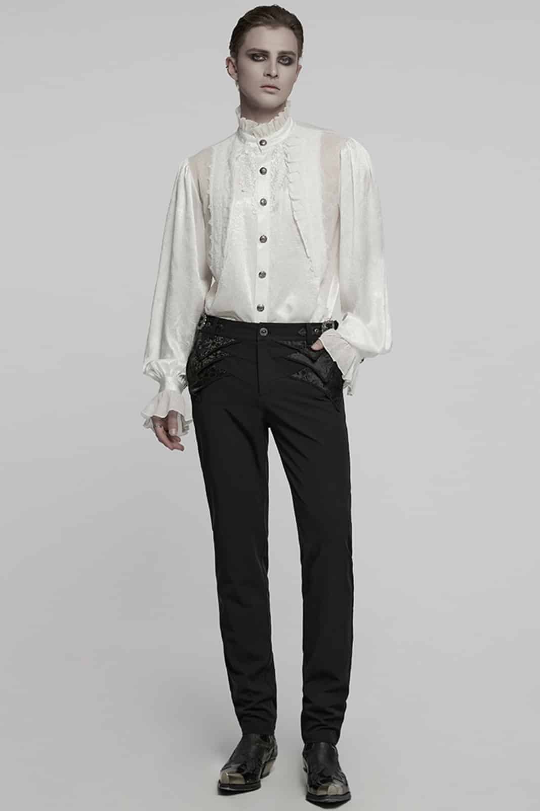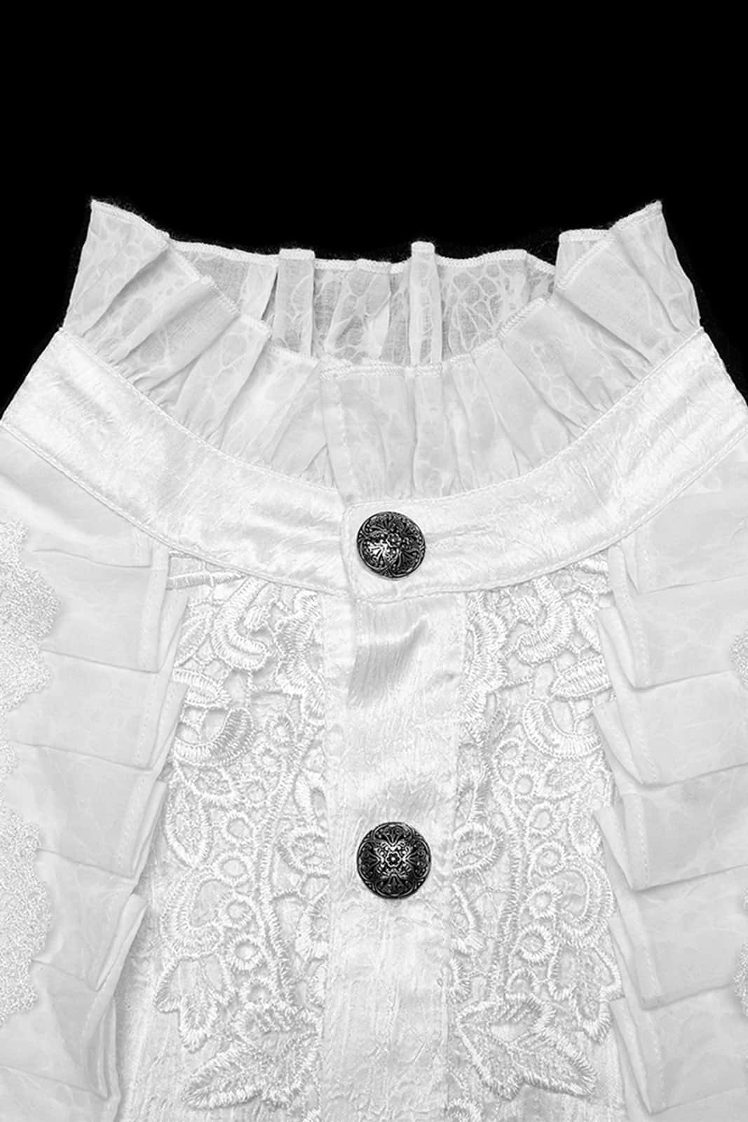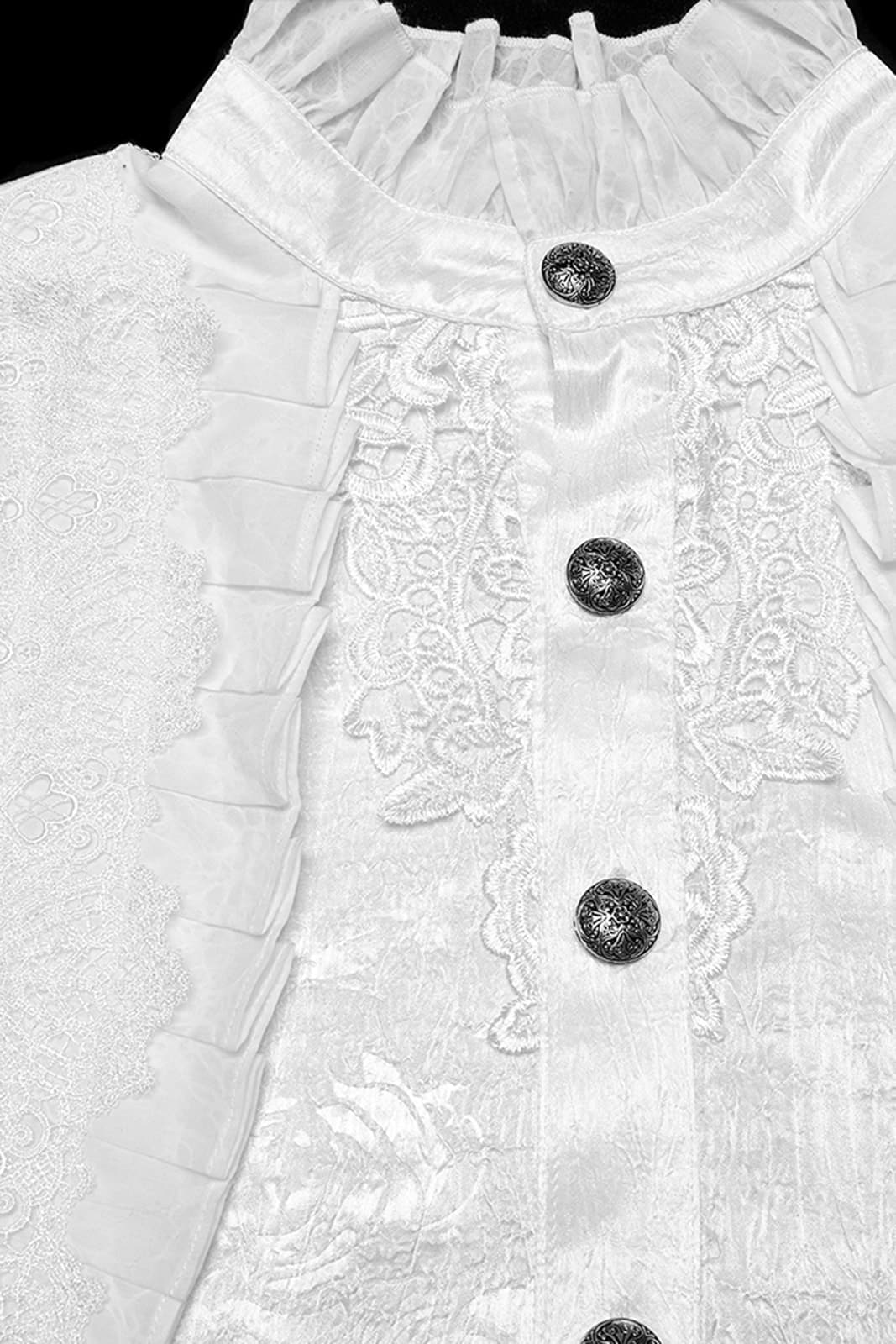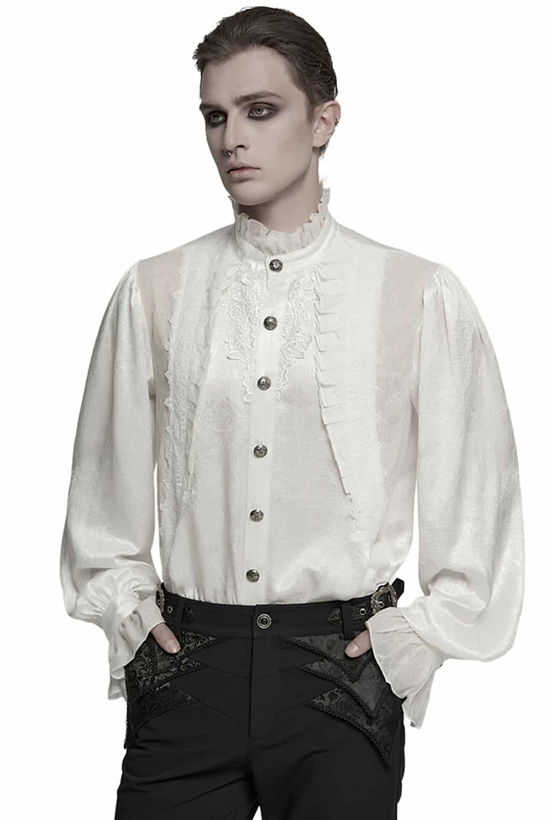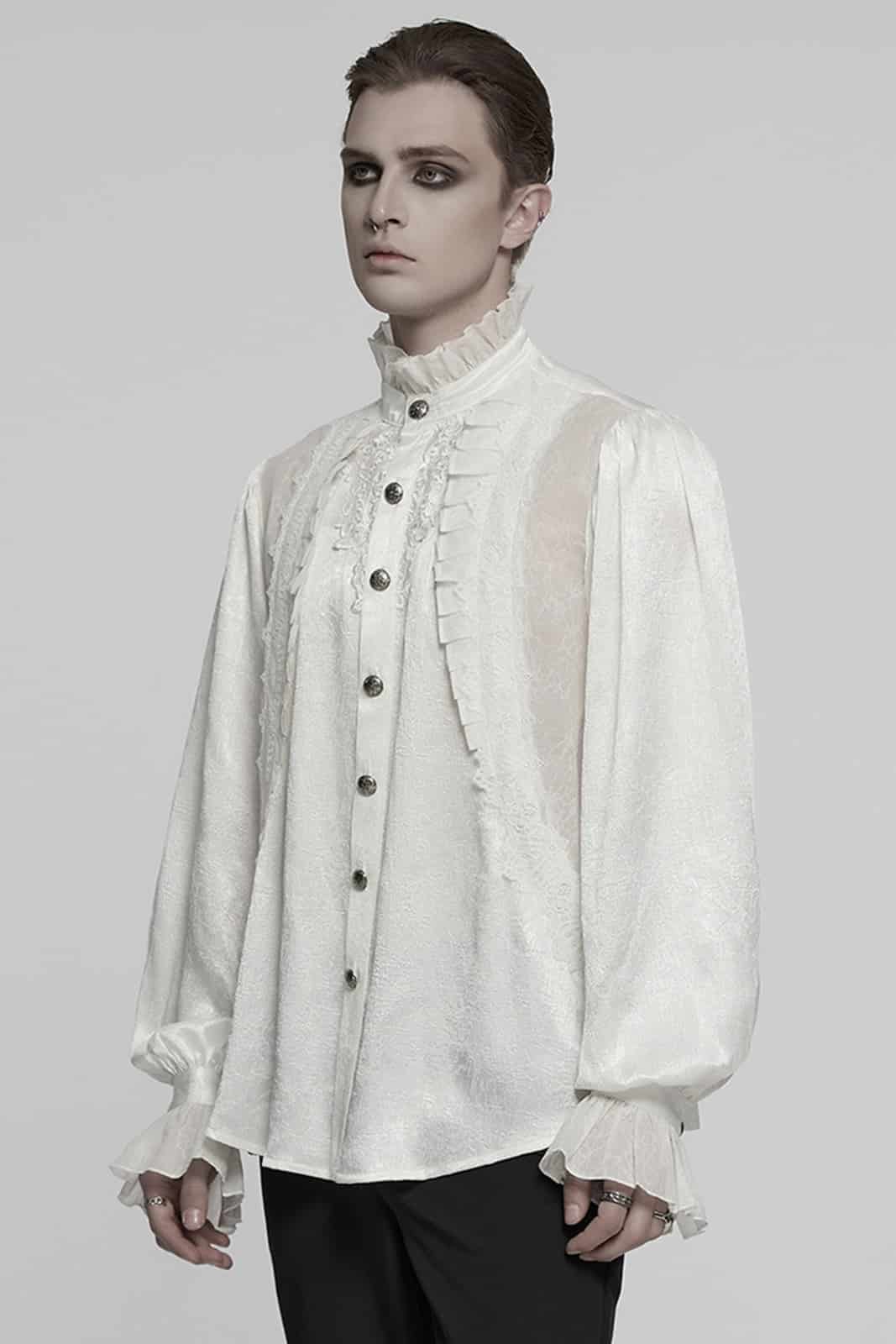 Dieses romantische Gothic-Hemd bringt Eleganz und Dramatik in jedes Outfit. Der weiße Stoff mit zartem Rosenmuster und schimmernder Struktur verleiht ihm eine edle Note, während transparente Einsätze und Spitzenapplikationen den Look verfeinern. Die weit geschnittenen Poet-Ärmel und der Rüschenbesatz machen es zum perfekten Stück für stilvolle Auftritte zwischen Barock-Ästhetik und Dark Romance.