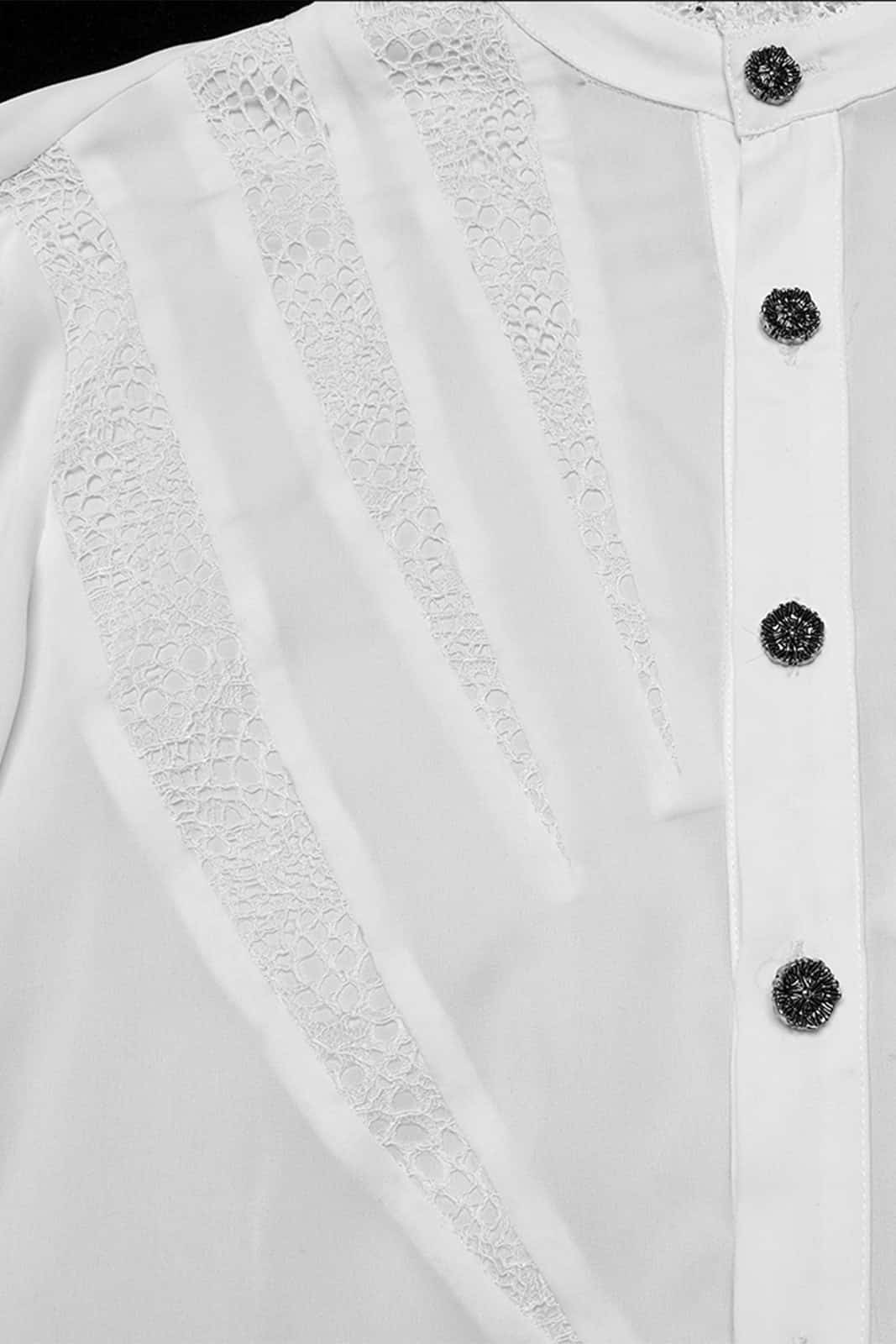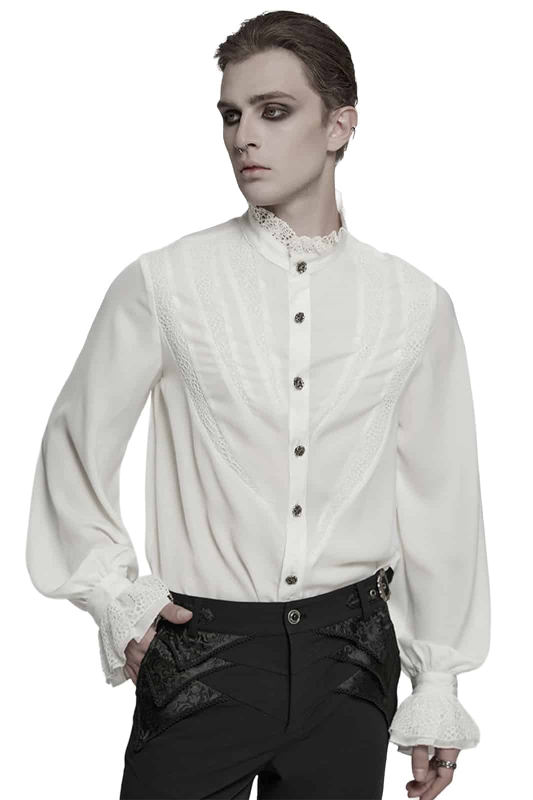 Ein Stück viktorianische Romantik in strahlendem Weiß: Das Prince of Thorns Hemd verbindet elegante Gothic-Ästhetik mit poetischer Leichtigkeit. Der fließende Chiffon schafft eine edle, weiche Silhouette, während feine Spitzen- und Meshdetails das Design kunstvoll strukturieren. Die spitz zulaufenden Mesh-Panele auf der Front setzen einen dezenten, aber markanten Blickfang. Abgerundet wird der aristokratische Look durch einen verspielten Rüschen-Stehkragen – perfekt für formelle Gothic-Outfits, fantastische Styles oder besondere Anlässe mit dramatischer Note.