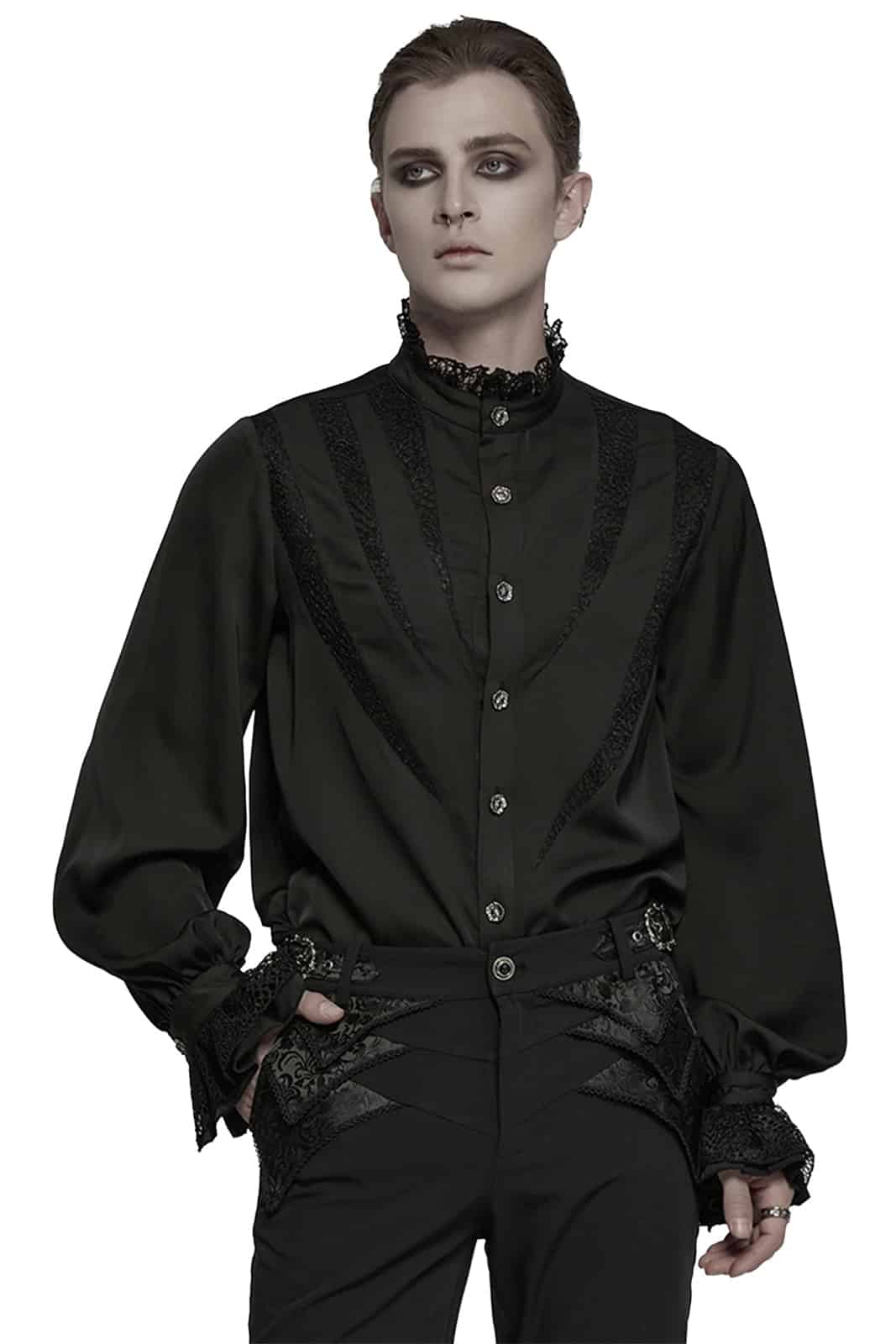 Ein Hemd wie aus einem düsteren Märchen: Der Prince of Thorns verbindet romantische Gothic-Elemente mit viktorianischer Eleganz und einer feinen, mystischen Ausstrahlung. Die leichte Chiffonbasis sorgt für einen fließenden Fall, während die poetischen Ärmel und die spitzen Mesh-Einsätze auf der Vorderseite dem Design Tiefe und Struktur verleihen. Zarte Spitzenakzente und ein verspielter Stehkragen runden den aristokratischen Look ab – perfekt für formelle Gothic-Outfits, Bühnenmomente oder nächtliche Festlichkeiten.