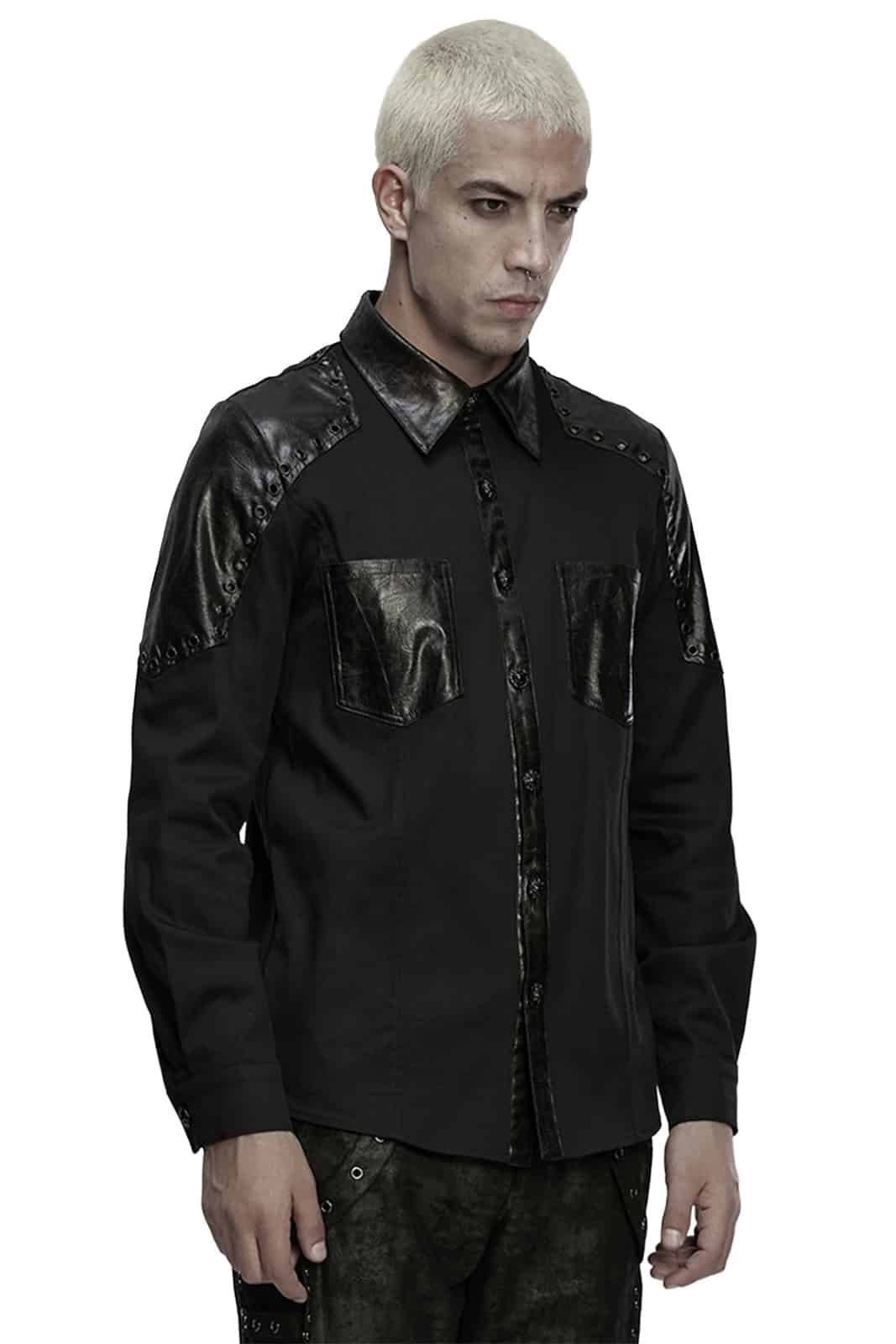 Dieses figurbetonte Gothic-Hemd für Herren verbindet klassische Schnittführung mit markanten Akzenten in Lederoptik. Der cleane Look wird durch beschichtete Details an Kragen, Knopfleiste, Schultern und Brusttaschen gebrochen und erhält so eine moderne, leicht industrielle Note. Ideal für elegante Gothic-, Industrial- oder Darkwear-Outfits mit klarer Linie.