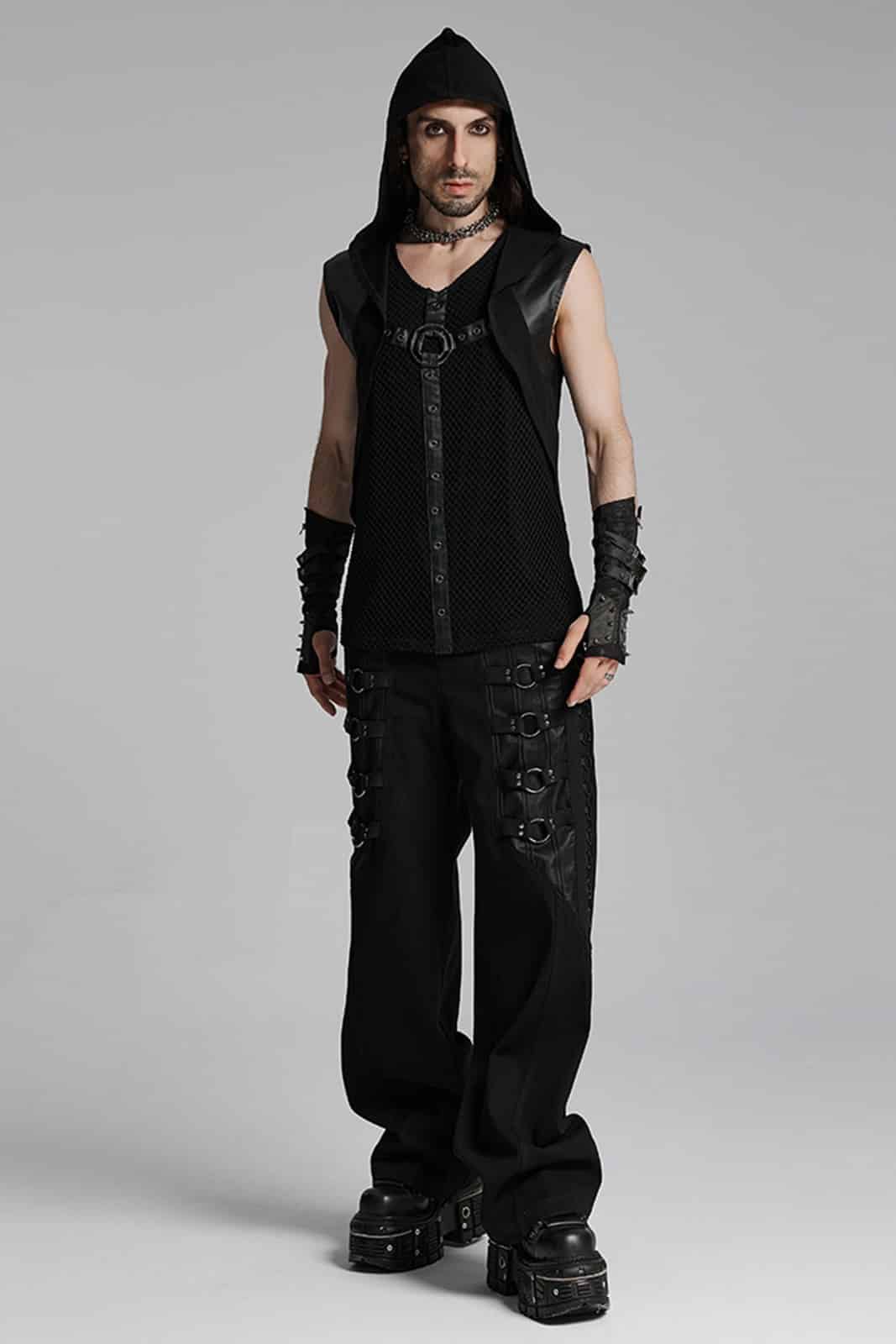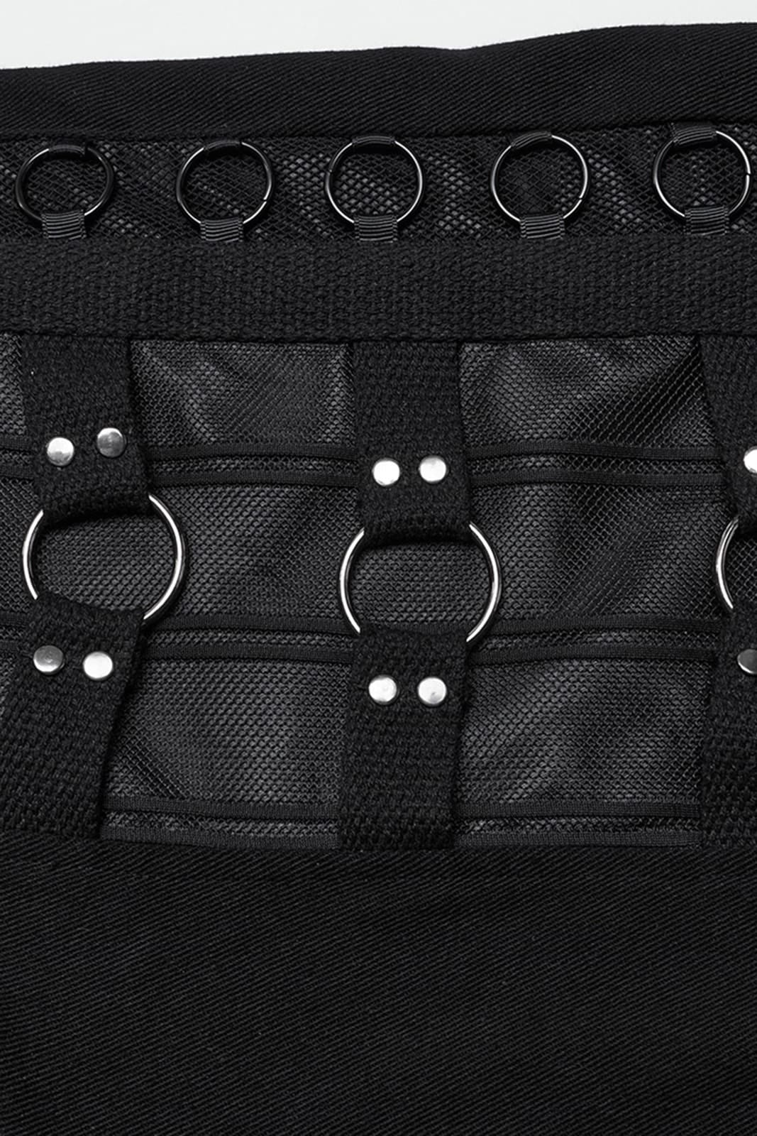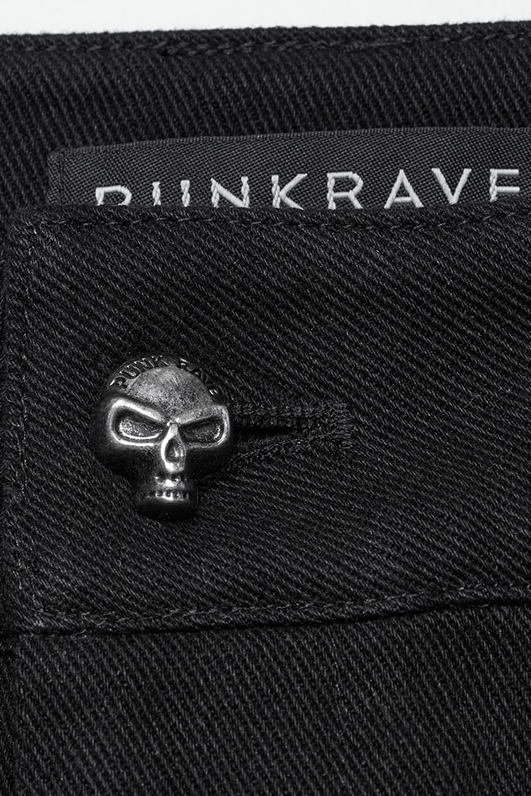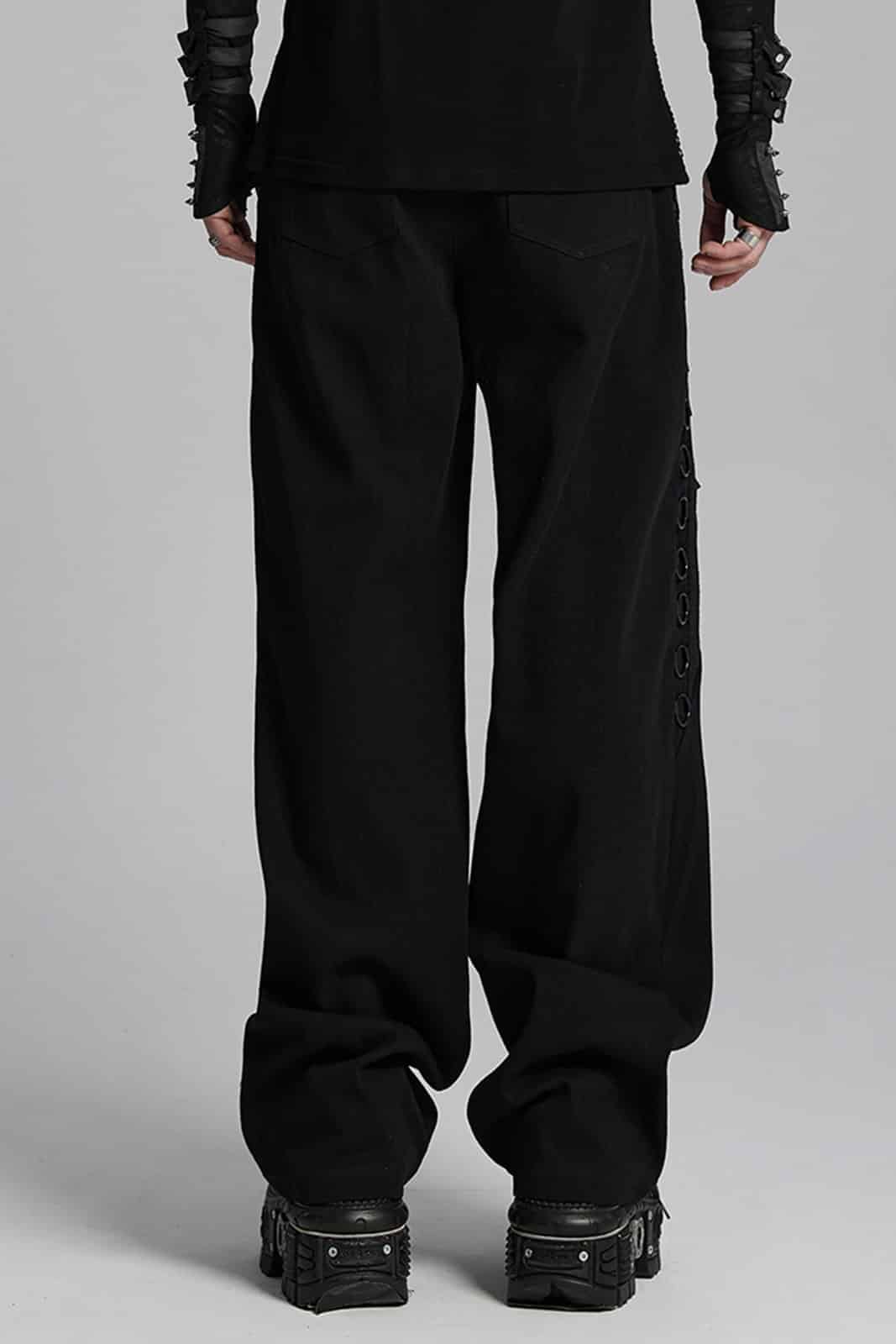 Gothic-Hose mit geradem Schnitt, Reißverschluß und Totenknopf-Verschluss. Mit zwei Taschen vorn und zwei Gesäßtaschen sowie Gürtelschlaufen. Die Schenkel sind verziert mit O-Ringen und nietenbesetzten Bändern.