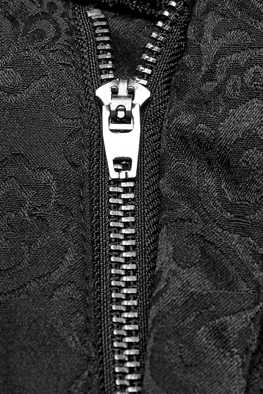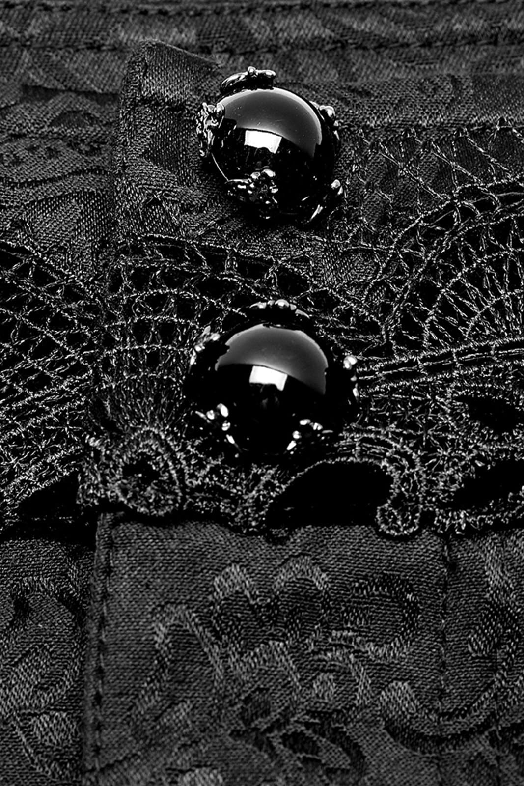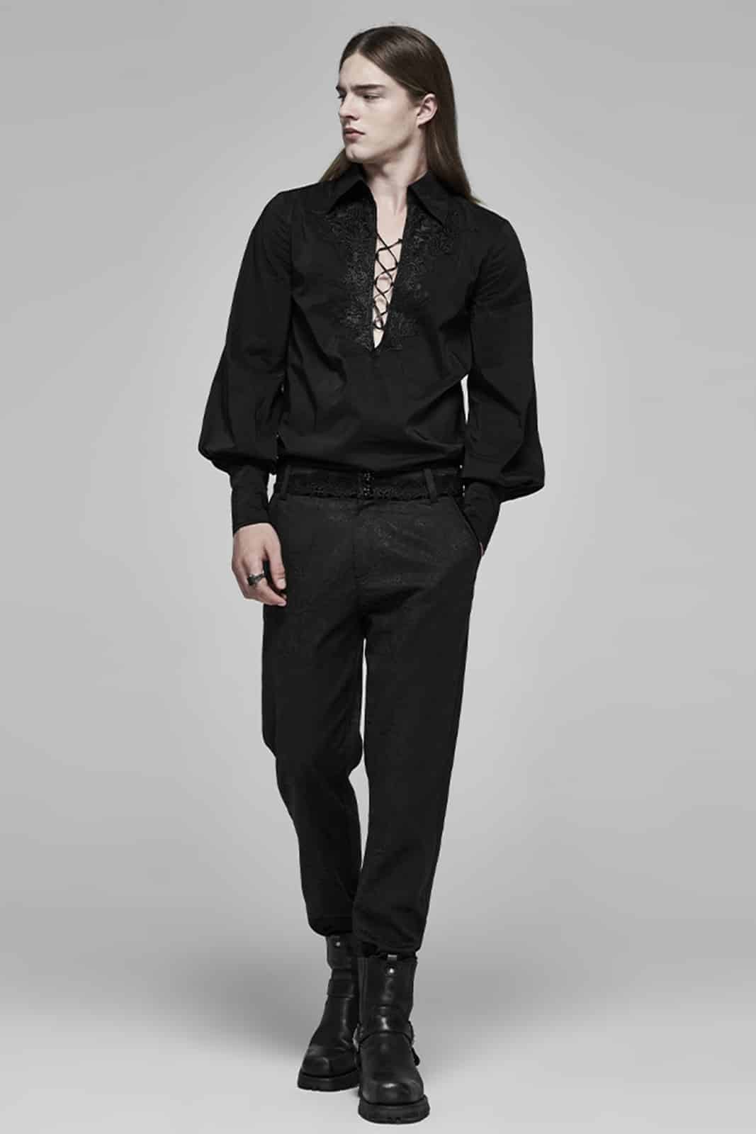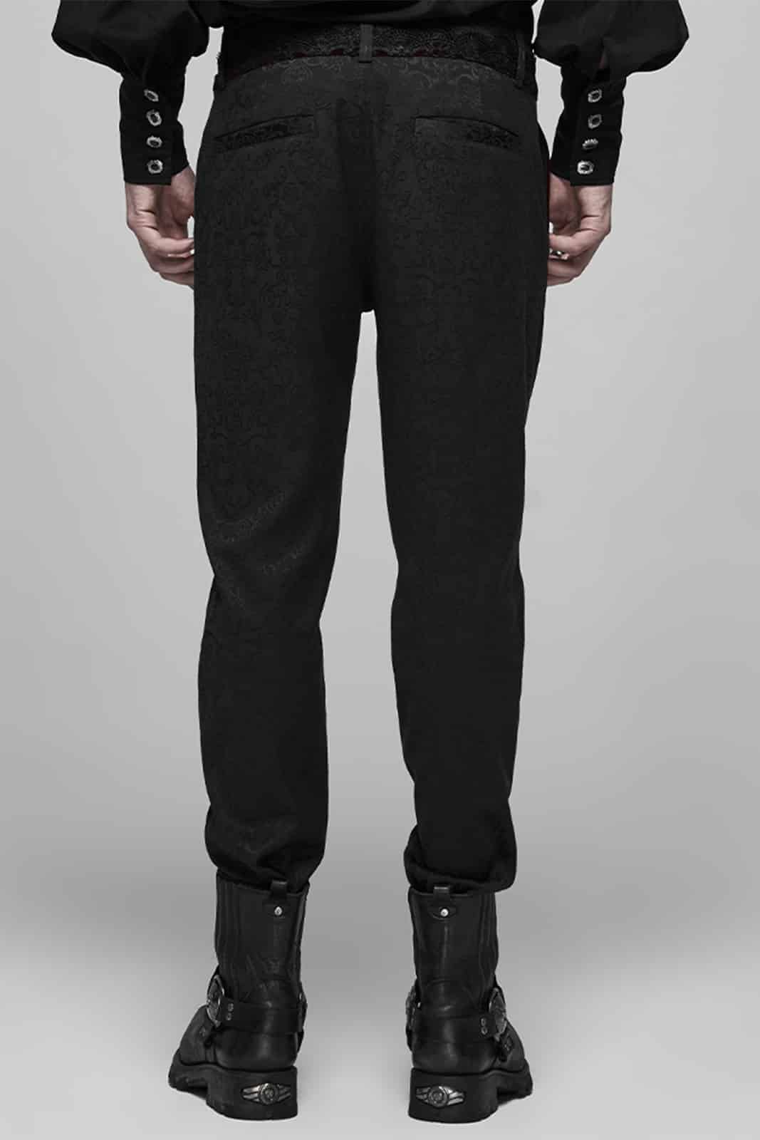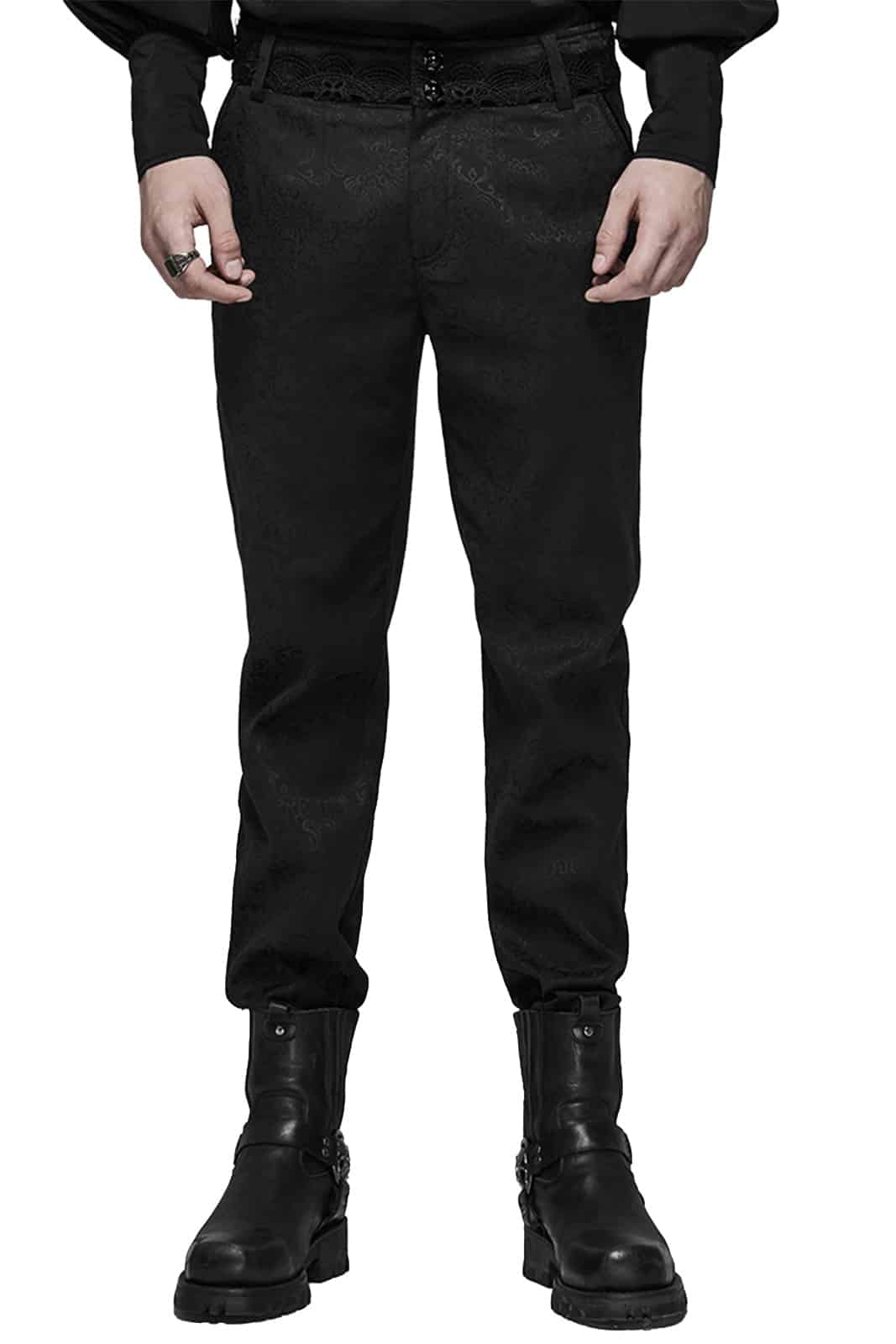 Schwarze Herrenhose im viktorianischen Gothic-Stil aus luxuriösem Brokatstoff mit Gürtelschlaufen und gestickten Bandbesätzen. Mit zwei Seitentaschen und zwei Gesäßtaschen.