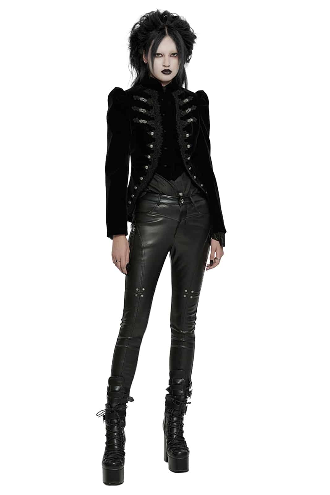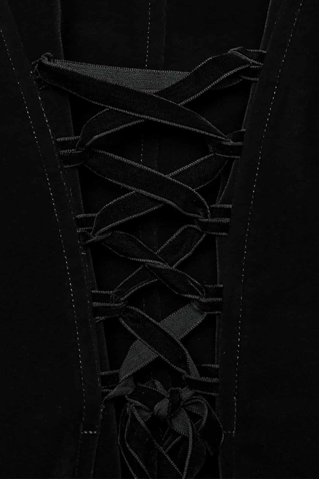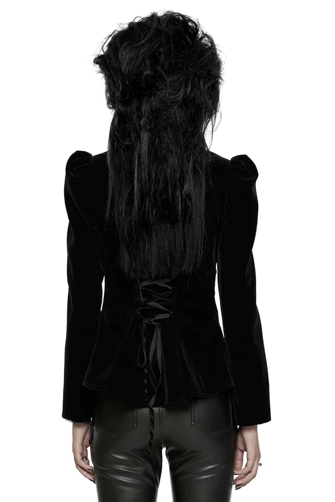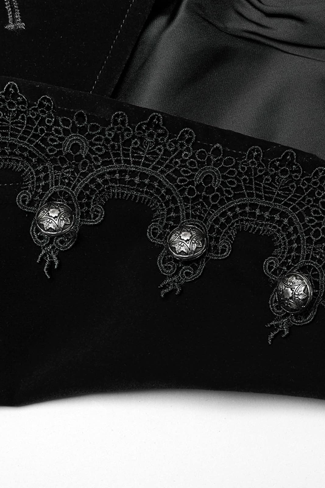 Die Abigail Jacke vereint gotische Opulenz mit viktorianischer Raffinesse und bietet eine markante Silhouette, die die Sinne verzaubert. Diese taillierte Kurzjacke aus luxuriösem schwarzem Samt hat lange Ärmel mit plissierten Schultern für einen dramatischen Touch. Der abgerundete Saum fällt im unteren Rückenbereich leicht ab und verleiht dem Ganzen ein anmutiges Profil. Aufwendige Stickapplikationen zieren die vordere Öffnung, während filigrane und gravierte Zierknöpfe einen kunstvollen Charme verleihen. Die Schnürung am Rücken ermöglicht eine individuelle Passform, und das Satinfutter sorgt für Komfort und Luxus.