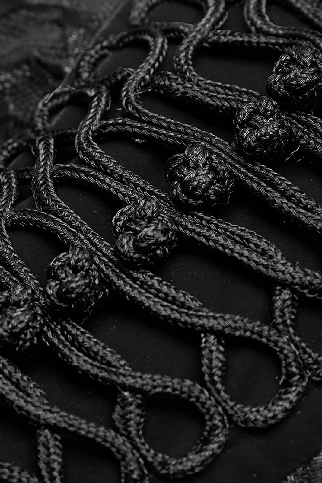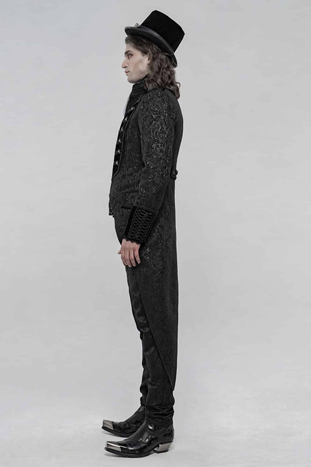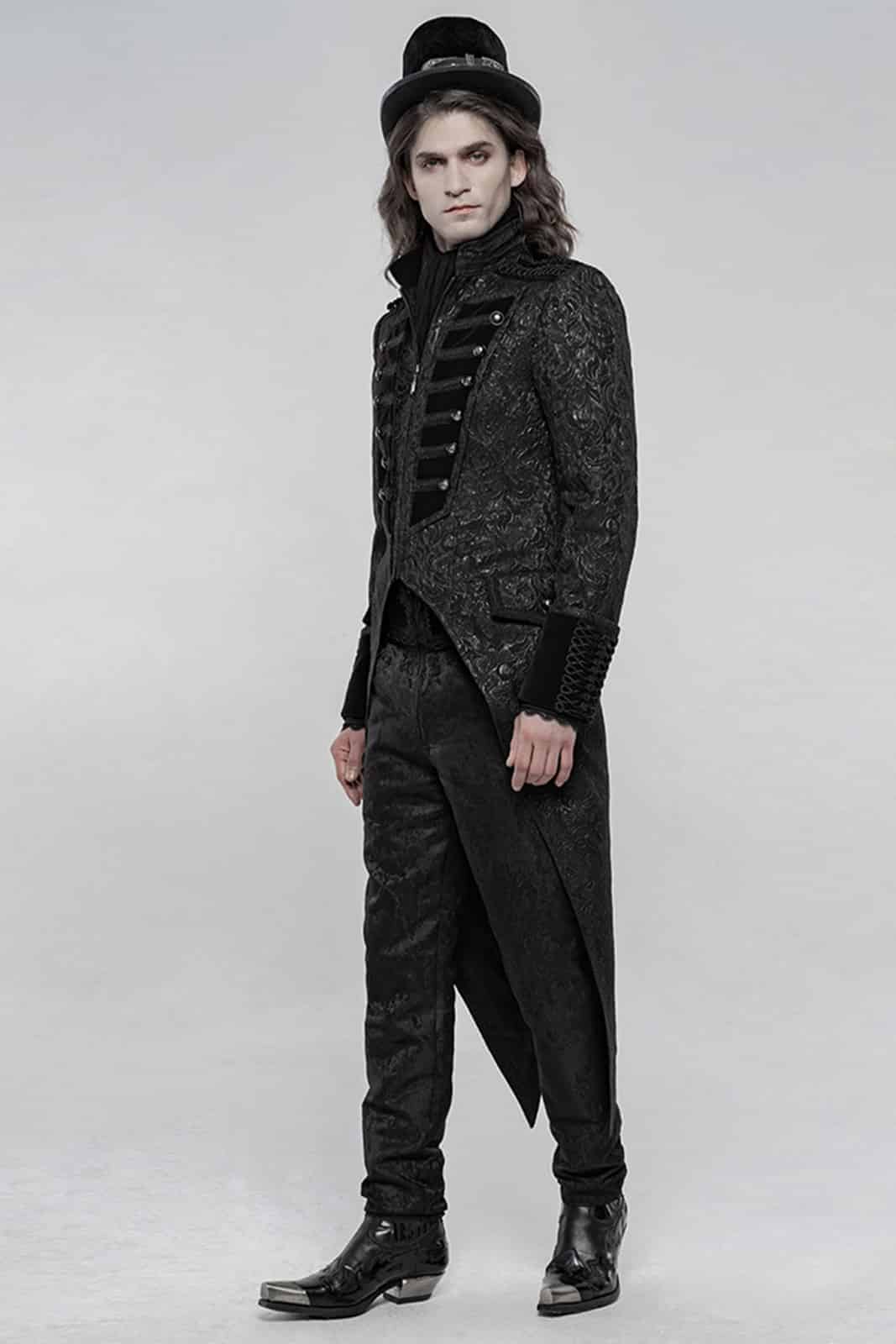 Im Militärstil gefertigte Herrenjacke aus schwarzem Brokatstoff mit Samtakzenten an den Bündchen und mittig an der Front. Mit bequem zu öffnendem Reißverschluß und auffallenden Wappenknöpfen.