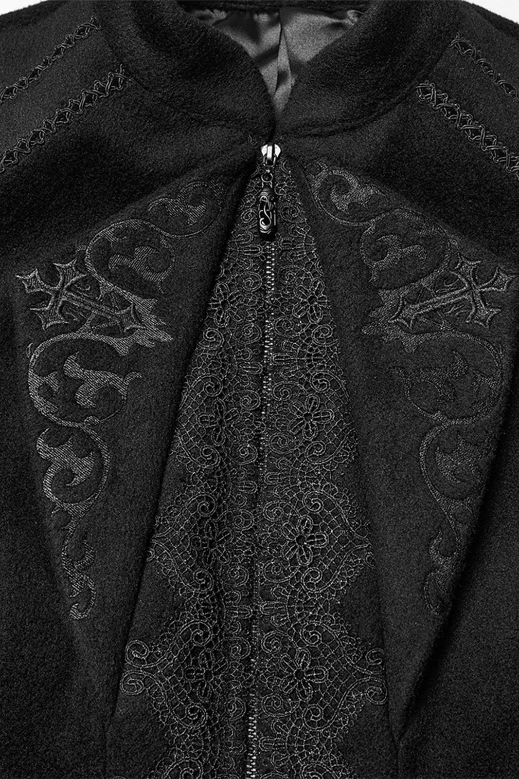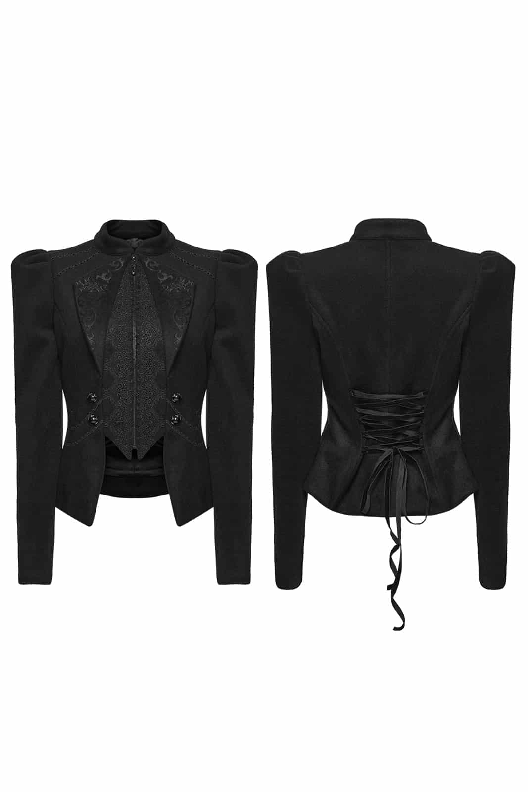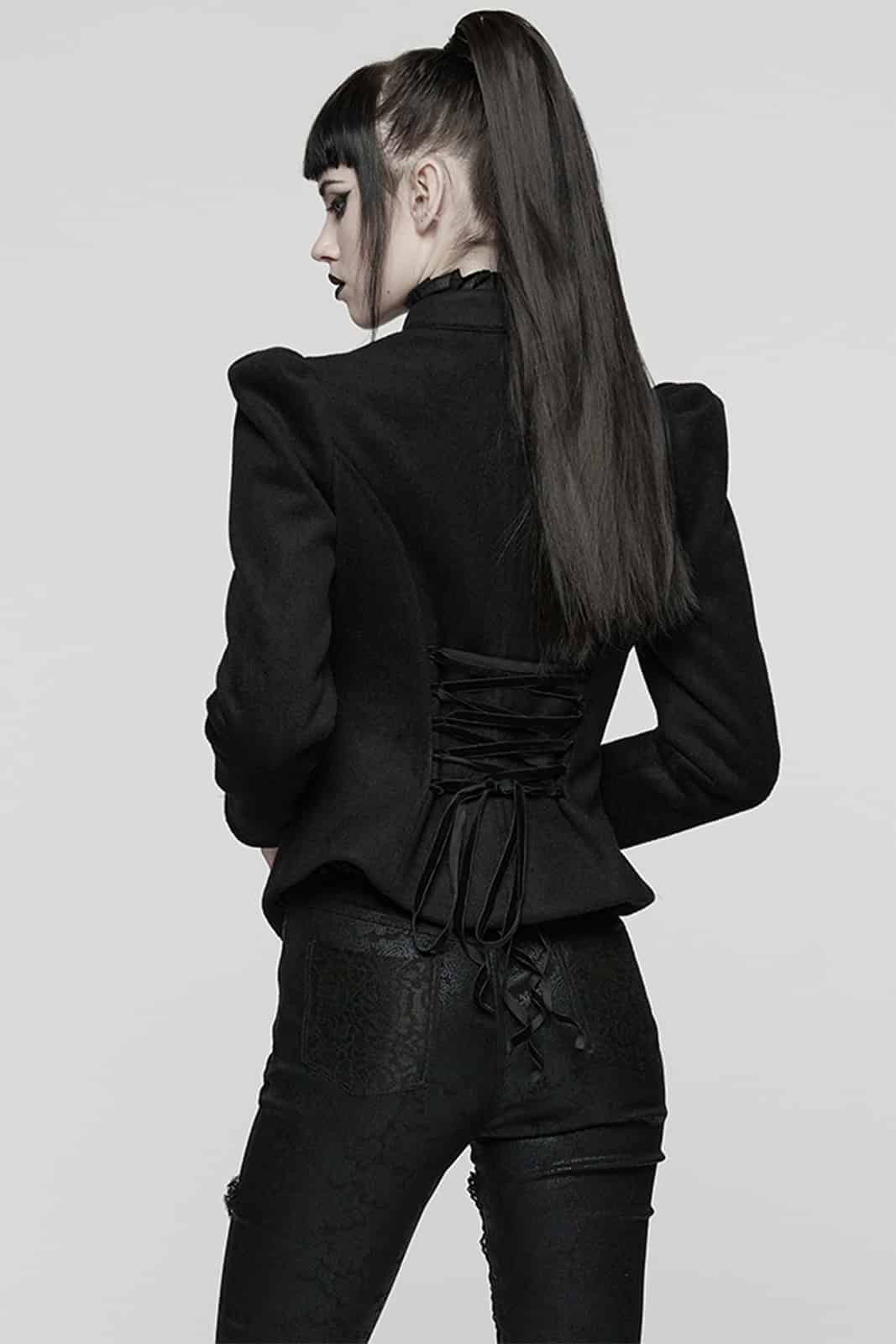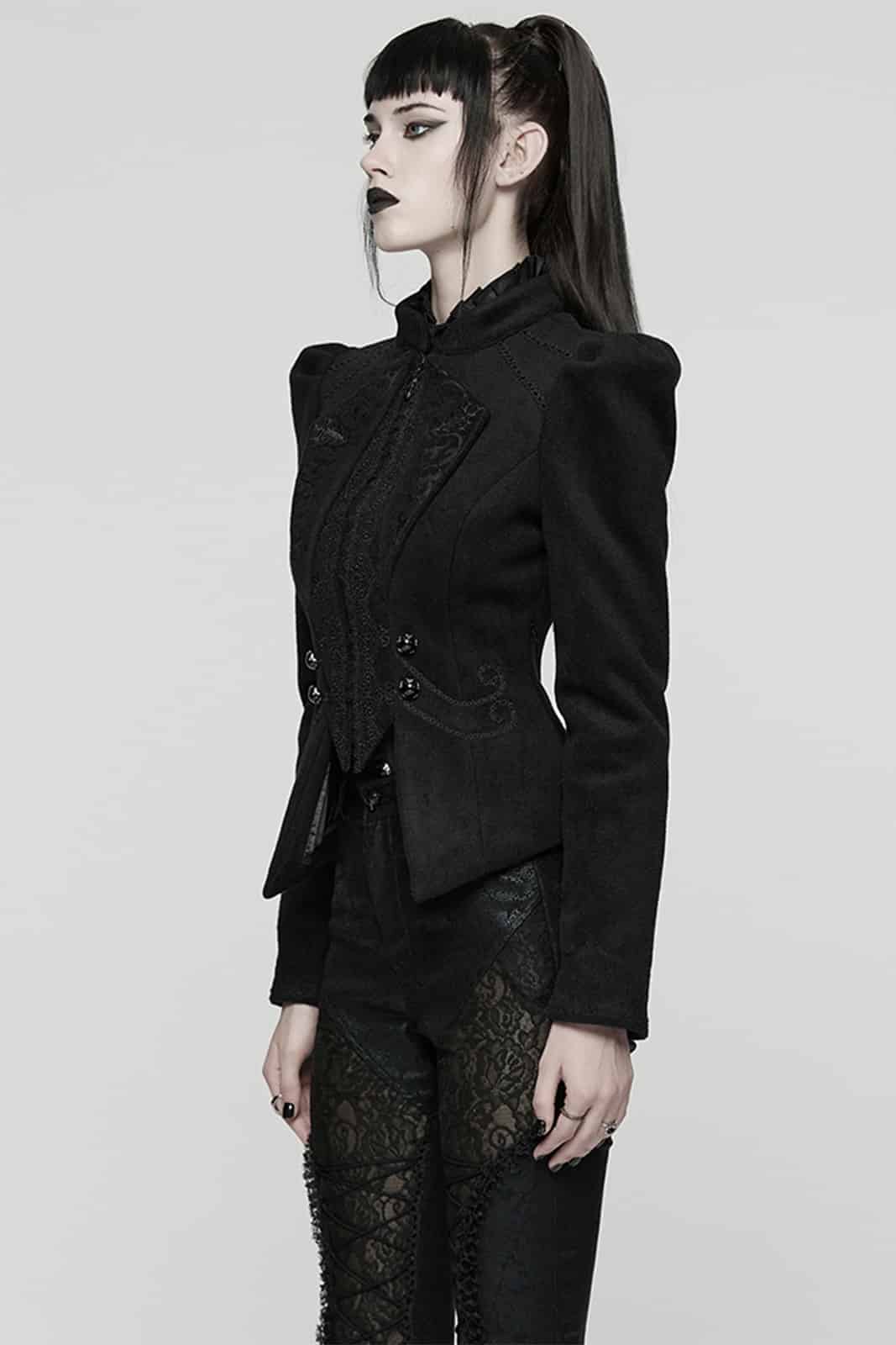 Majestätisch, streng und von dunkler Eleganz durchzogen – die Victoriana Shadow Empress Jacket wirkt wie ein Relikt aus einer vergessenen Epoche. Inspiriert von viktorianischer Silhouette und aristokratischer Strenge, betont sie die Taille und setzt mit dramatischen Schultern ein kraftvolles Statement. Feine Stickereien und Spitzendetails verleihen ihr eine geheimnisvolle Tiefe, die zwischen Romantik und Dominanz oszilliert.