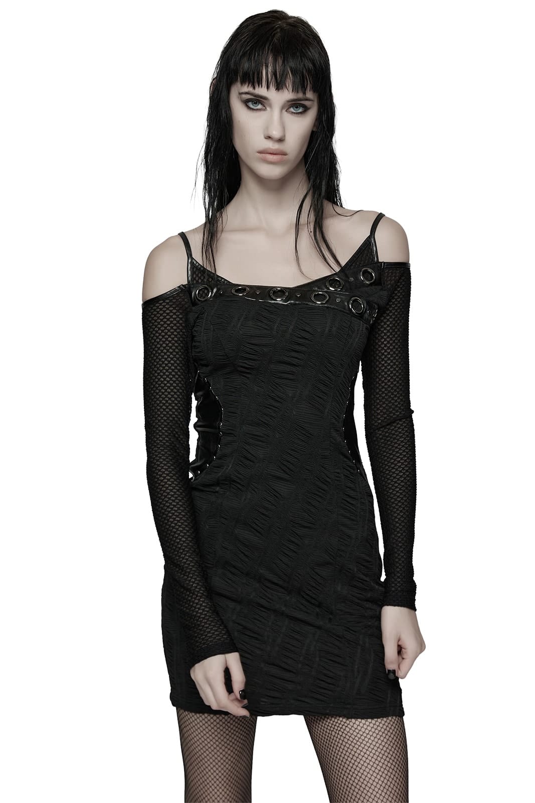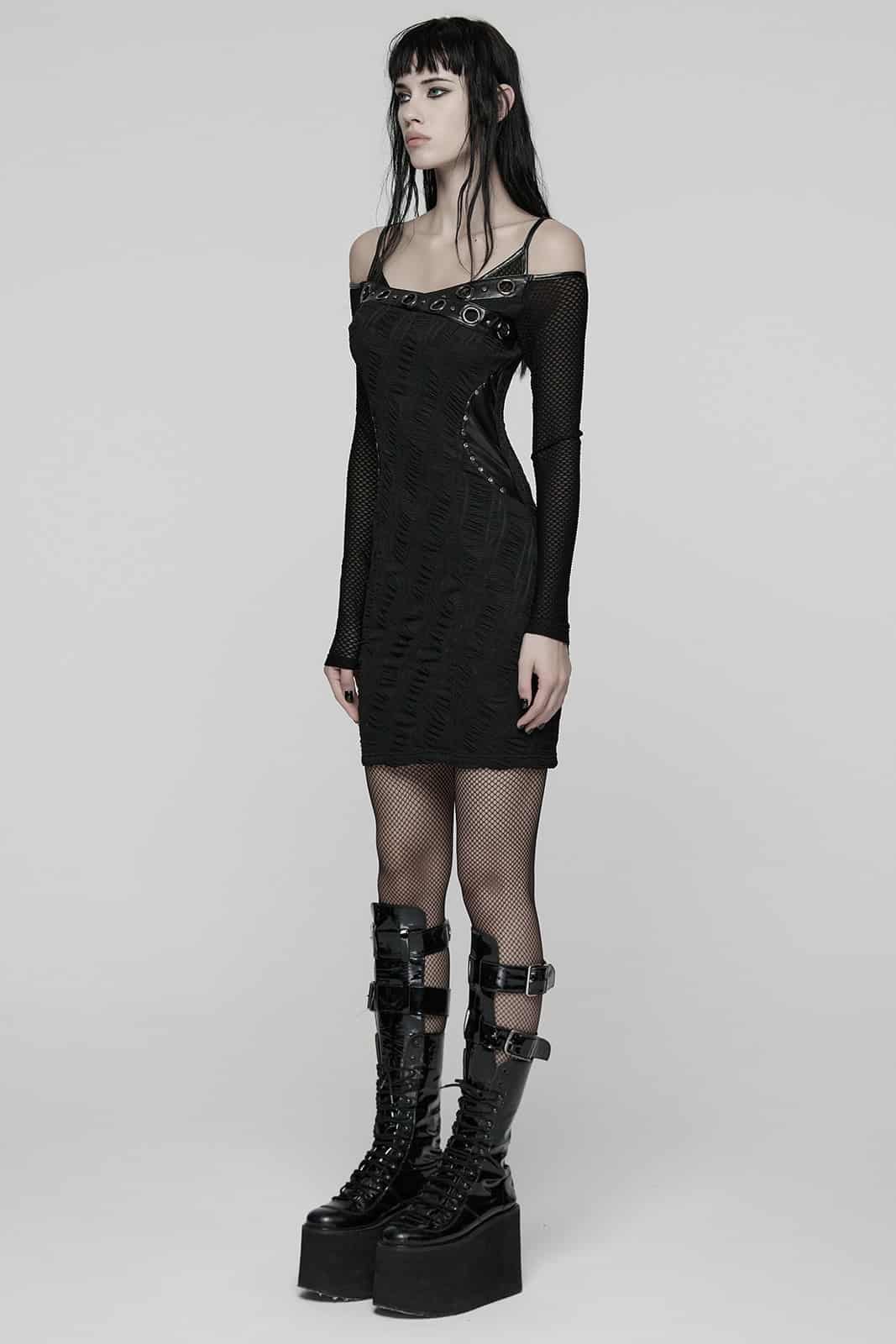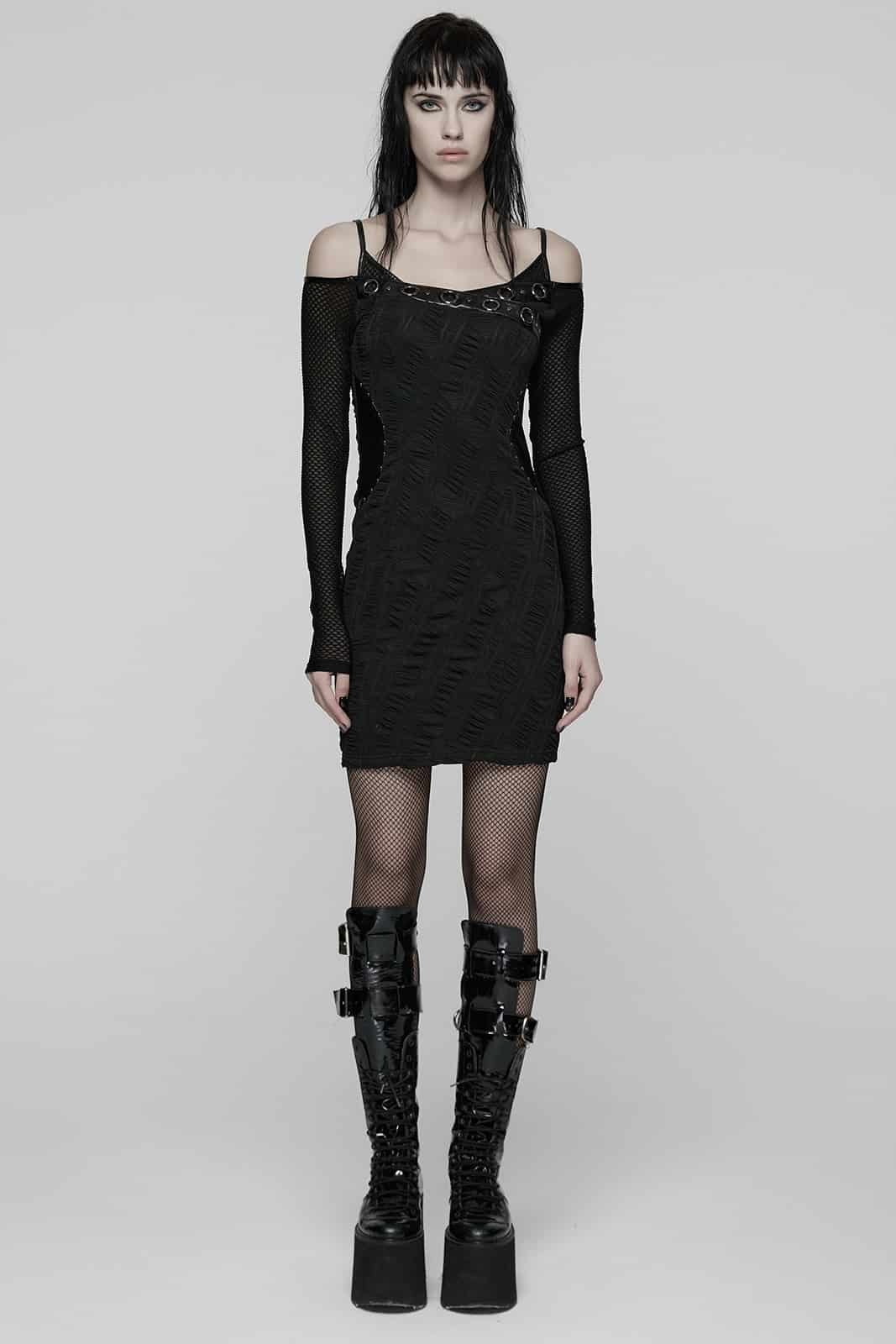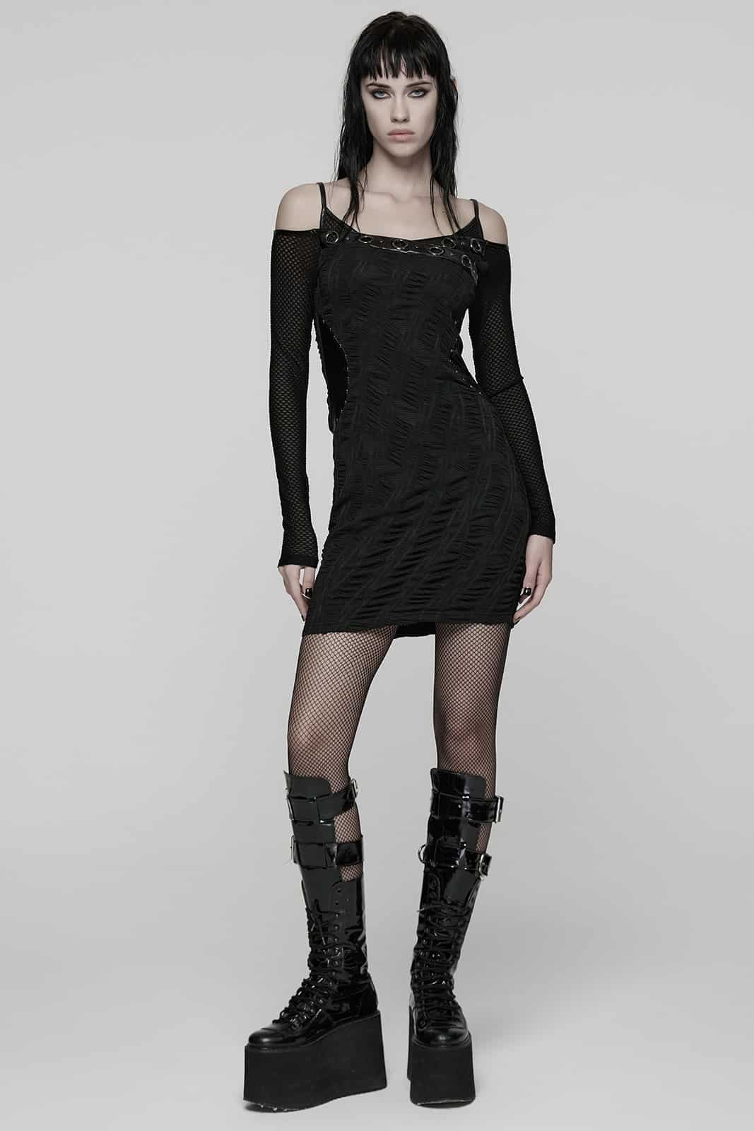 Das Dark Renegade Kleid vereint rebellischen Dark-Punk-Style mit figurbetonter Silhouette. Strukturierter Jersey, markante Kunstlederdetails und transparente Mesh-Ärmel sorgen für einen ausdrucksstarken Look – perfekt für Clubnächte, Konzerte oder edgy Streetstyles.