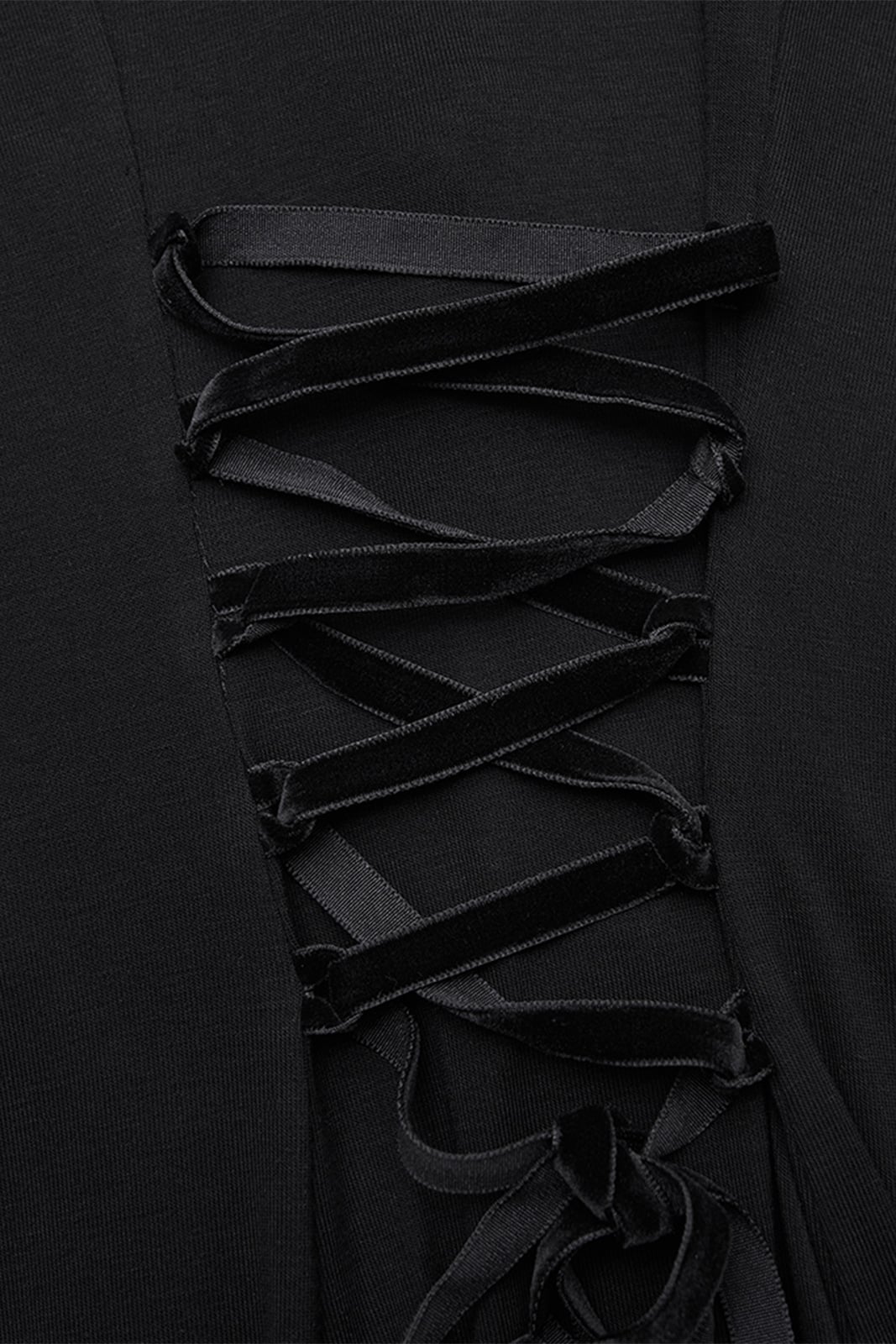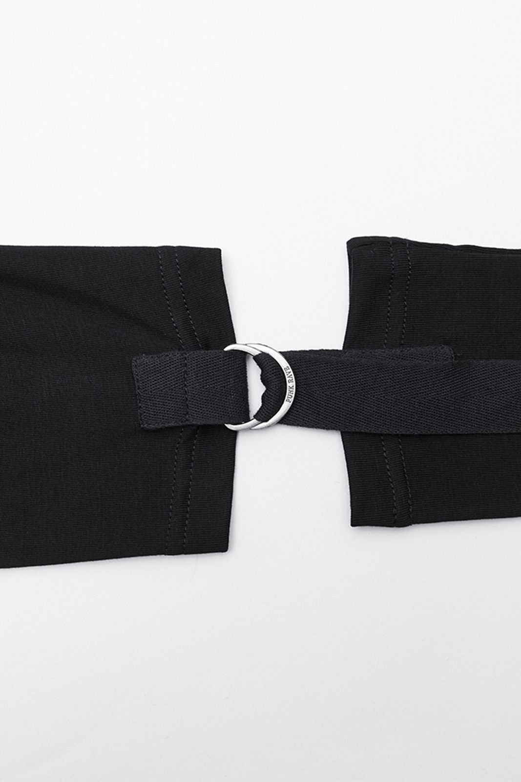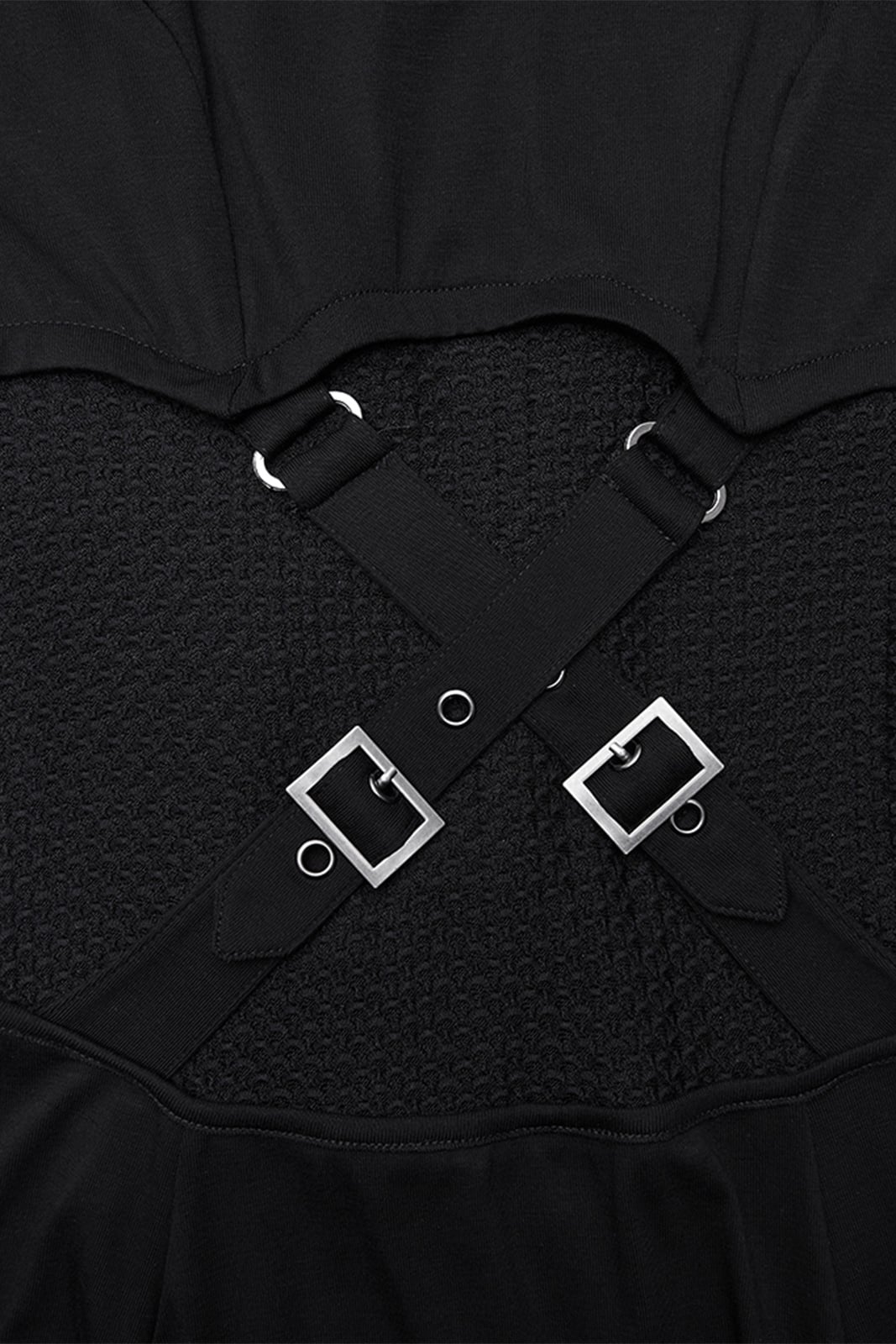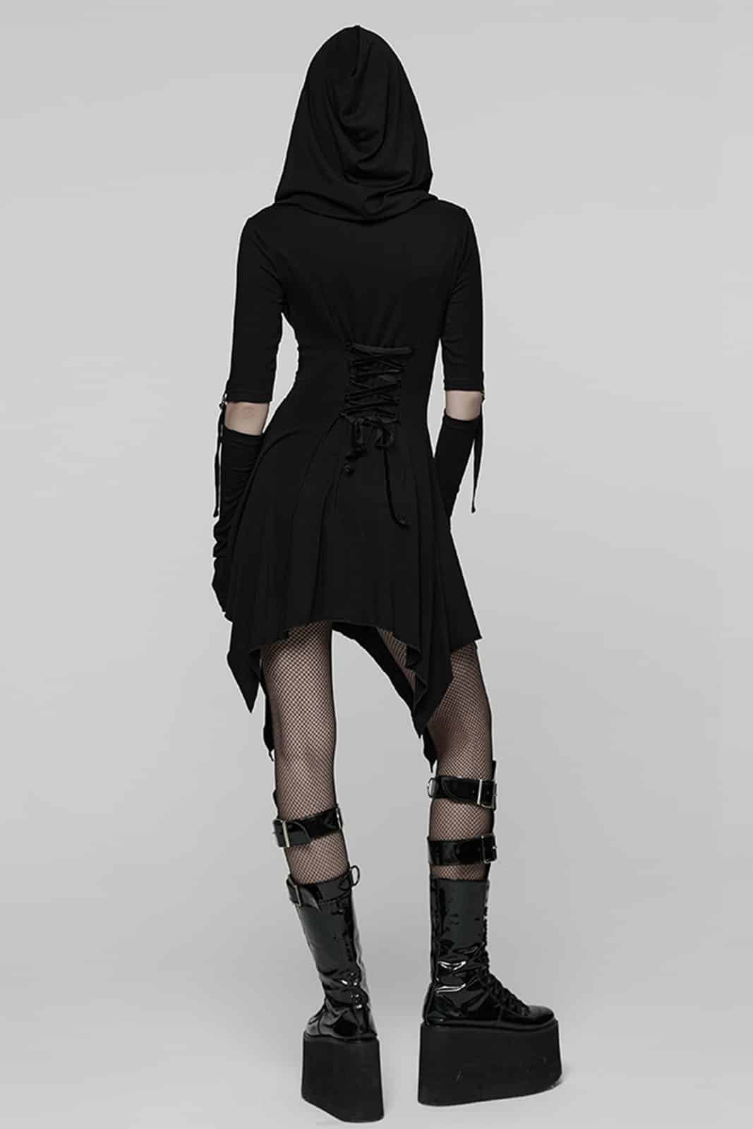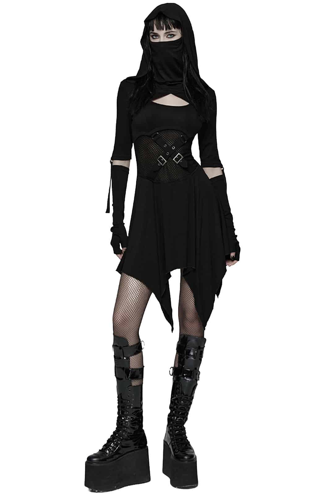 Dieses kurze Cyberpunk-Kleid vereint dystopische Ästhetik mit funktionalen Details und einer markanten Silhouette. Der figurbetonte Fit-and-Flare-Schnitt wird durch den asymmetrischen Hanky-Saum aufgelockert und sorgt für dynamische Bewegung. Der hohe Kragen mit Cut-out lässt sich bis über Mund und Nase ziehen und als Maske tragen, während die Kapuze den Look zusätzlich verdunkelt und urban wirkt. Im Taillenbereich setzt ein Mesh-Einsatz mit gekreuzten Schnallenriemen einen klaren Techwear-Akzent. Die langen Ärmel sind im Fingerless-Glove-Stil gestaltet und am unteren Teil abnehmbar, wodurch sich der Look flexibel variieren lässt. Perfekt für Cyberpunk-, Darkwear- und Post-Apocalyptic-Outfits.