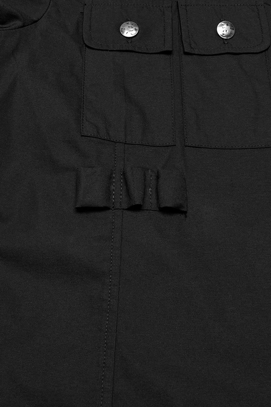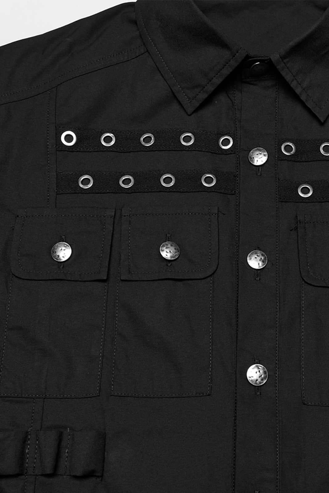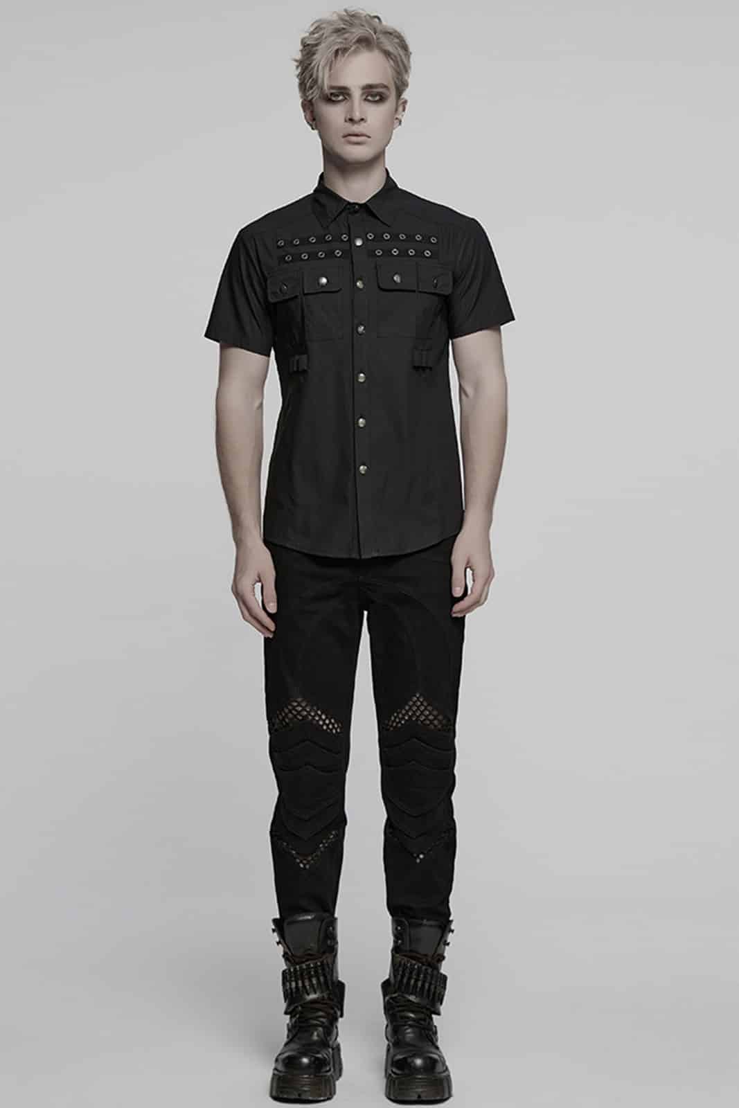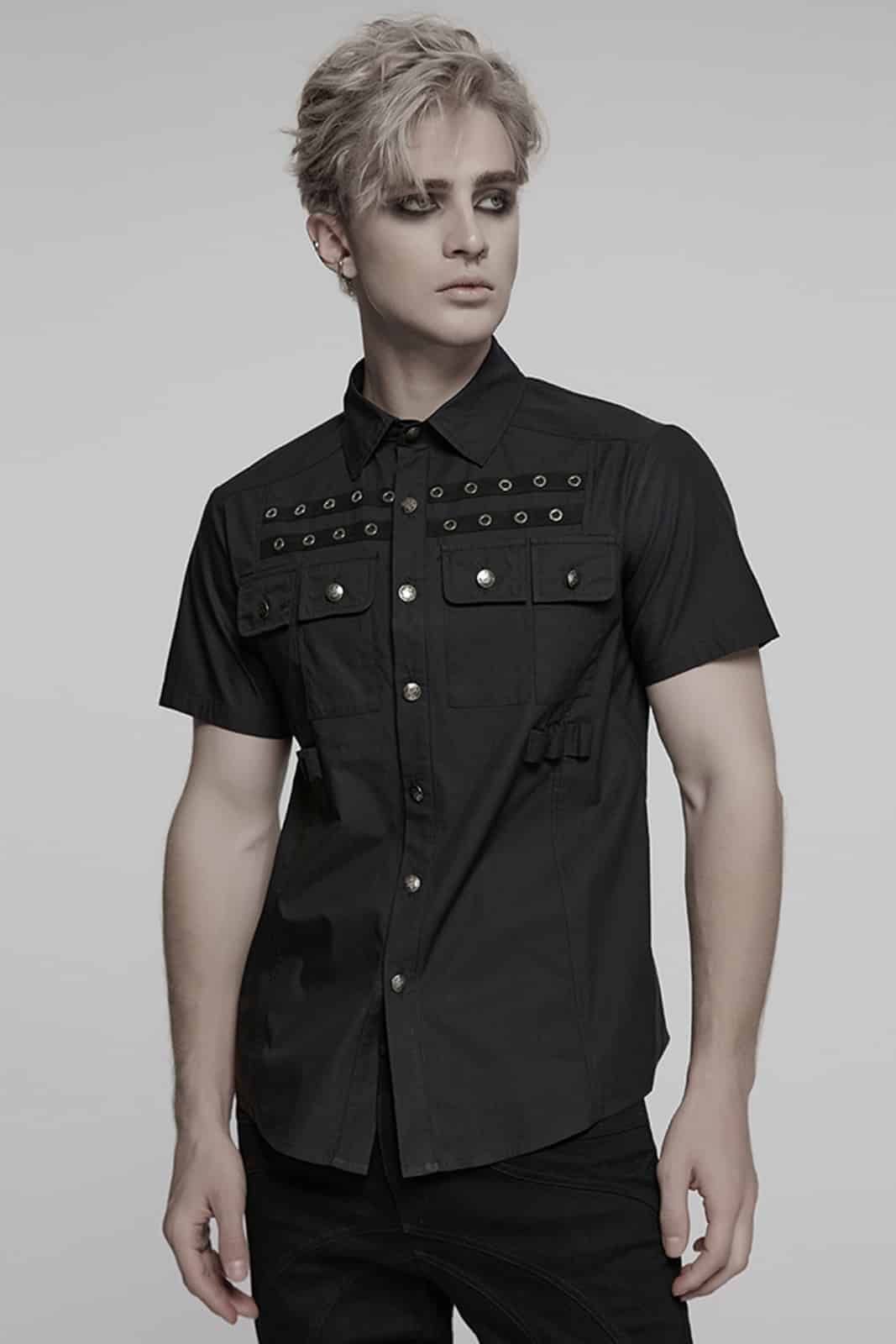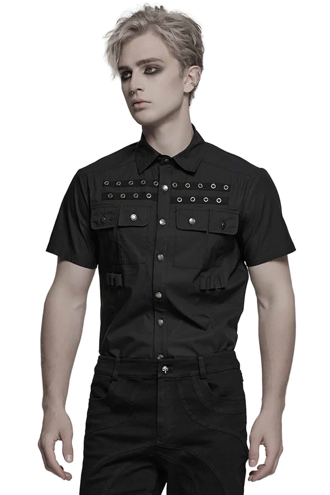 Dieses schwarze Kurzarmhemd verbindet klassische Linien mit markanten Gothic-Details. Die Brustpartie ist mit Taschen und Ösenstreifen versehen, die dem Hemd eine raue, industrielle Note verleihen. Durch den figurbetonten Schnitt passt es perfekt in Darkwear-Outfits und lässt sich vielseitig kombinieren – von Corporate Goth bis Club-Look.