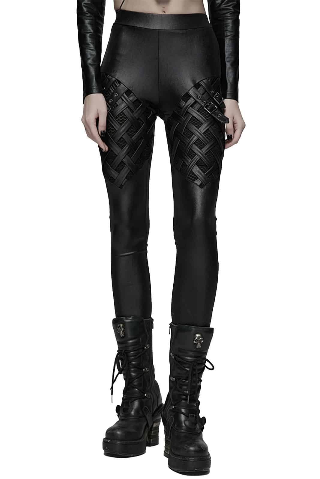 Diese markanten Gothic-Leggings von Punk Rave setzen auf eine kraftvolle, düstere Ästhetik mit klaren Linien und strukturierten Details. Das matte schwarze Kunstleder schmiegt sich figurbetont an und wird auf der Vorderseite von aufwendig geflochtenen Faux-Leather-Elementen mit Mesh-Unterlage und dekorativem Riemen akzentuiert. Eine perfekte Mischung aus Industrial, Darkwear und moderner Gothic-Optik – ideal für starke, selbstbewusste Looks.