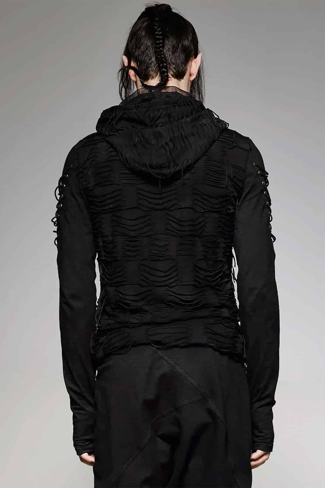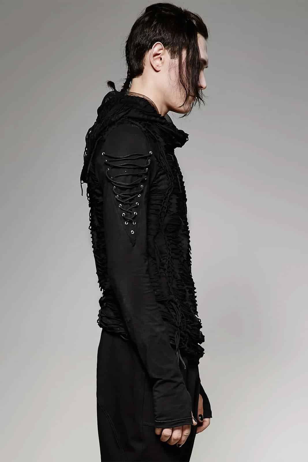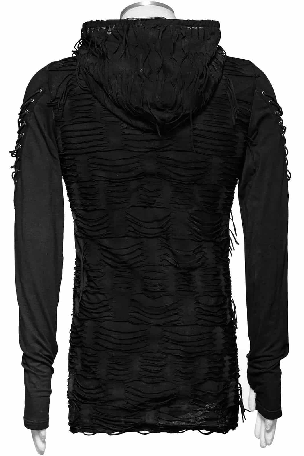 Schwarzes Langarmshirt im postapokalyptischen Distressed-Style mit übergroßer Kapuze unde Zierschnürungen an den Ärmeln. Die langen Ärmel sind mit Daumenlöchern versehen.