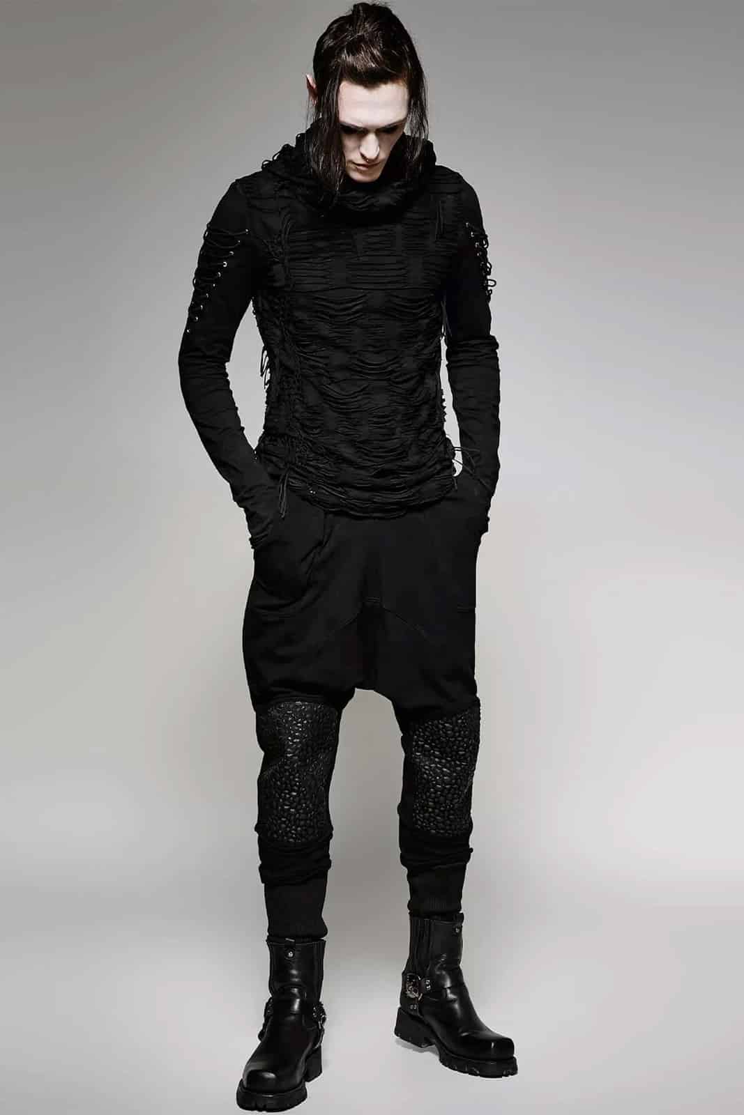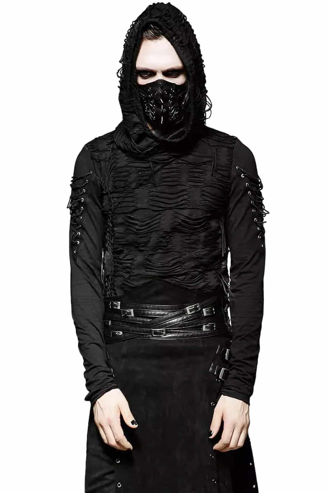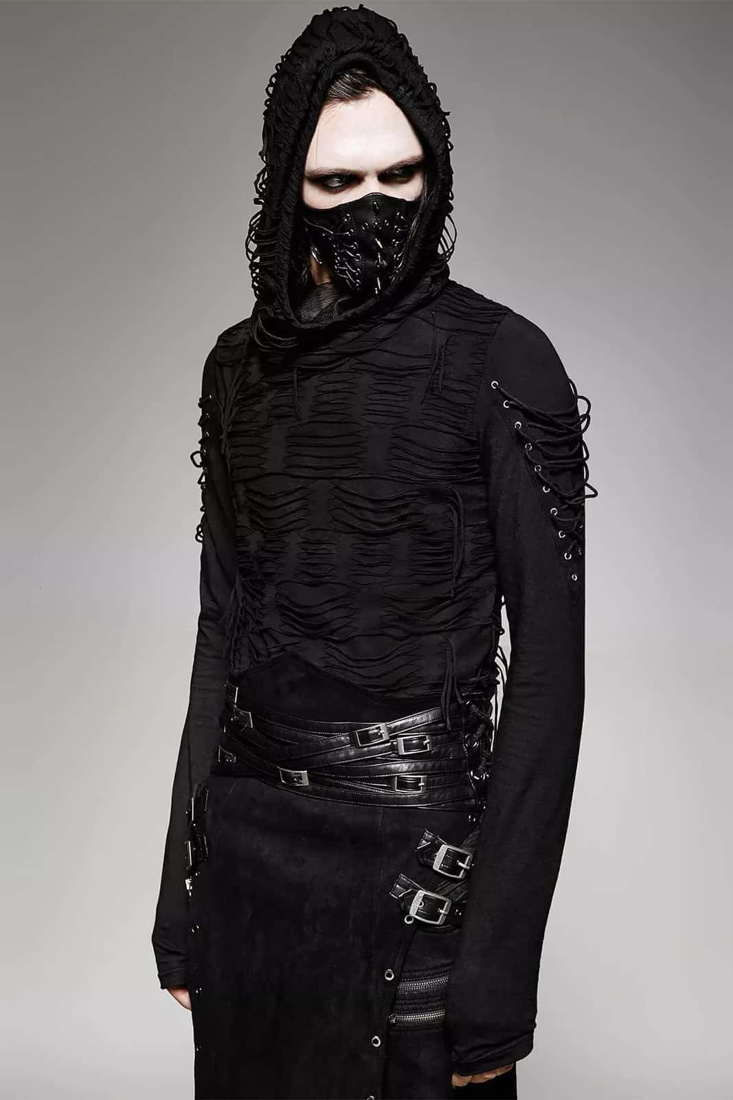 Schwarzes Langarmshirt im postapokalyptischen Distressed-Style mit übergroßer Kapuze unde Zierschnürungen an den Ärmeln. Die langen Ärmel sind mit Daumenlöchern versehen.