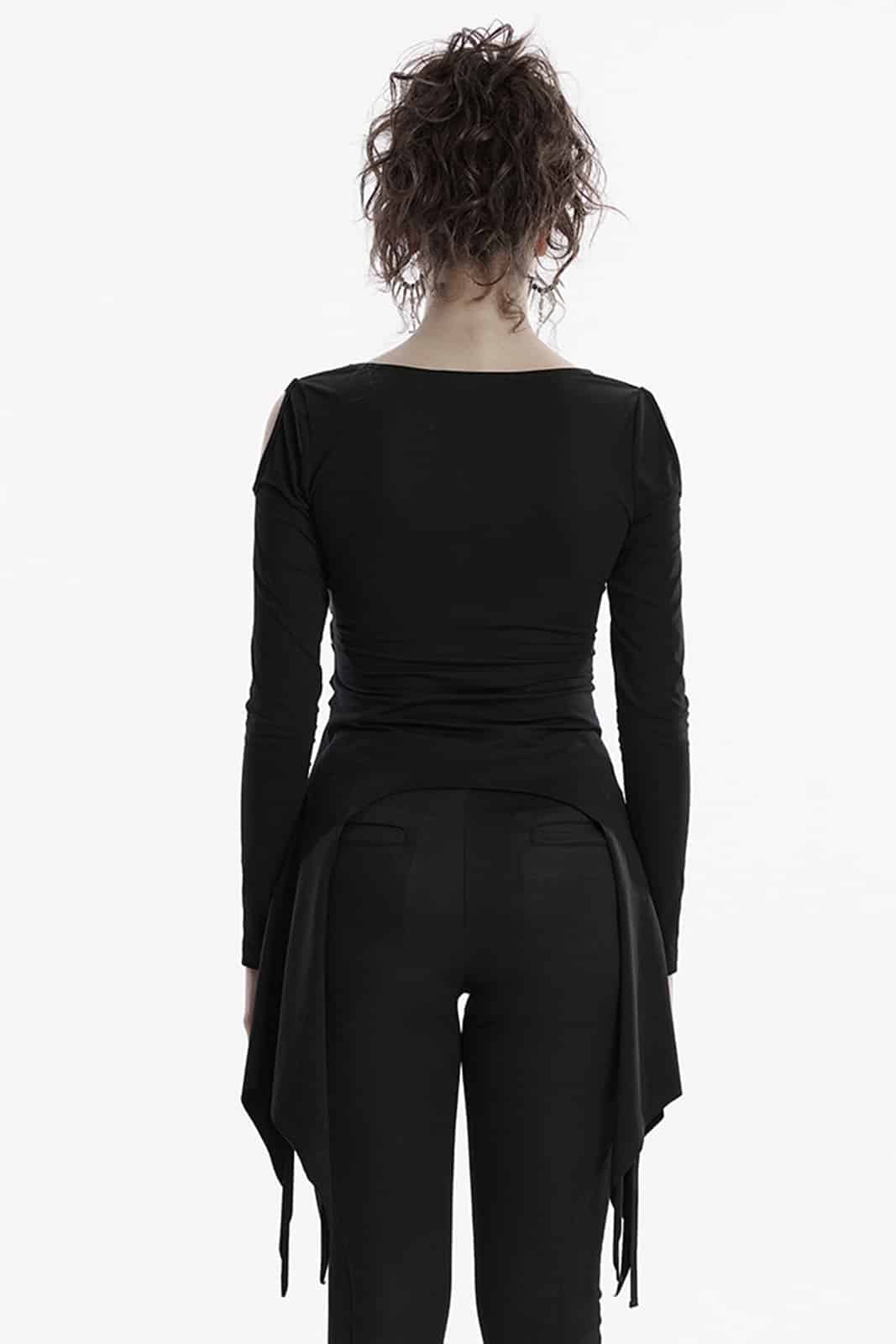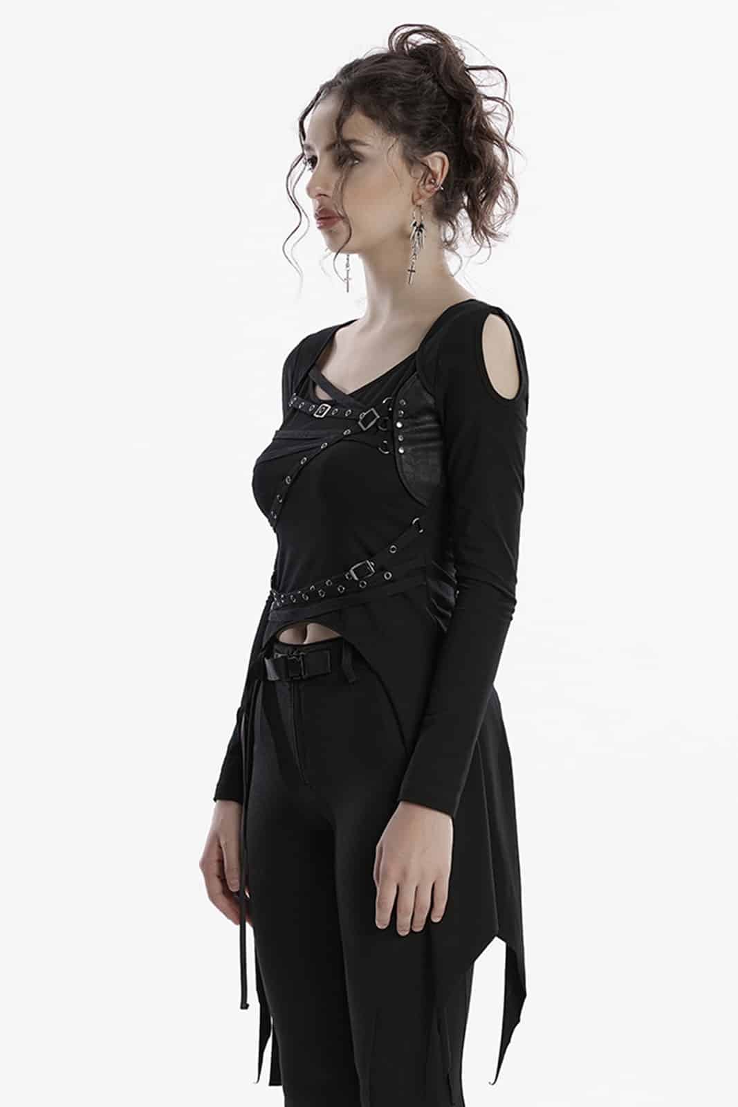 The Dark Dystopia long sleeve shirt is the perfect piece for a dark, post-apocalyptic look! The figure-hugging cut and shoulder cut-outs give the shirt an appealing, edgy touch, while the slit hem at the sides creates an interesting silhouette. The faux leather accents and simple buckled strap details reinforce this punky, rebellious style – just what you’d expect in a post-apocalyptic world. It goes super well with a bold, black skirt or stylish leather trousers. Combined with boots or perhaps pointed ankle boots, the look can look really strong and confident!