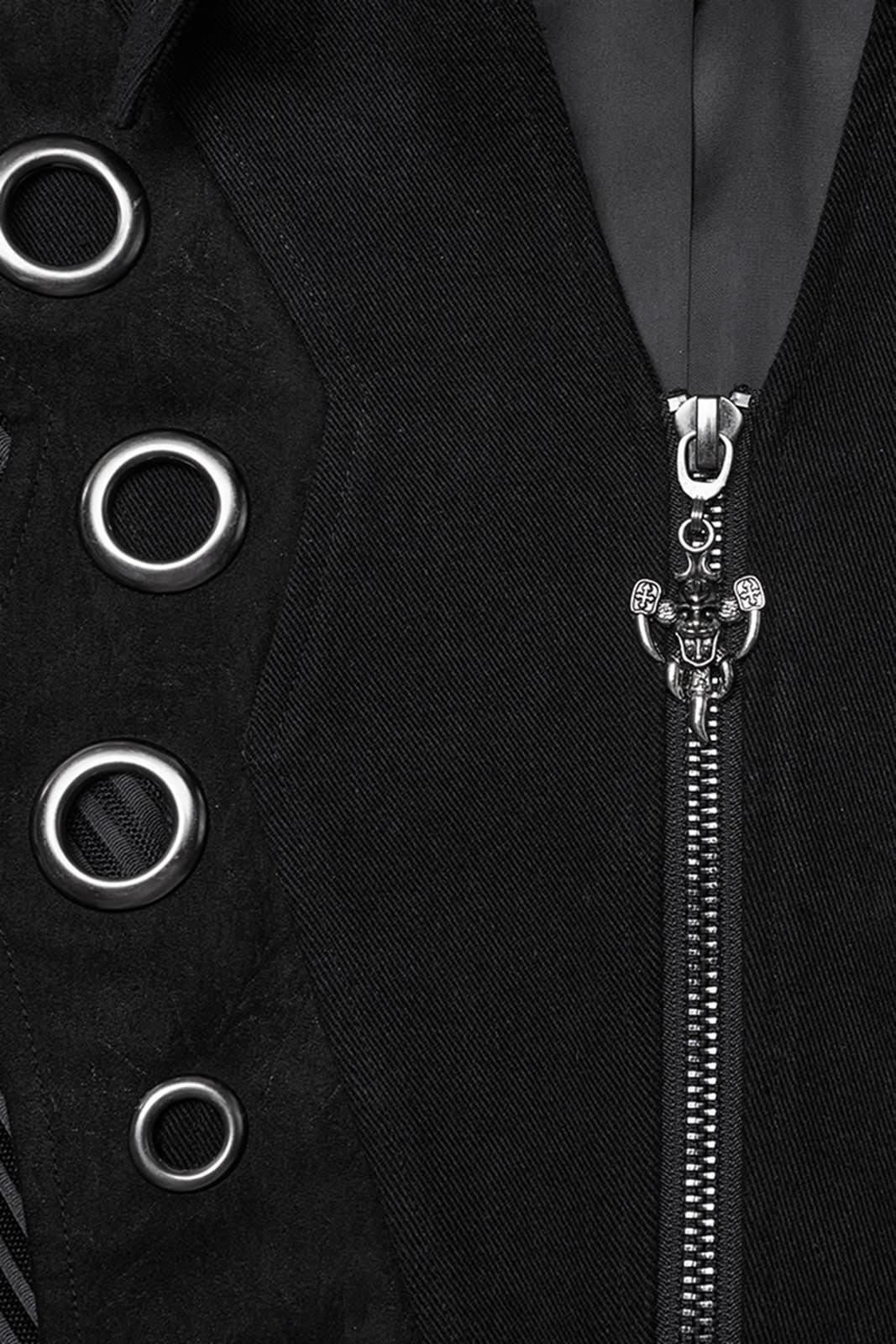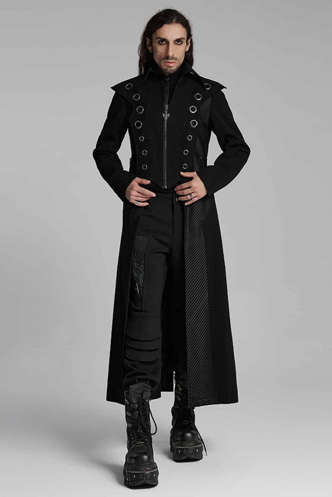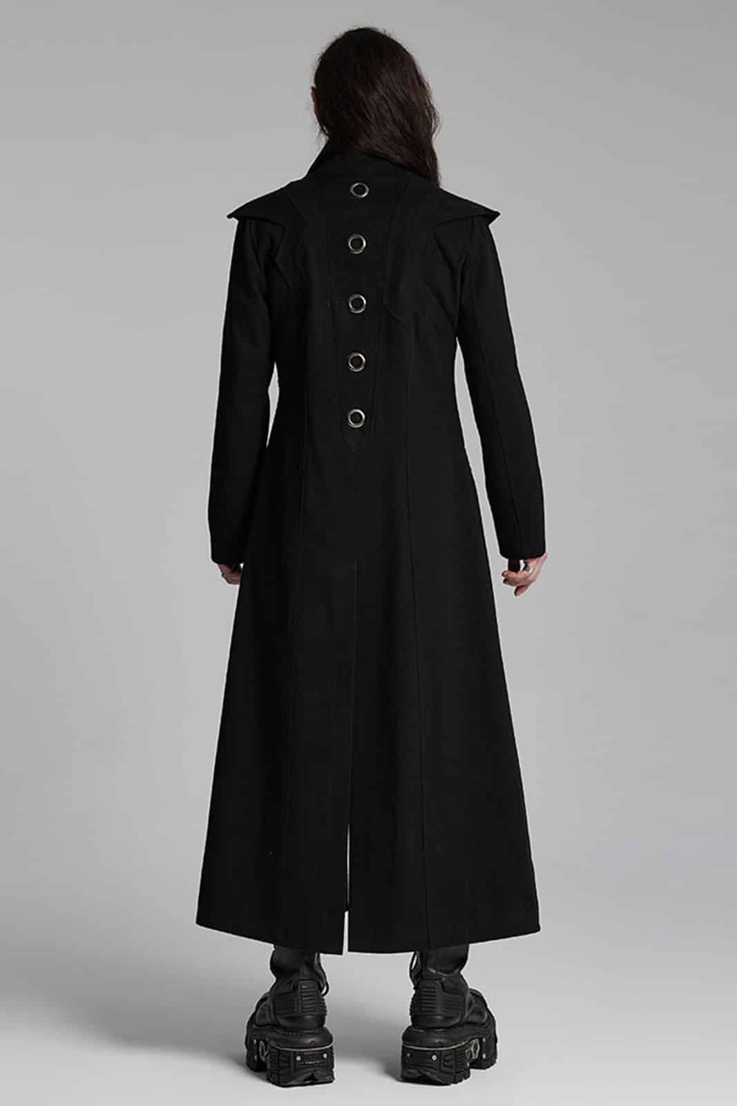 Der Startrek Coat vereint futuristisches Design mit dunkler Ästhetik und schafft mit seinem langen, taillierten Schnitt eine markante Silhouette. Geometrisch strukturierte Einsätze auf der Vorder- und Rückseite sorgen für Tiefe und Dimension, während kontrastierende, strukturierte Stoffe den kühnen, mehrschichtigen Look verstärken. Große Ösendetails sorgen für einen industriellen Touch und der spitze Kragen schärft das Gesamtdesign. Ein vorderer Reißverschluss sorgt für einen eleganten Verschluss, während der hintere Schlitz für Bewegungsfreiheit und Bewegungsfreiheit sorgt.