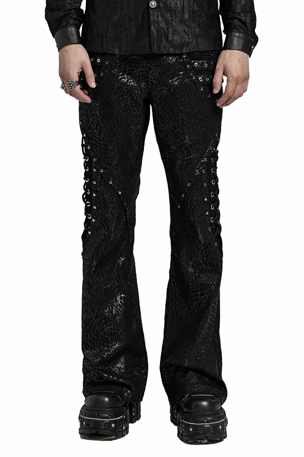 Unleash your dark cyberpunk side with these Xtraterrestrial pants, a perfect blend of edgy fashion and meticulous punk rave craftsmanship. These black pants are designed to make a bold statement with unique features. The side panels feature intricate lace-up detailing, accented with stud embellishments for a rebellious flair. The flared legs add a retro touch, reminiscent of classic old-school styles, while ensuring comfort and freedom of movement.