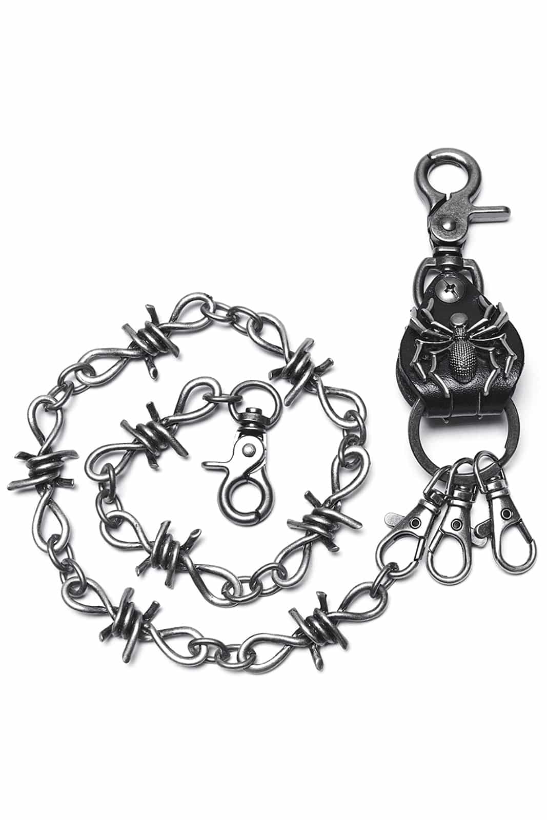 Diese markante Punk-Schlüsselkette kombiniert rohe Industrial-Ästhetik mit düsterem Gothic-Charakter. Die massive Kette im Stacheldraht-Design wirkt kompromisslos und rebellisch, während das detaillierte Spinnenmotiv am Ende einen unübersehbaren Akzent setzt. Robust, schwer und auffällig – perfekt als Keychain, Hosenkette oder Accessoire für Punk-, Gothic- und Industrial-Looks.
