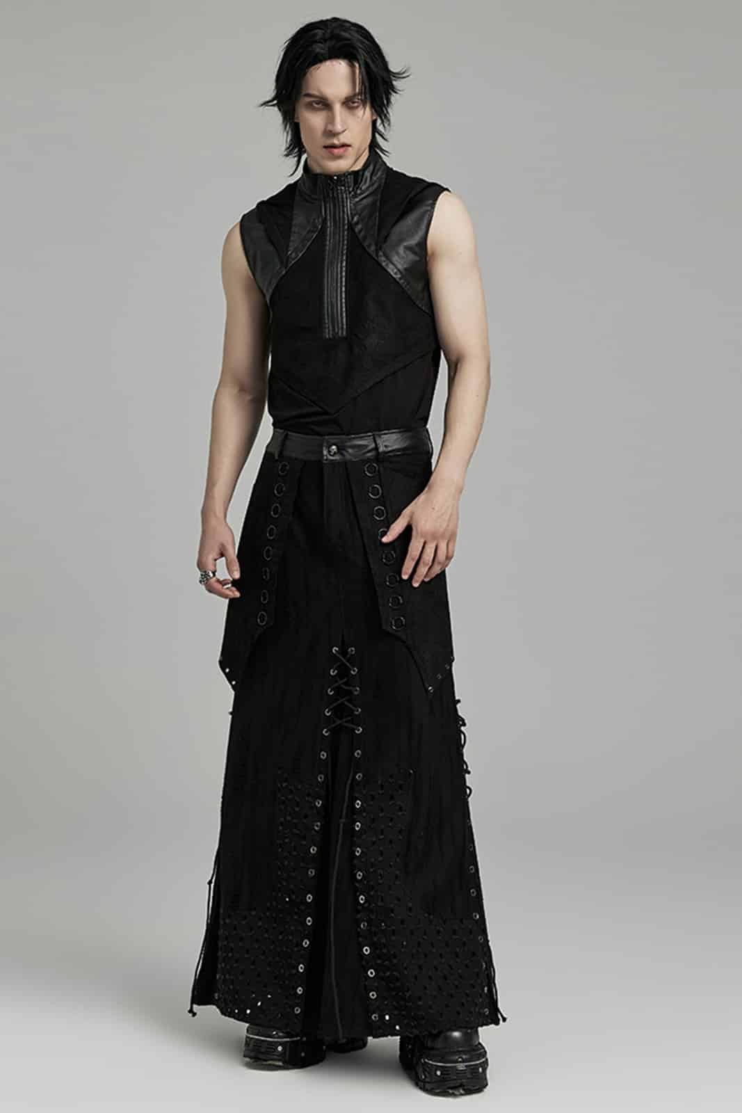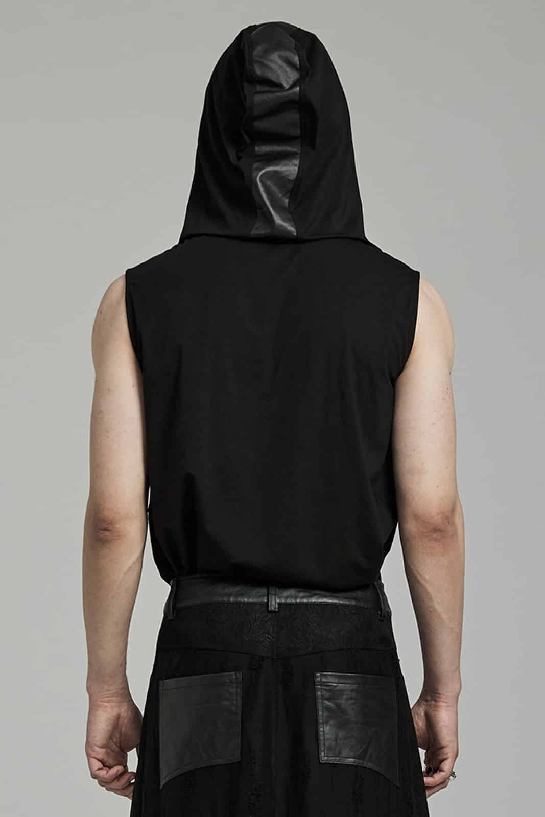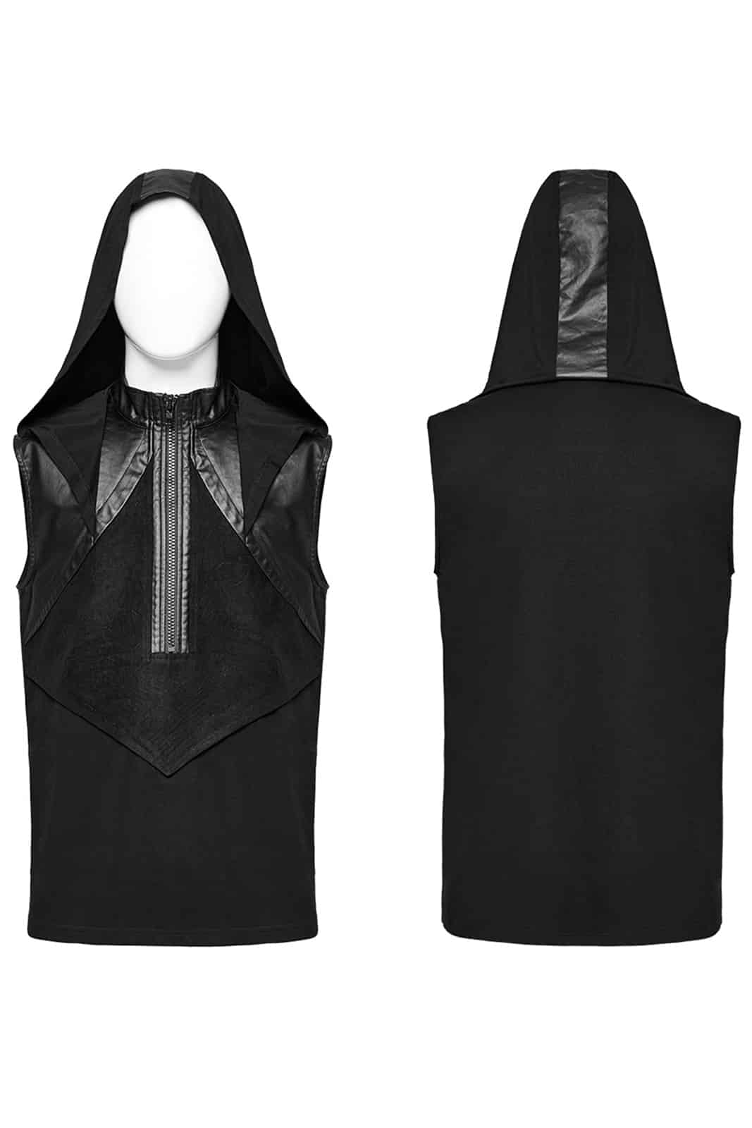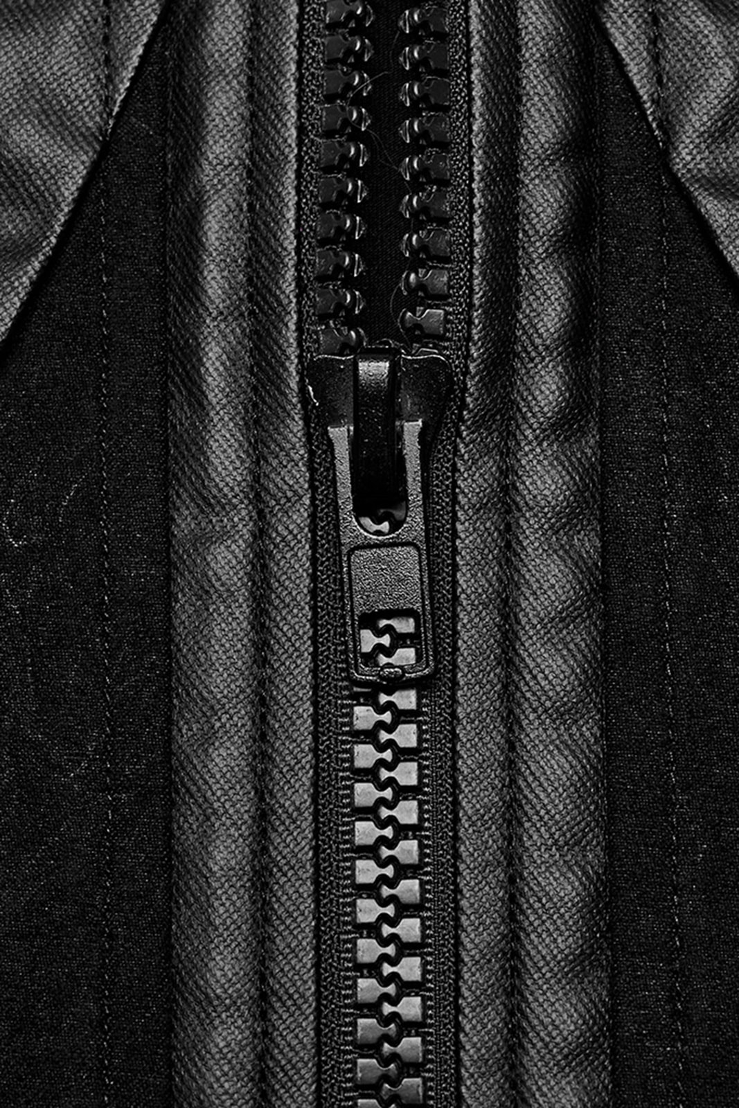 This sleeveless, fitted top made from a high-quality cotton blend combines a cyberpunk aesthetic with a dark, rebellious gothic twist. The geometric panel design creates a sharp, structured look, while contrasting fabrics – plain black jersey, embossed textures and faux leather – add depth and intrigue. The front zipper and stand collar provide both style and function, complemented by a large hood for added attitude.