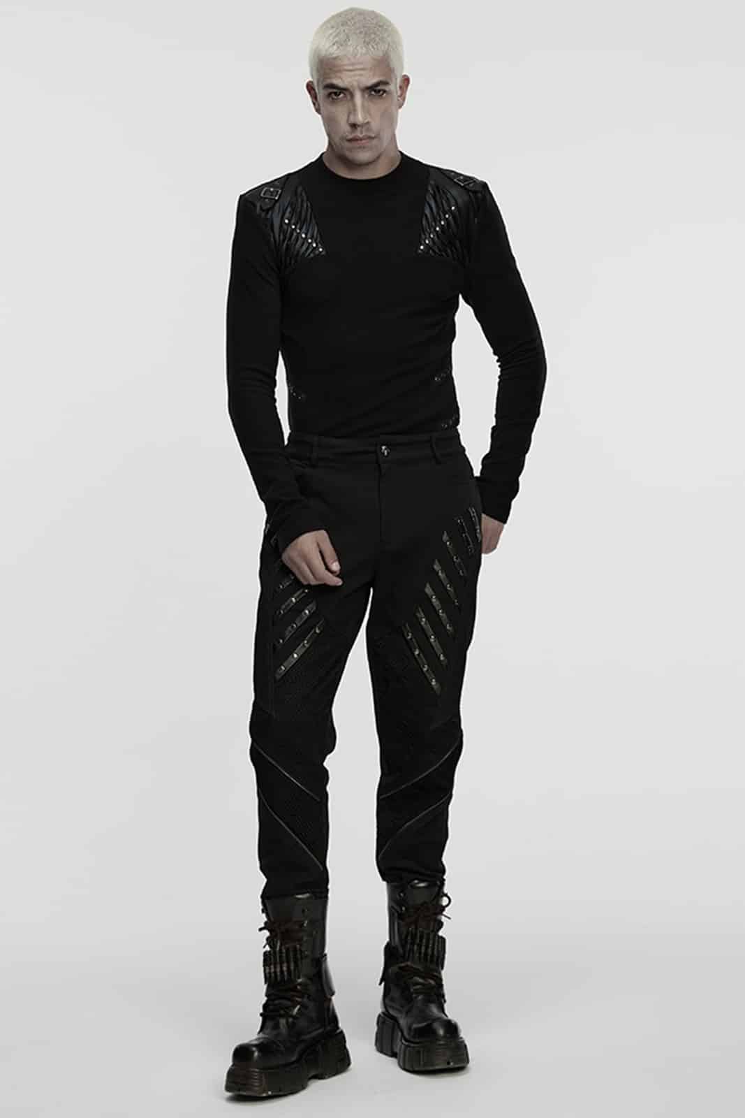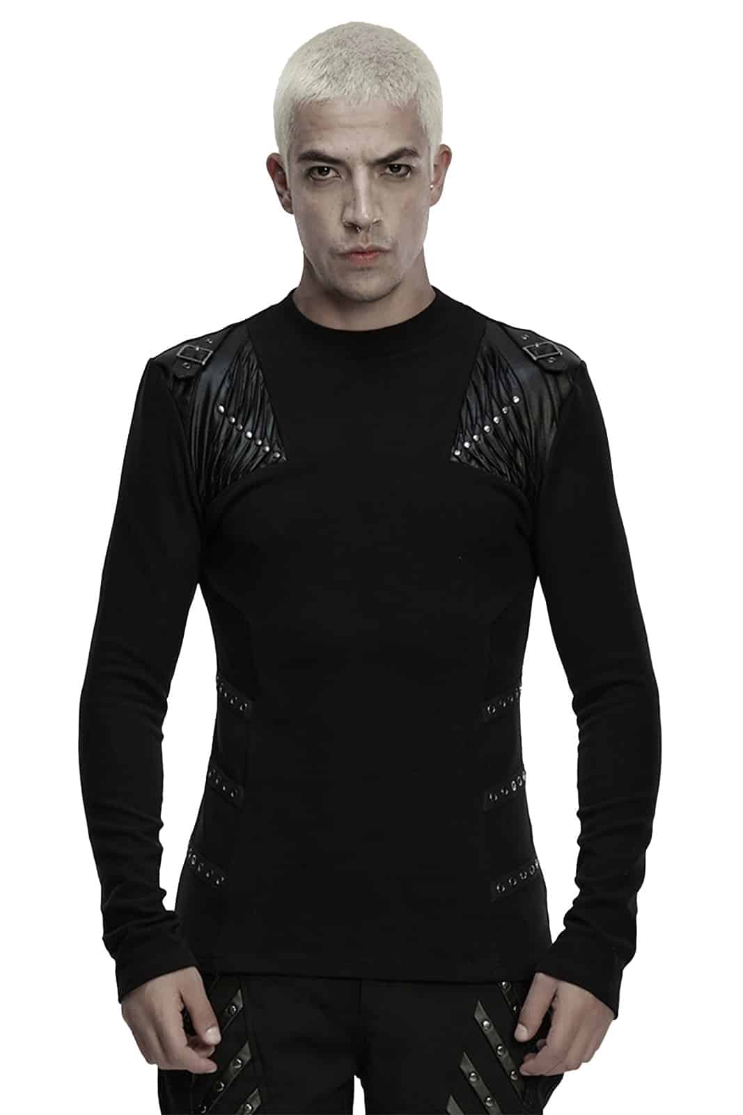 Dieses figurbetonte Gothic-Langarmtop für Herren verbindet klare Linien mit subtiler Raffinesse. Die strukturierenden Pintuck-Falten im oberen Brustbereich und die beschichteten Einsätze in Lederoptik setzen gezielte Akzente, während dezente Nieten und Riemendetails dem Design eine elegante Industrial-Note verleihen. Ein vielseitiges Essential für moderne Gothic- und Darkwear-Looks.