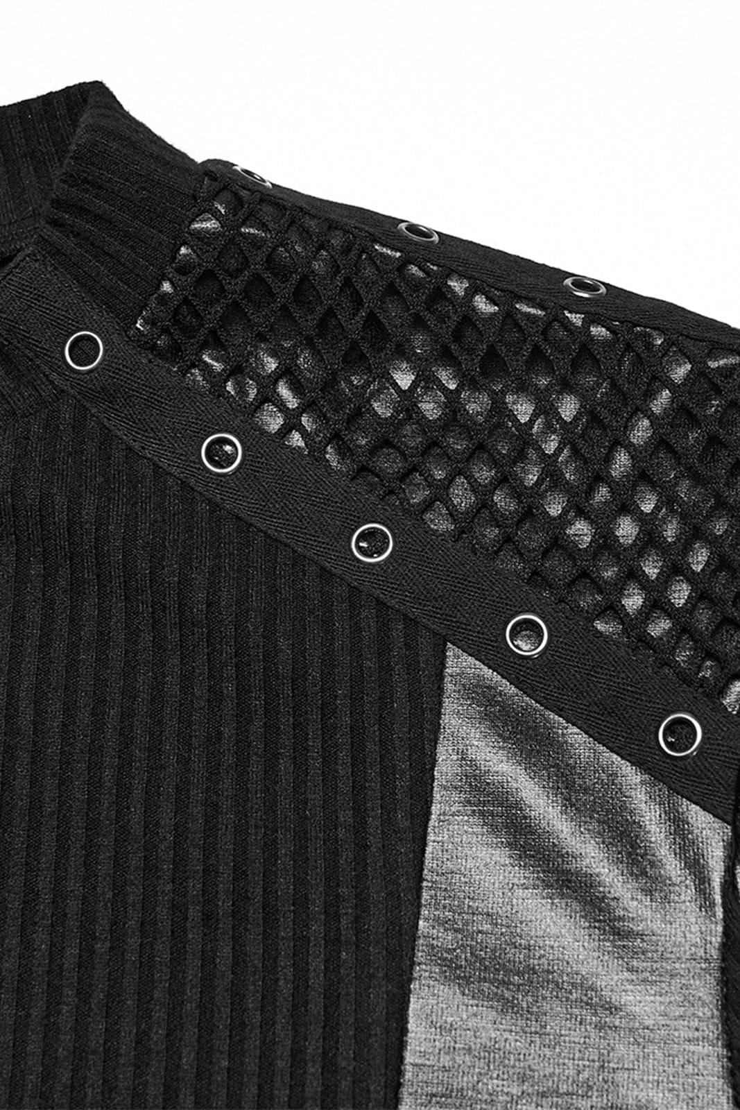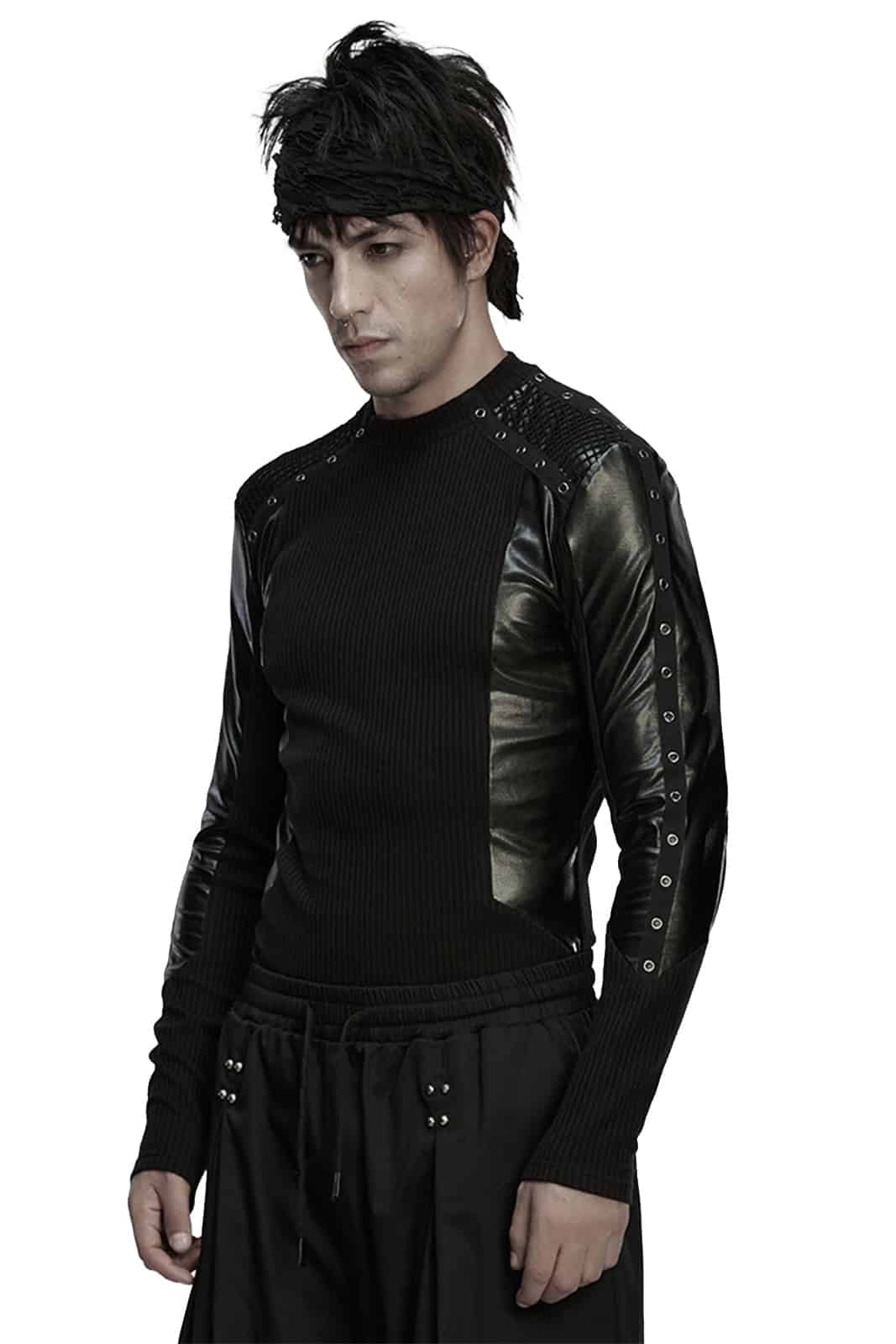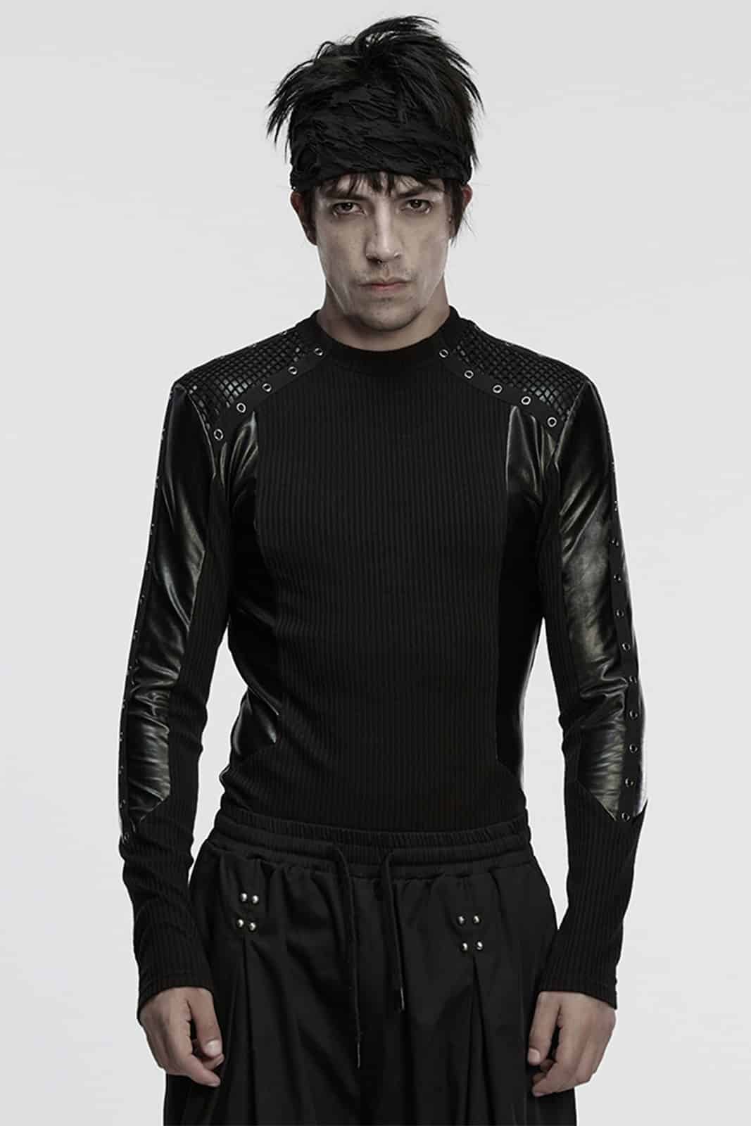 Dieses langärmlige Gothic-Top für Herren kombiniert eine klare, körpernahe Silhouette mit markanten Materialkontrasten. Der gerippte Jersey sorgt für eine strukturierte Basis, während Einsätze in Lederoptik und Mesh an Schultern und Ärmeln eine düstere, moderne Industrial-Note setzen. Ein starkes Essential für Gothic-, Industrial- oder Darkwear-Looks mit Charakter.