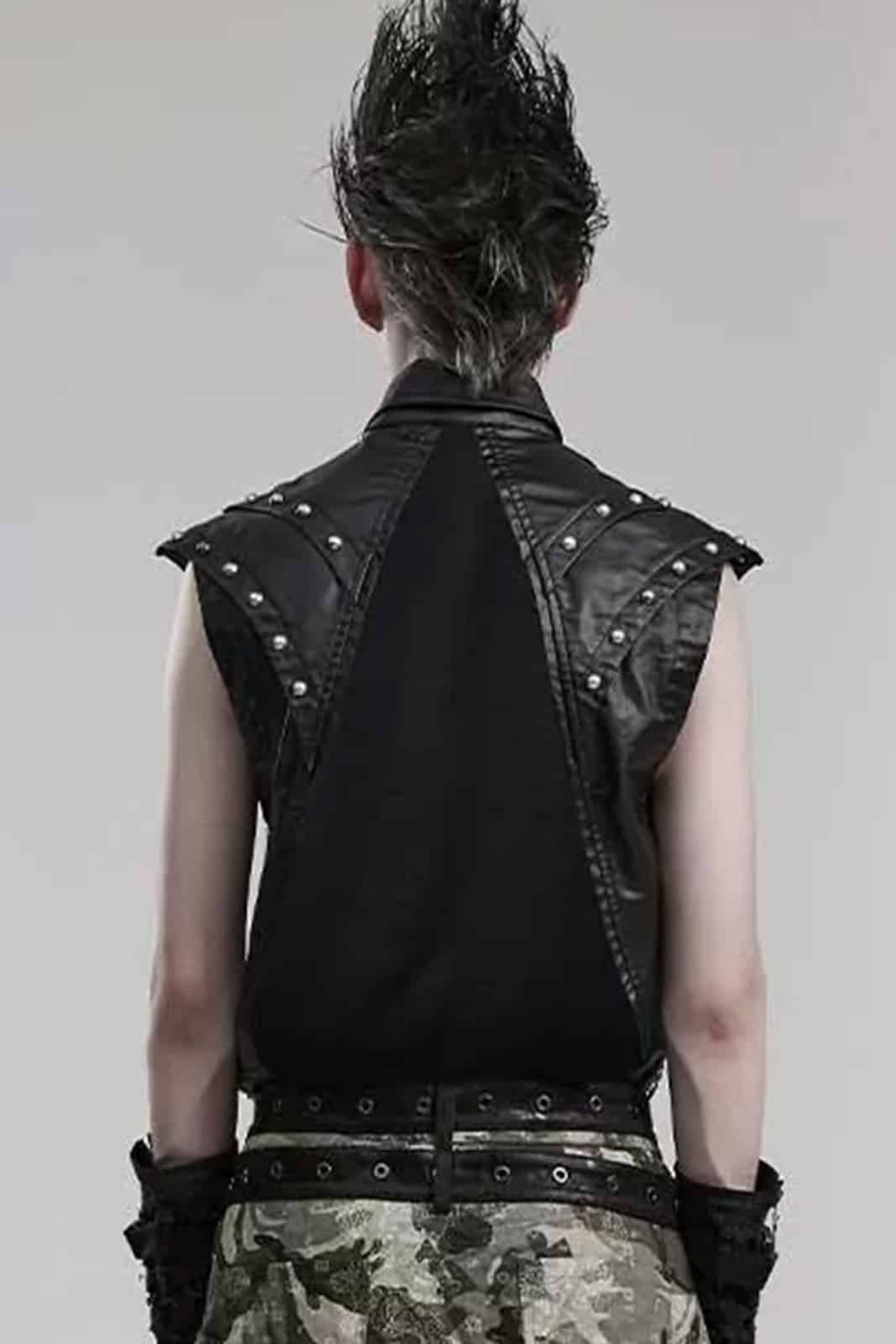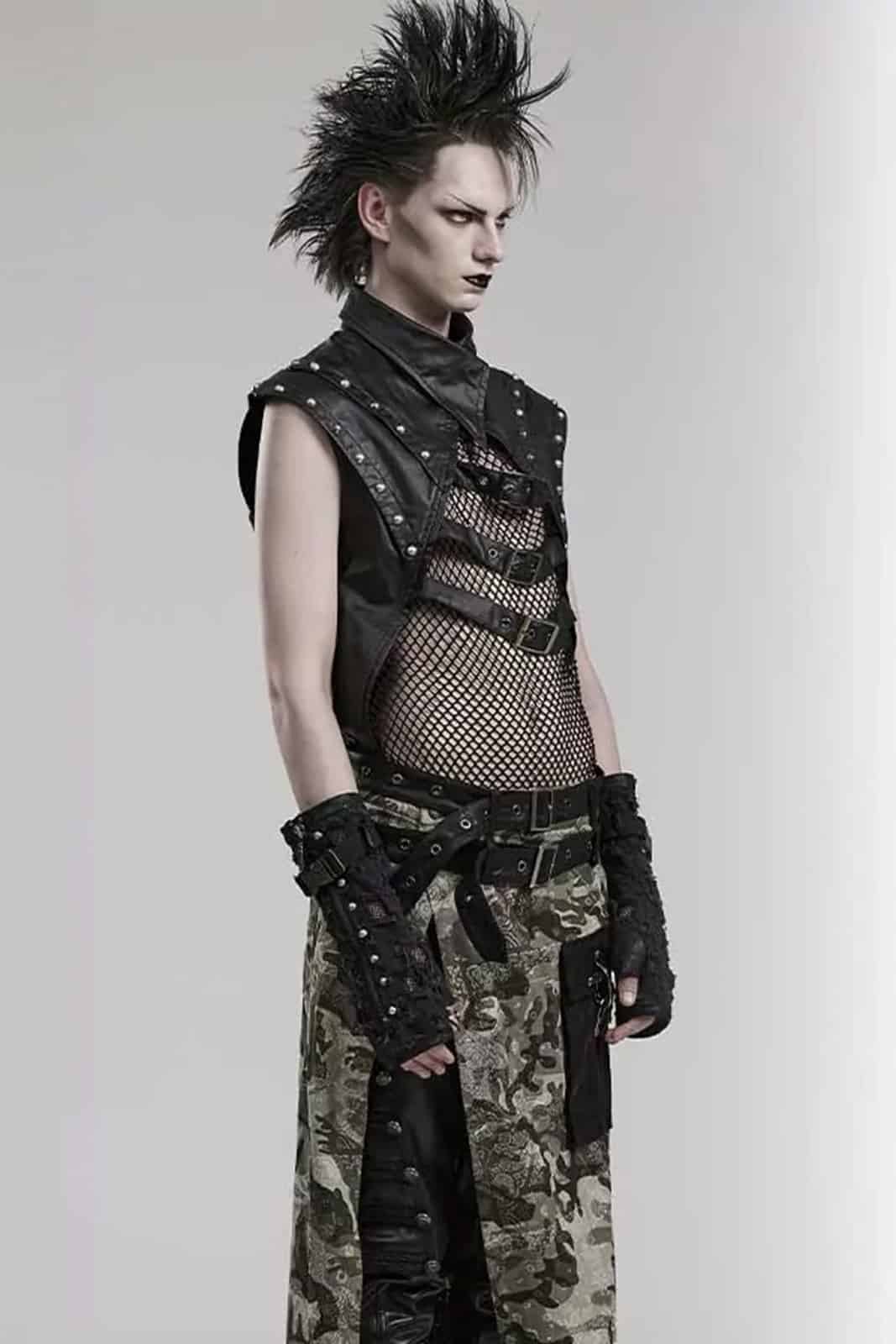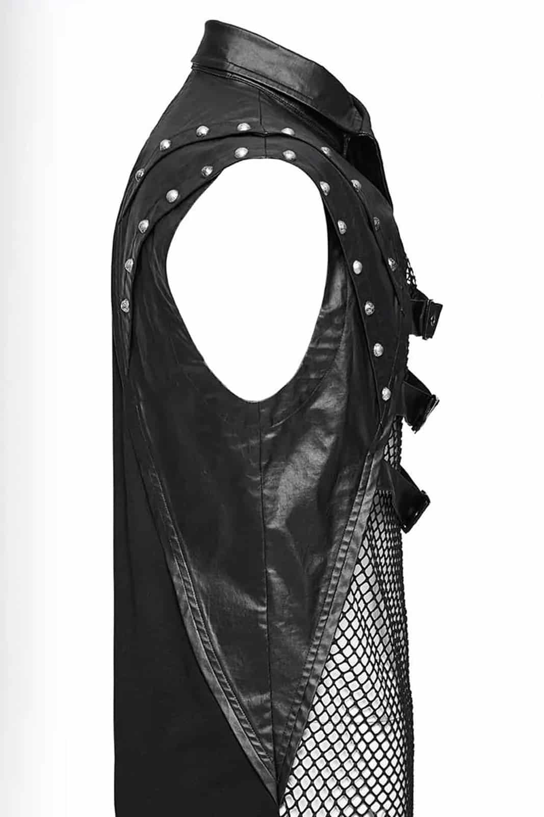 Ärmelloses Oberteil im taillierten Schnitt mit schwarzer Mesh-Vorderseite und gestrickter Jersey-Rückseite. Bestückt mit Kunstlederdetails und nietenbesetzten Schnallenriemen.