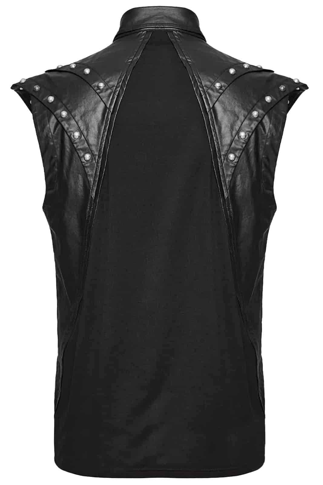 Sleeveless top in a fitted cut with a black mesh front and knitted jersey back. Trimmed with faux leather details and studded buckle straps.