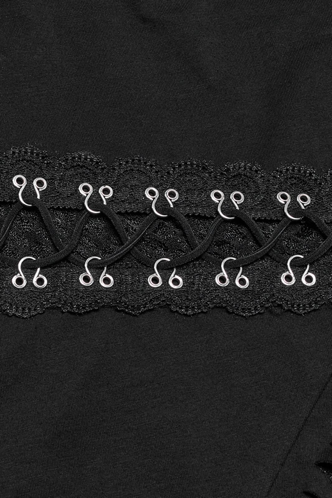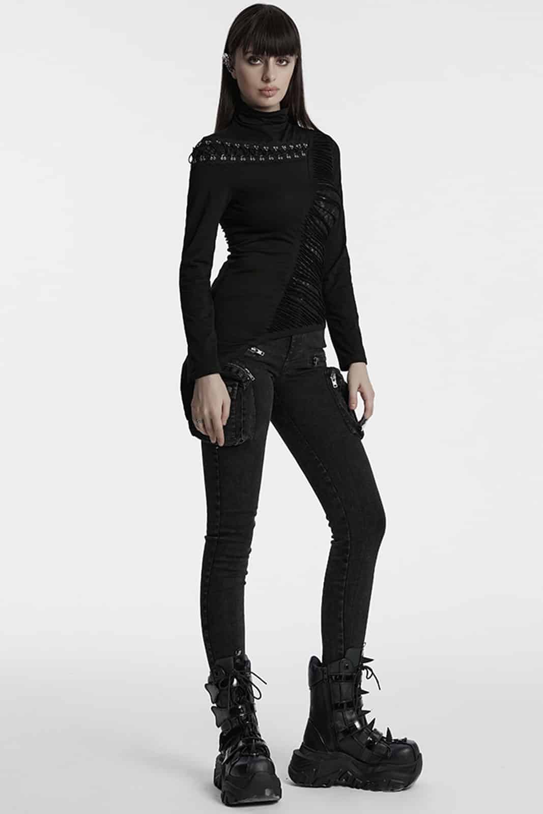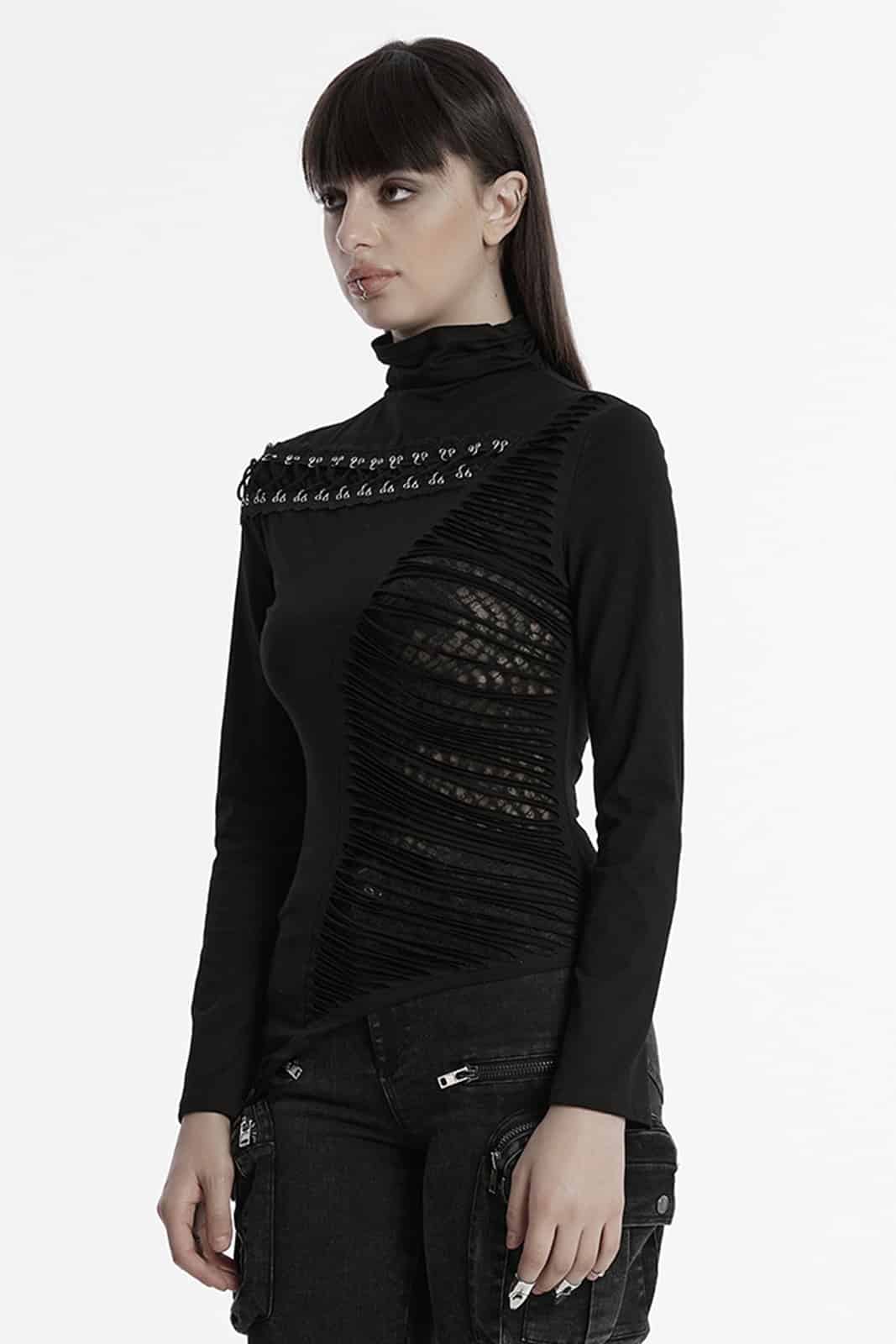 Das Murderdoll Top von Punk Rave ist ein figurbetontes Gothic-Top mit auffälligen Details und asymmetrischem Design. Mit seinem tiefen V-Ausschnitt, Schnürungen und zerrissenen Akzenten verkörpert es eine düstere, zugleich verführerische Ästhetik. Gefertigt aus einem elastischen Baumwollmix, bietet es sowohl Komfort als auch eine schmeichelhafte Passform.