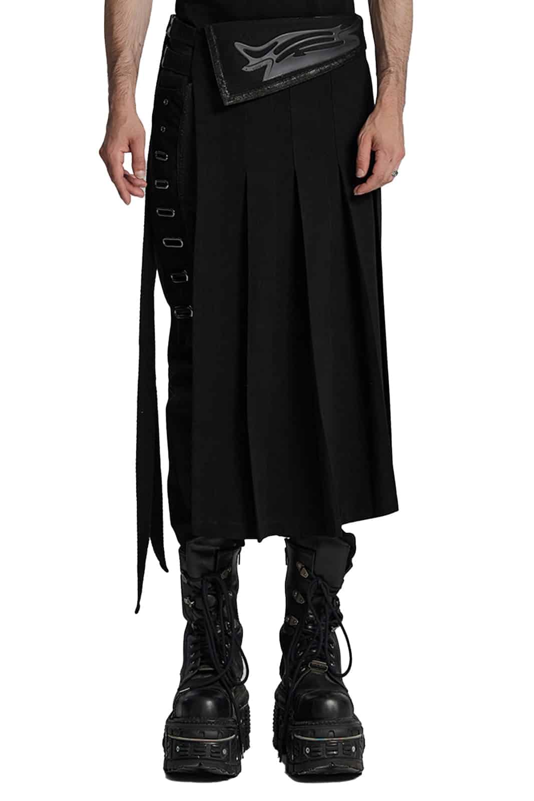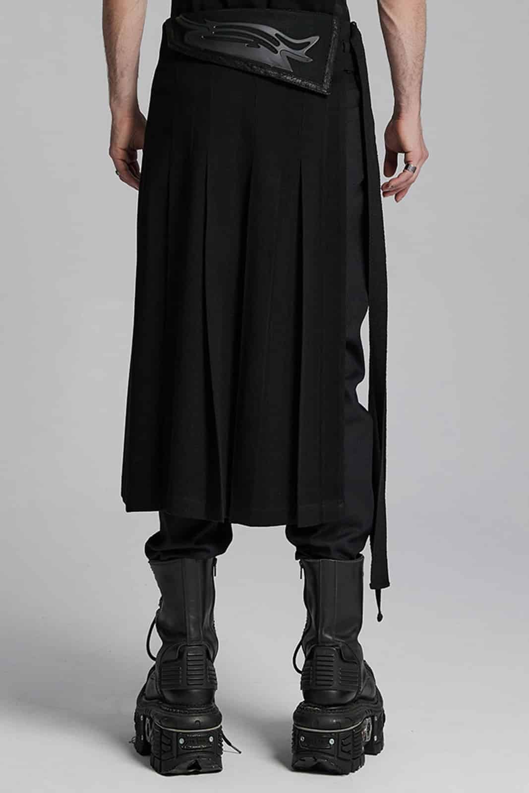 Postapokalyptischer Überrockaus festem Stoff mit offener Seite. Mittels zwei verstellbaren Klick-Schnallen wird der Rock schnell An- und Ausgezogen. Ein besonderes Merkmal ist die mit Kunstleder bestückte Lasche an der Vorder- und Rückseite im Cyberpunk-Stil.