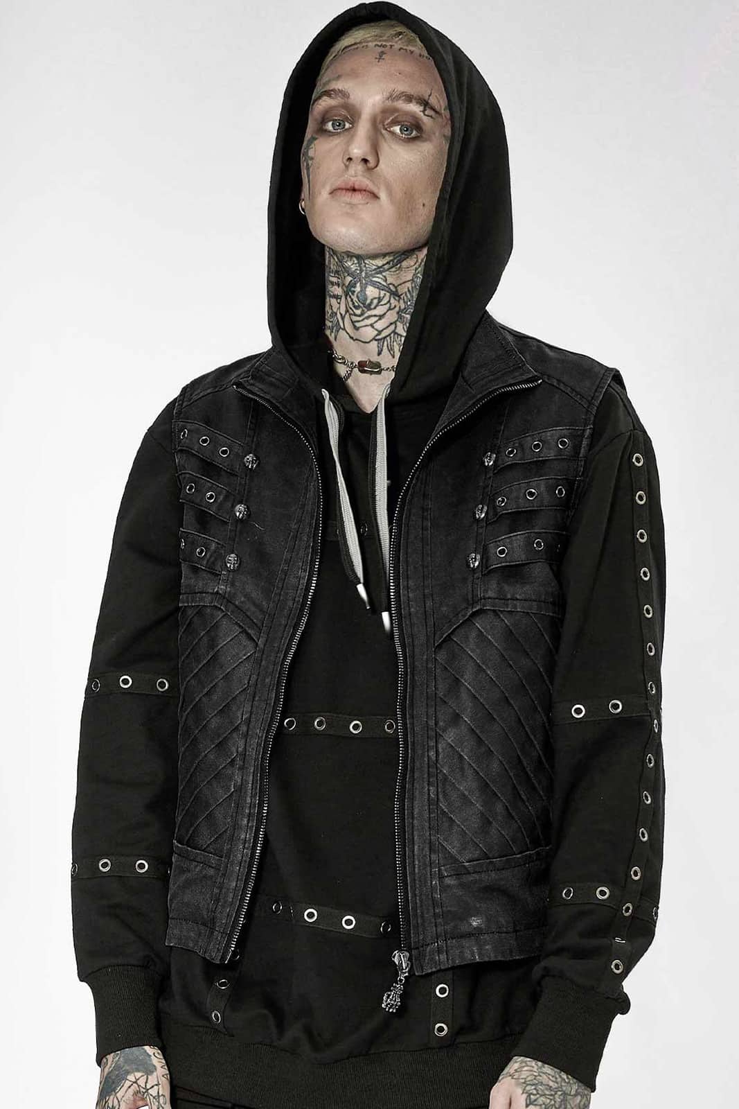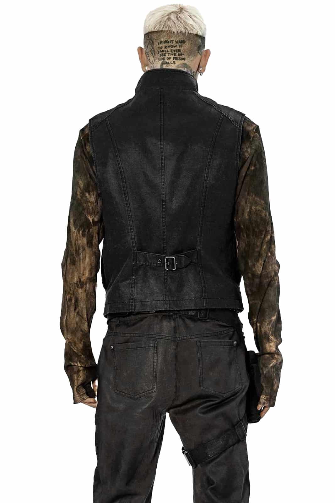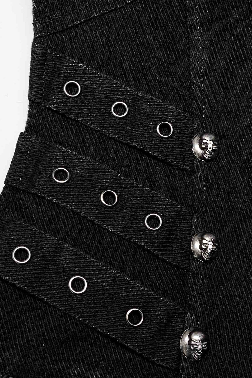 Post-apocalyptic denim vest made of pure cotton in a slightly weathered look. With front zip and skull decorations. Equipped with high neck and back strap with buckle. Side with pockets.