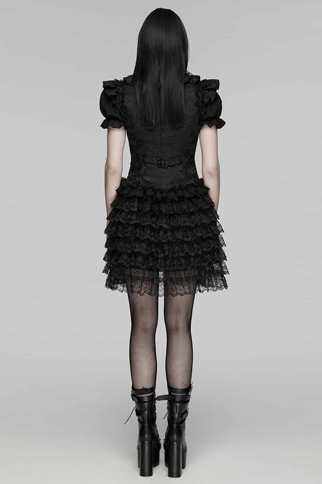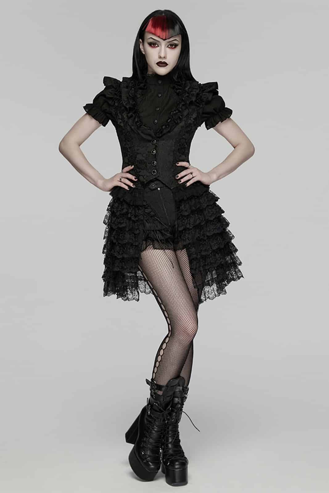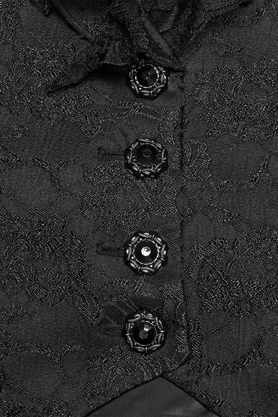 Romantisch, detailverliebt und mit dunkler Eleganz – die „Faerie Doll Vest“ vereint viktorianische Ästhetik mit moderner Gothic Attitude. Strukturierter Jacquard trifft auf verspielte Rüschen und sorgt für einen außergewöhnlichen, femininen Look mit Tiefe.